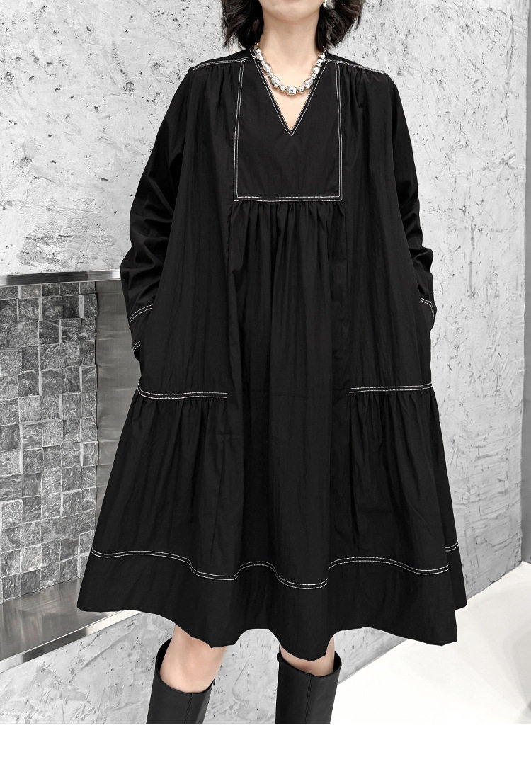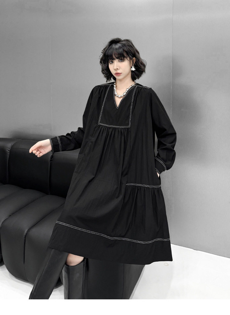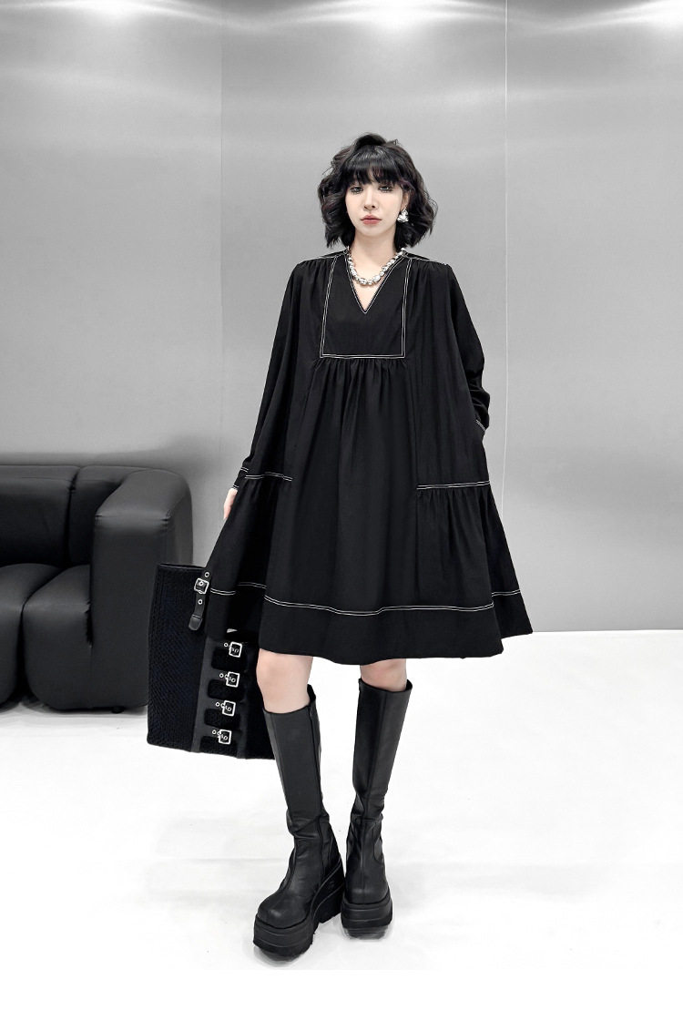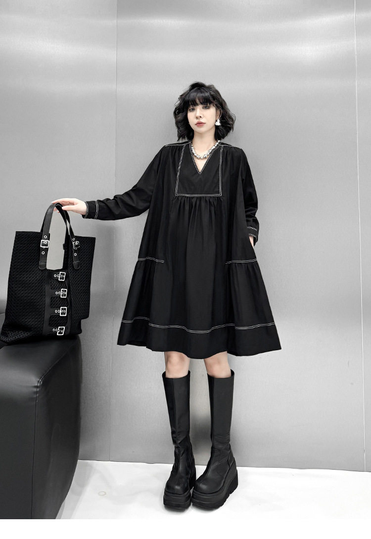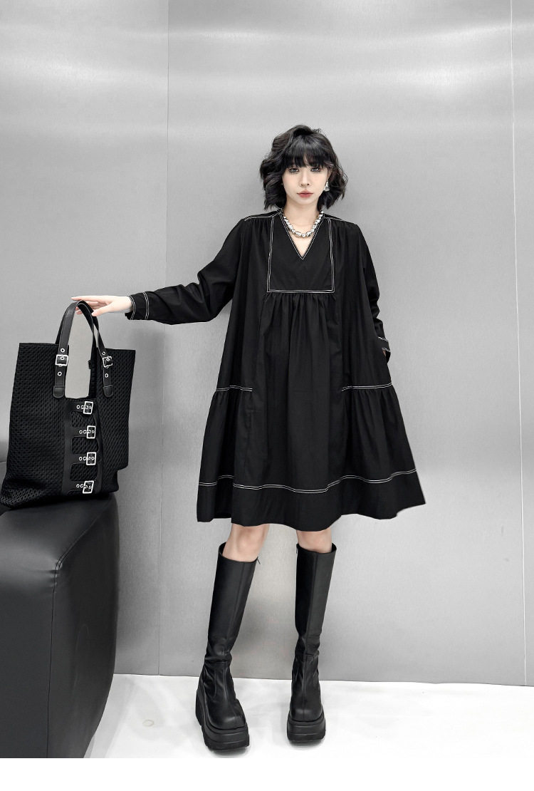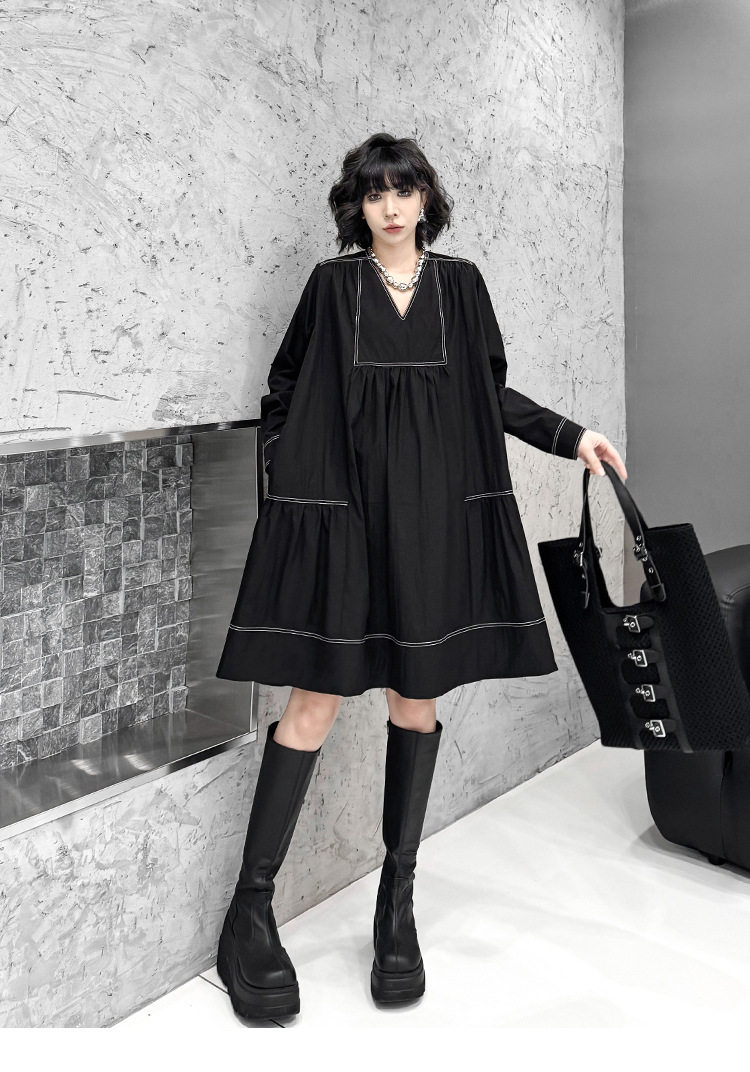 【商品名】【ワンピース】新作 おしゃれ ゆったり ステッチ入り Vネック Aライン ショート丈長袖ワンピース【AHシリーズ】