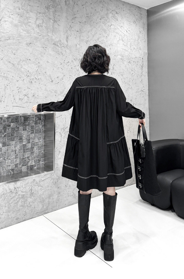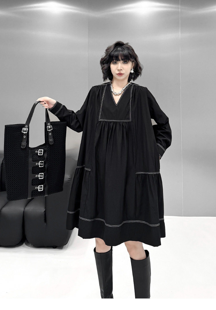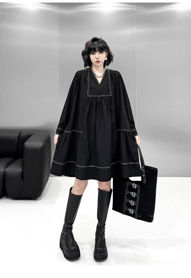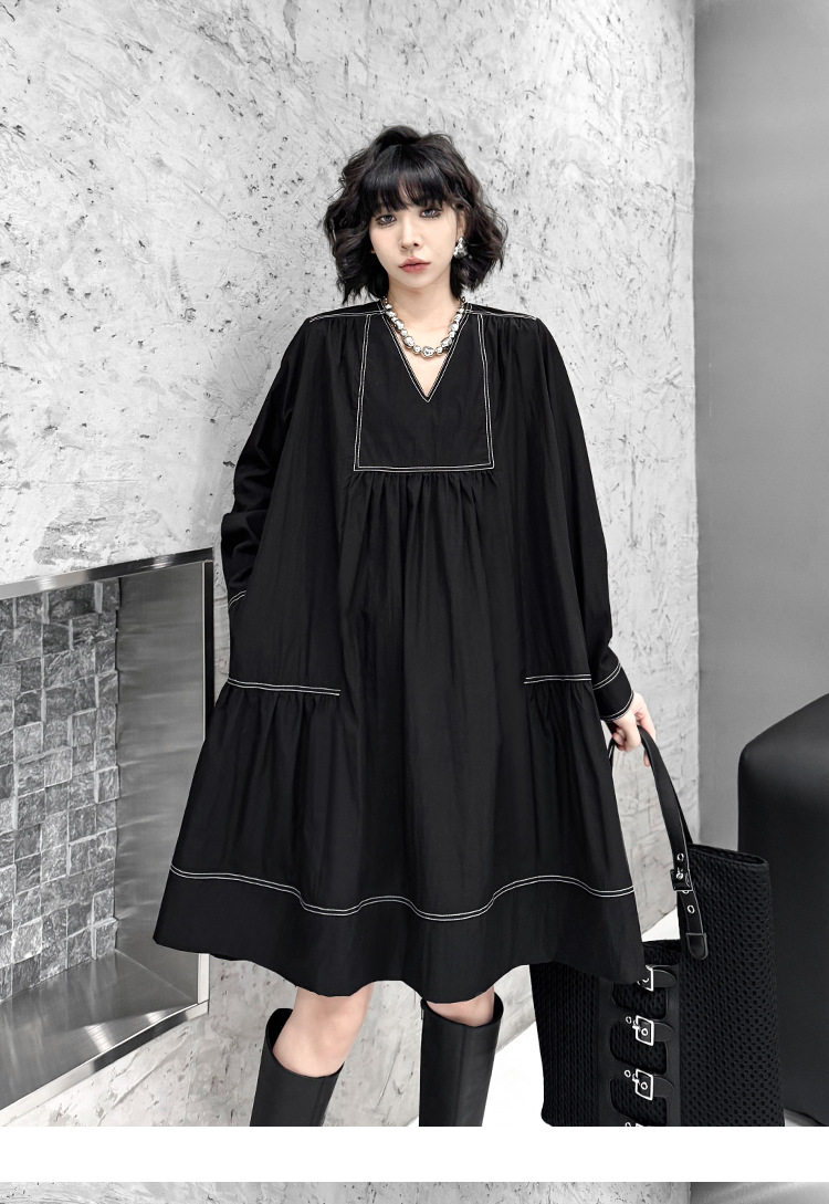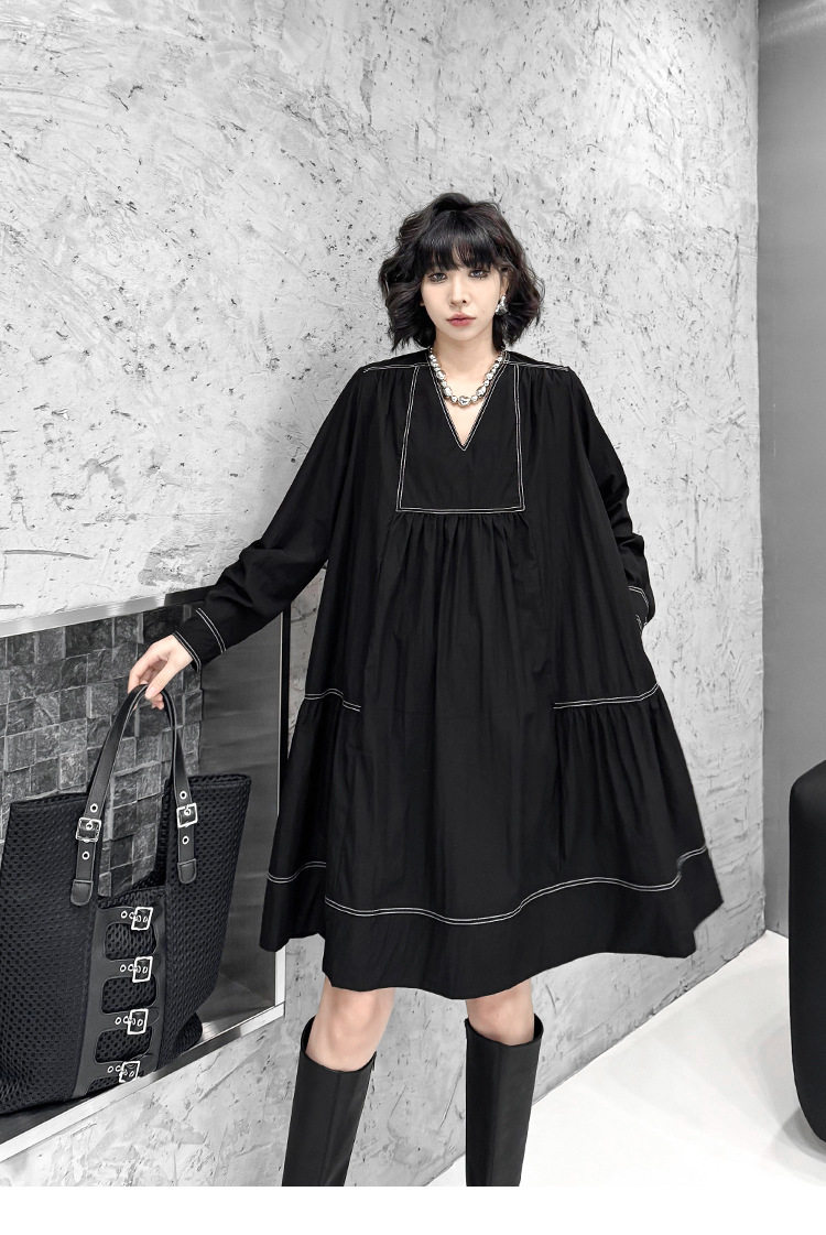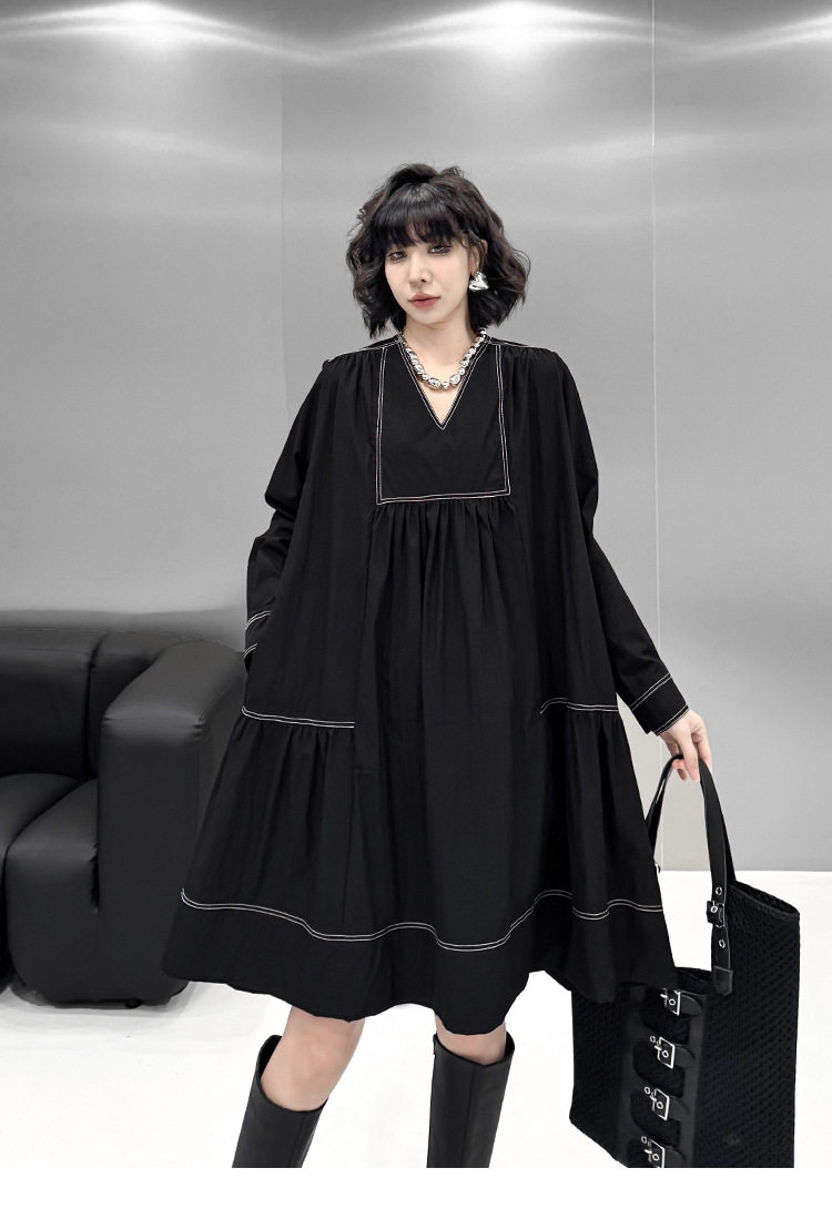 【商品名】【ワンピース】新作 おしゃれ ゆったり ステッチ入り Vネック Aライン ショート丈長袖ワンピース【AHシリーズ】