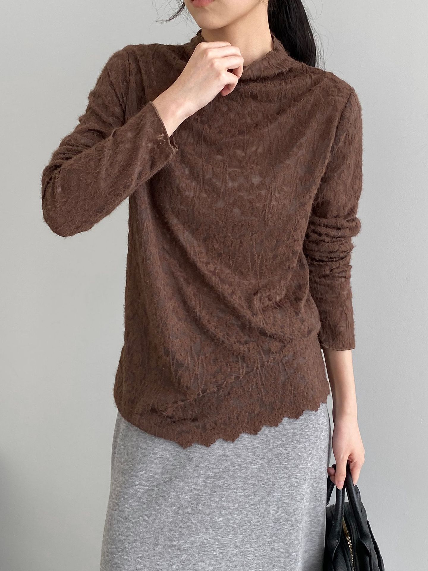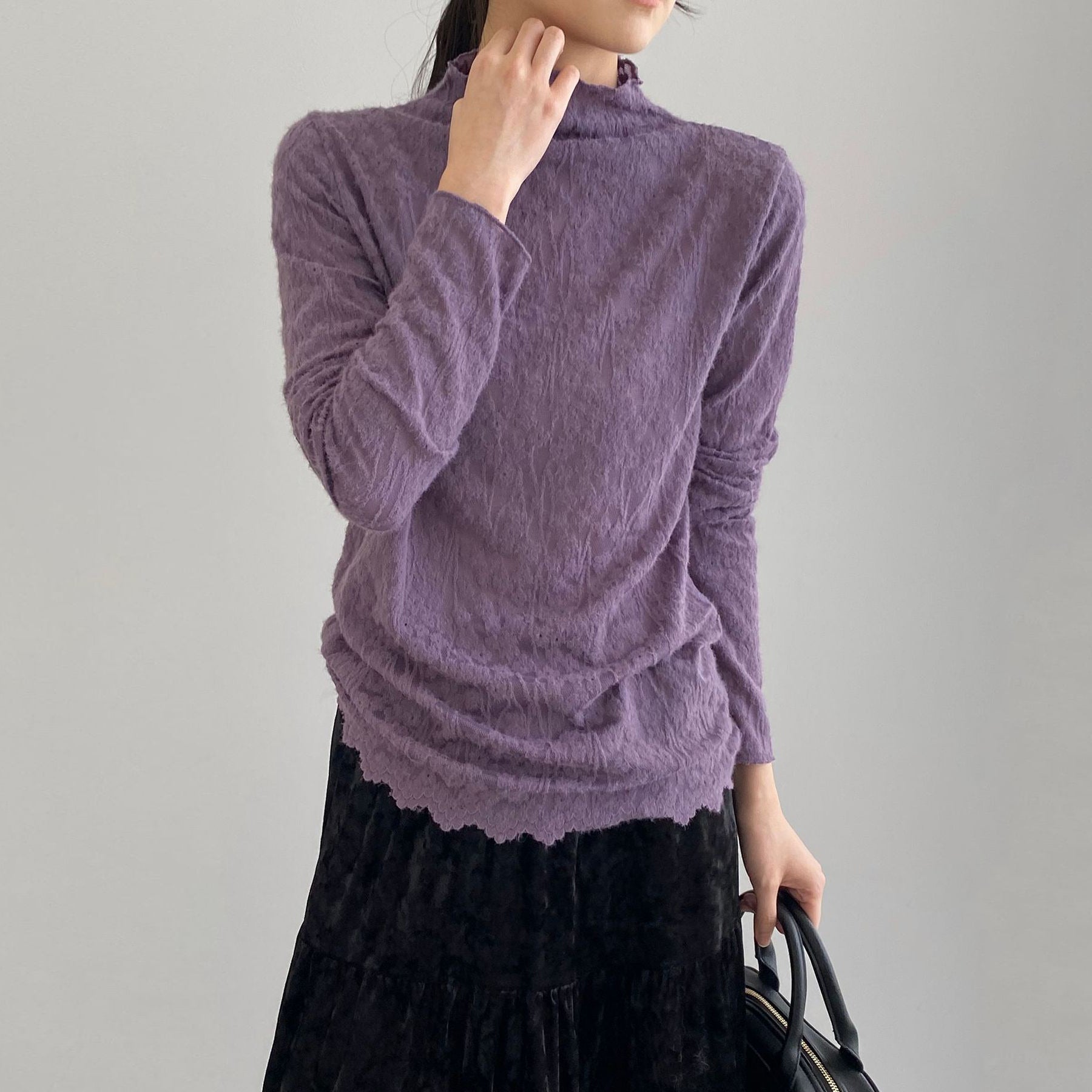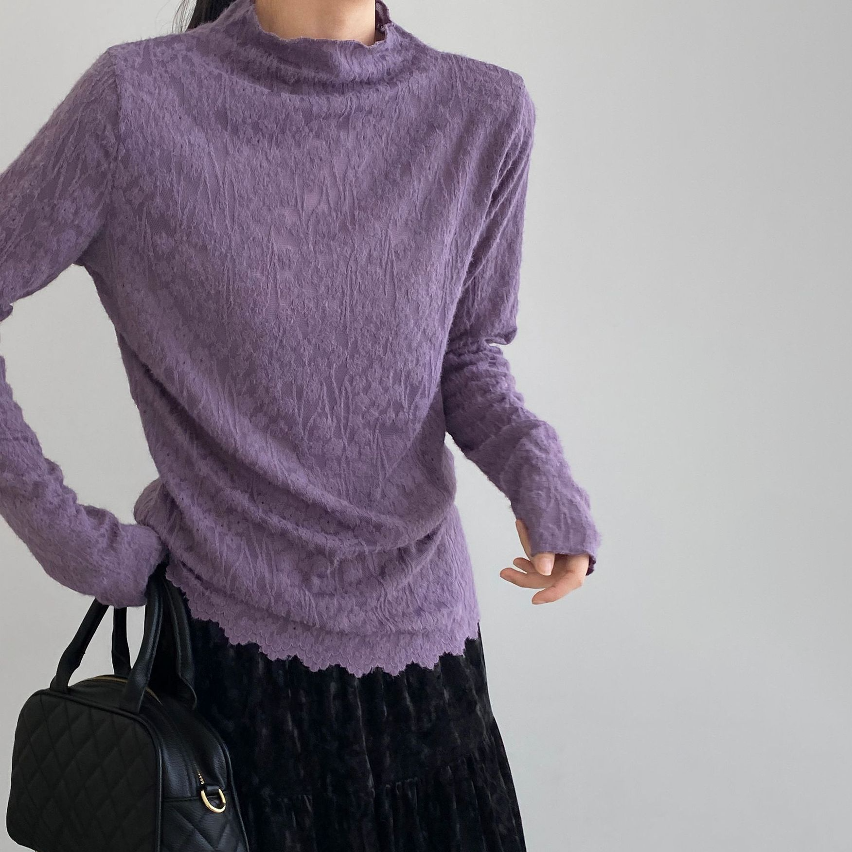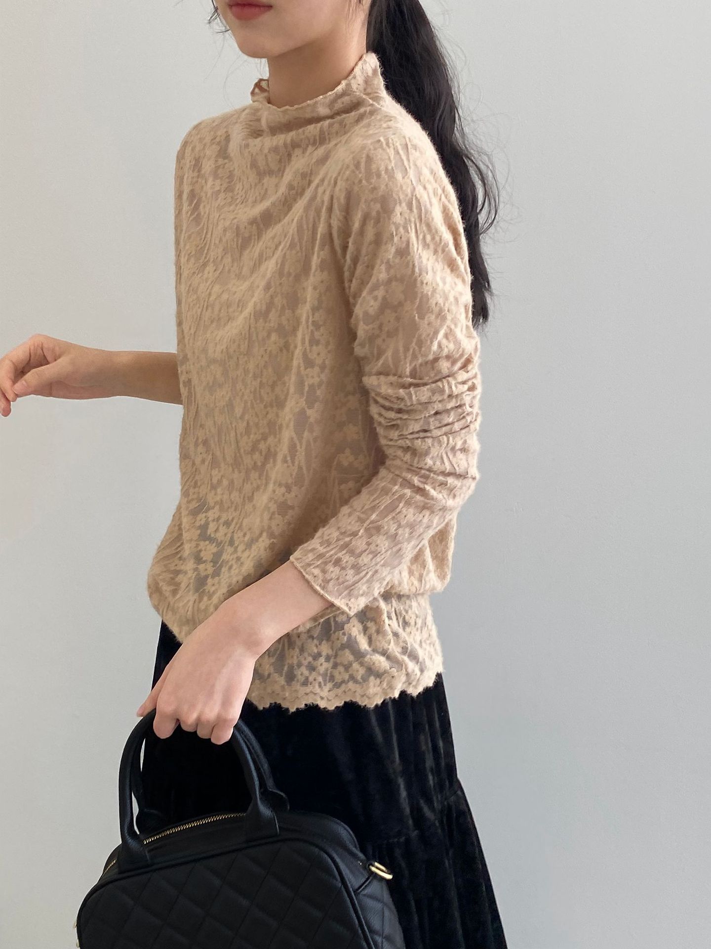5カラー【トップス】韓国風オフィスカジュアル 大人可愛い レースインナー レディース ハーフハイネック テクスチャー感 Tシャツ【JZシリーズ】