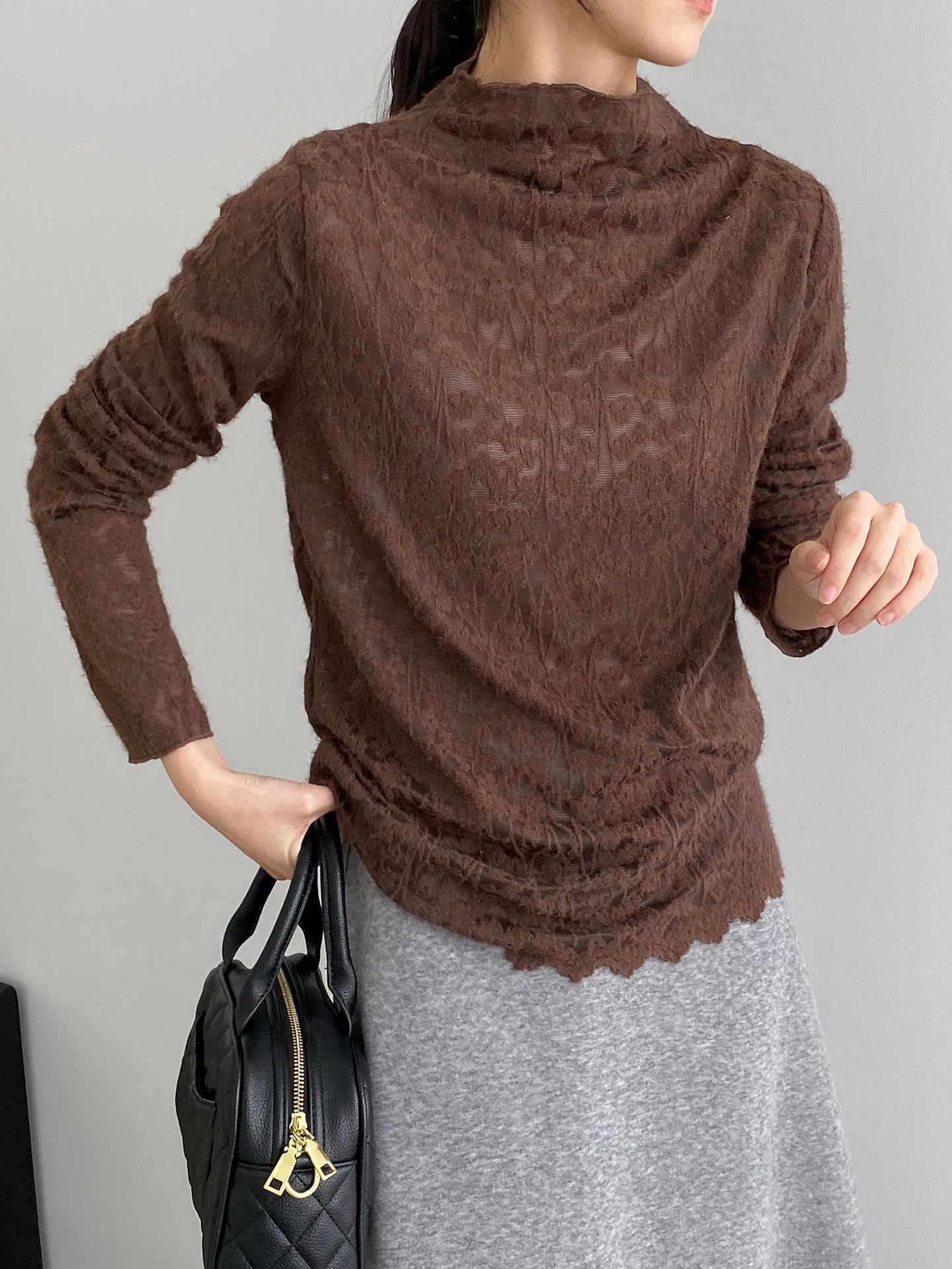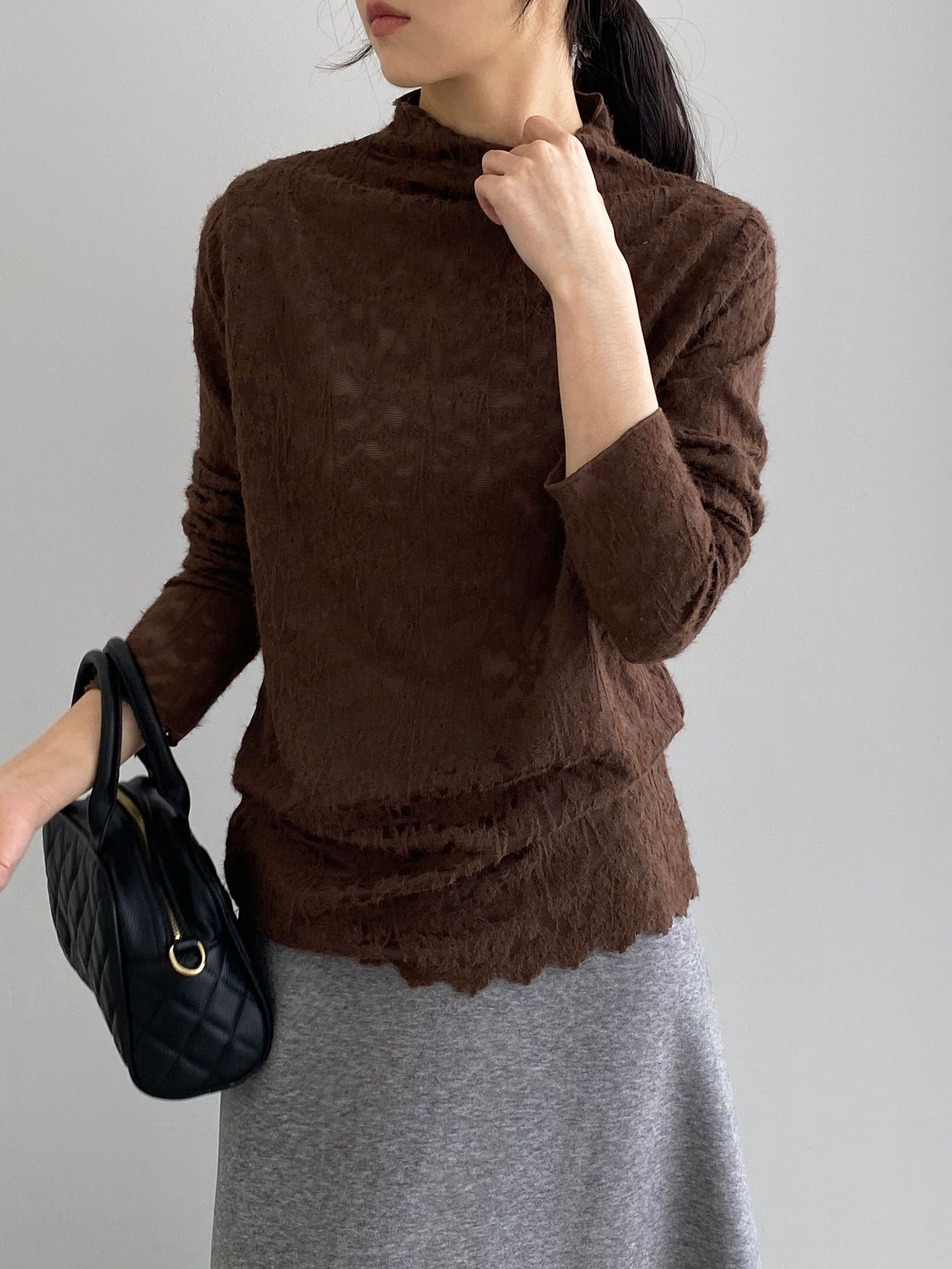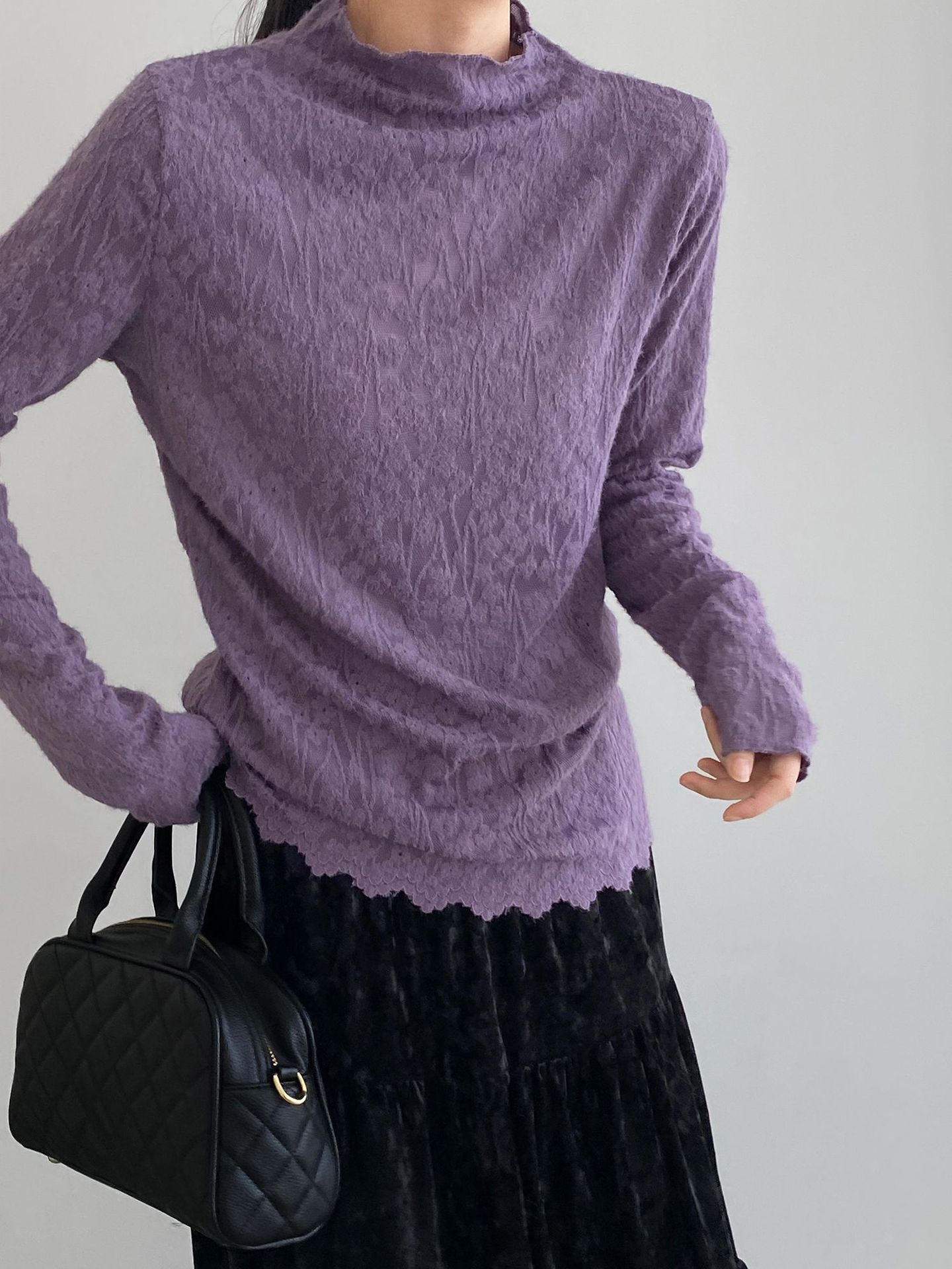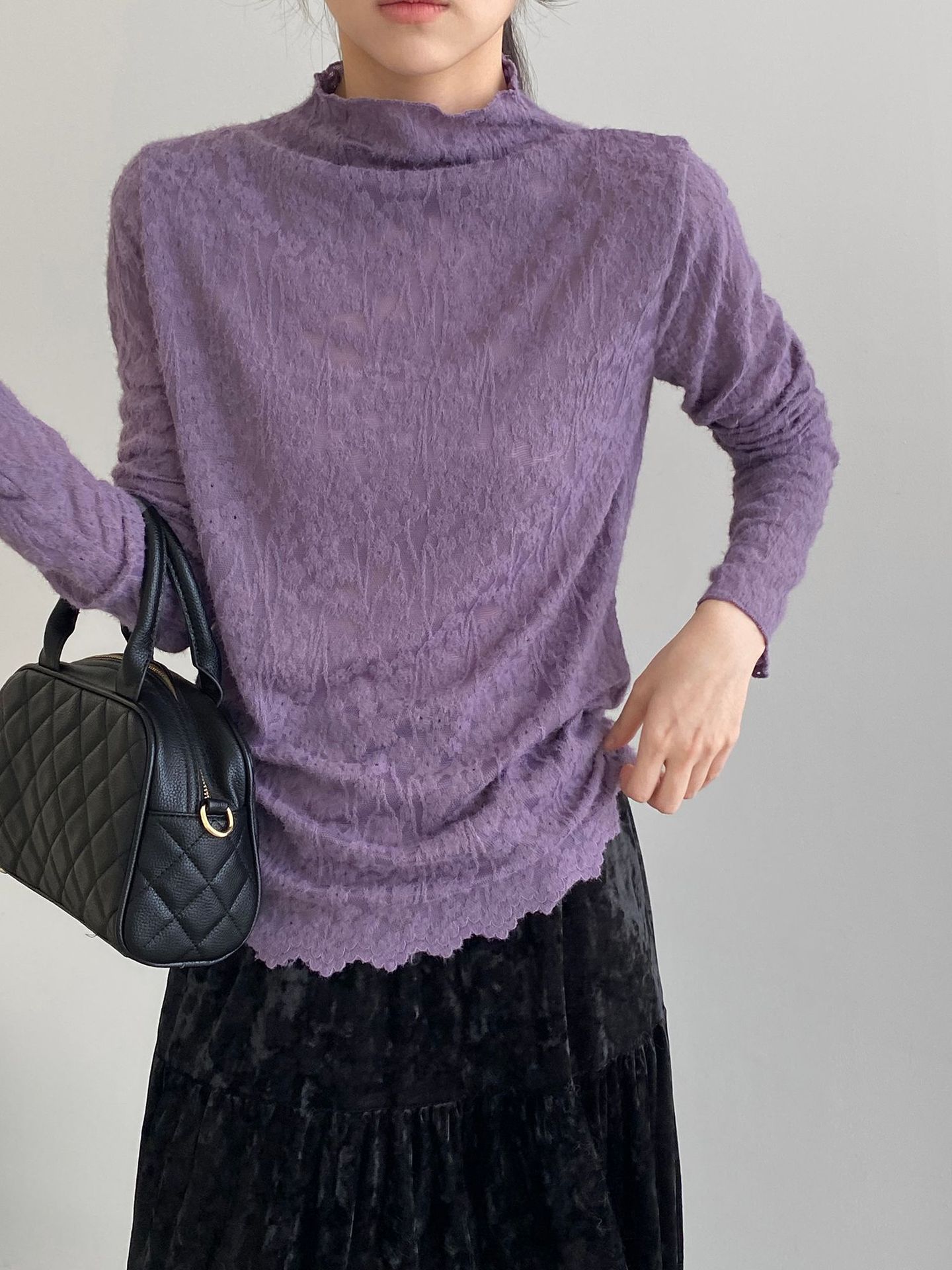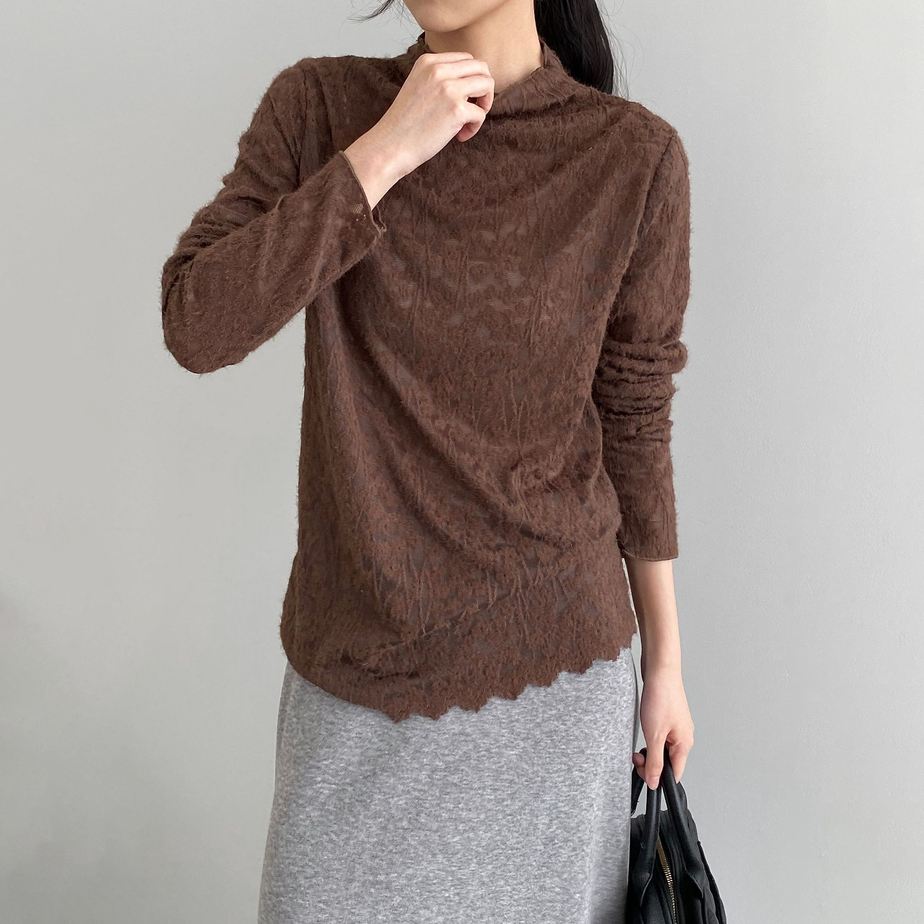 5カラー【トップス】韓国風オフィスカジュアル 大人可愛い レースインナー レディース ハーフハイネック テクスチャー感 Tシャツ【JZシリーズ】