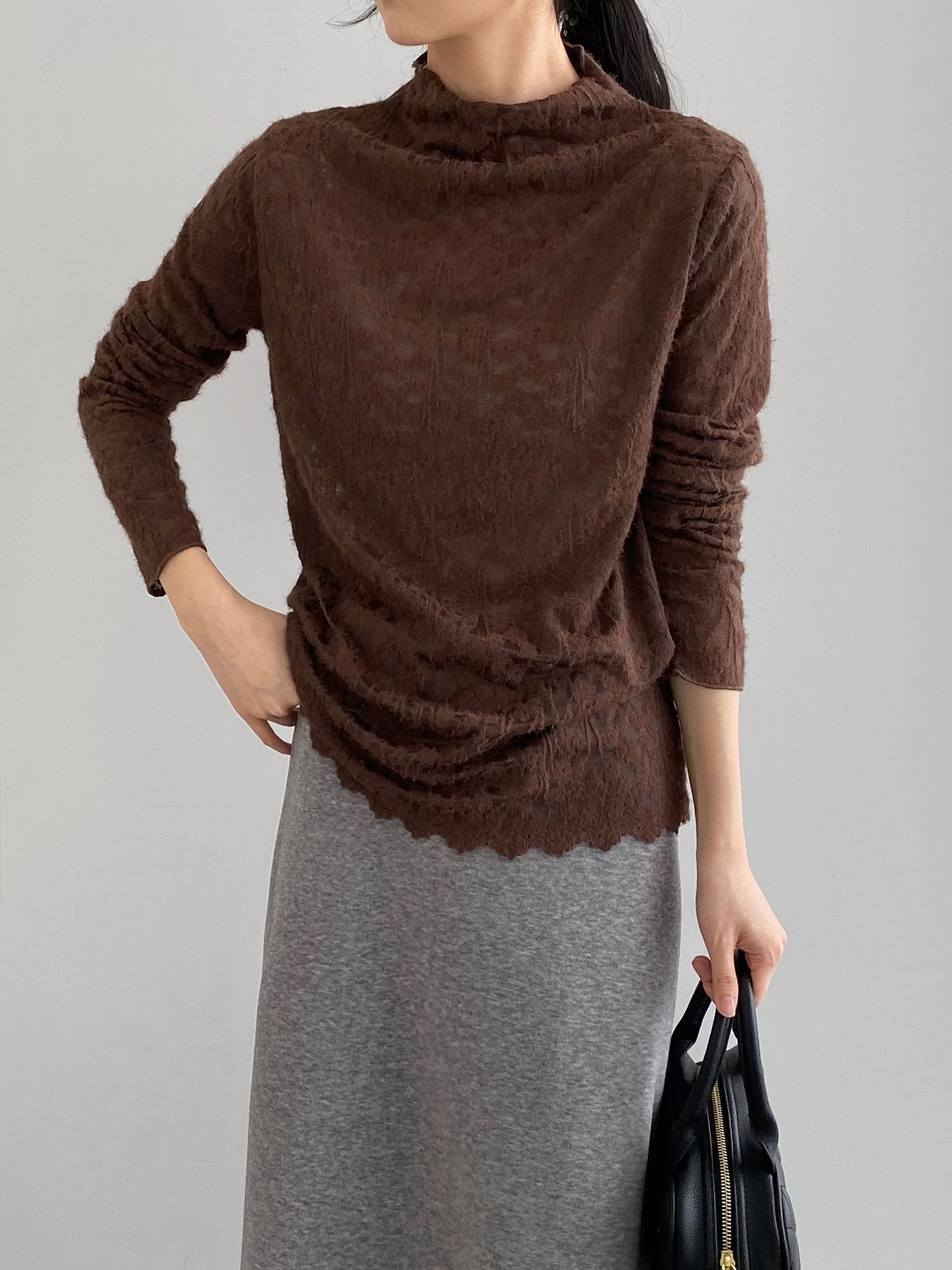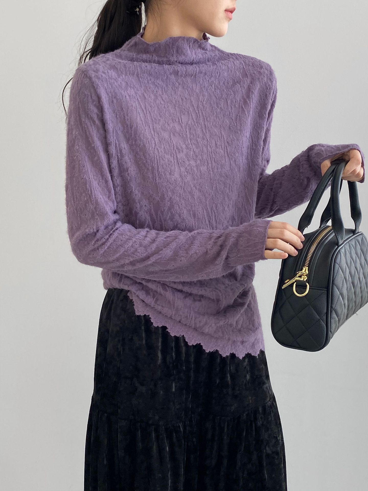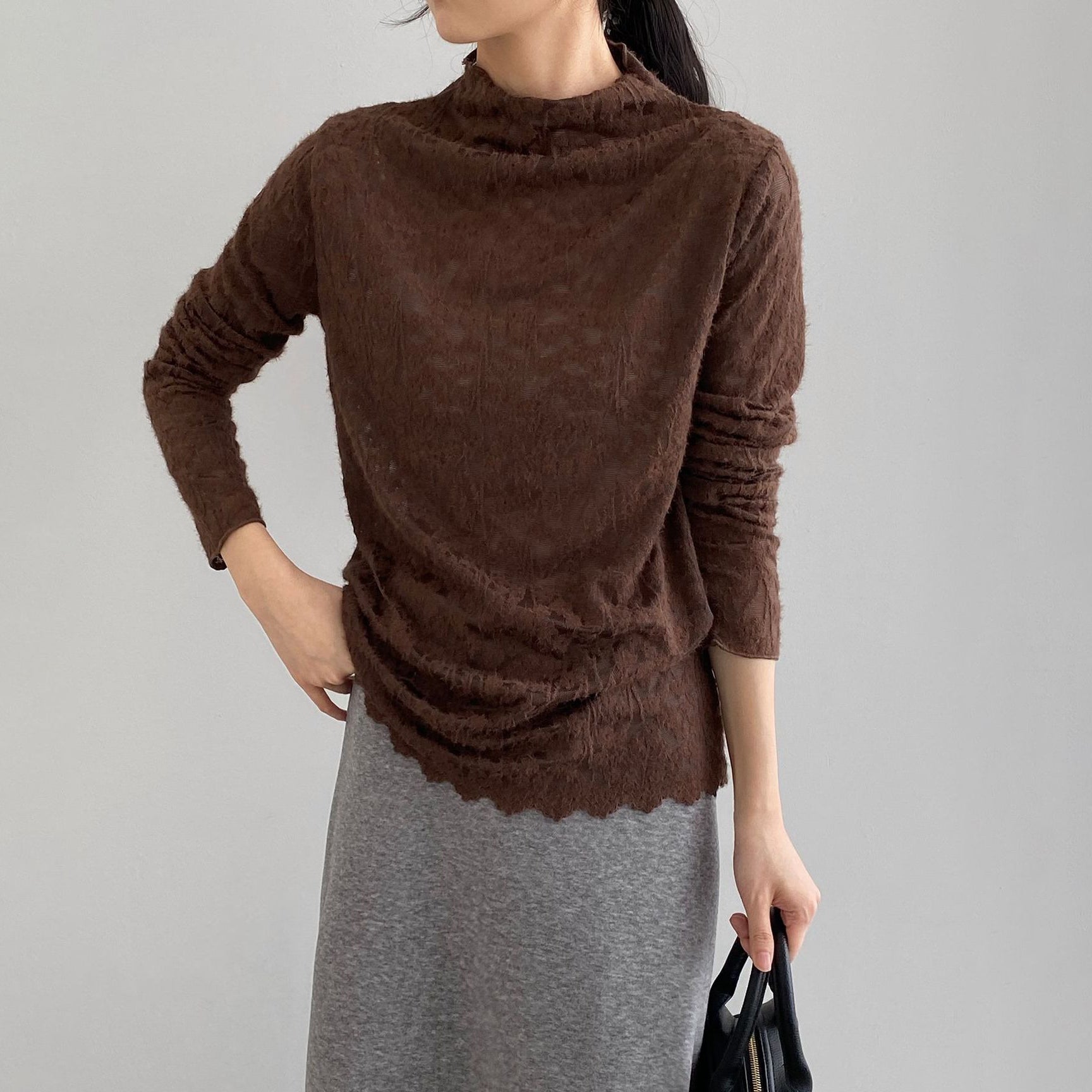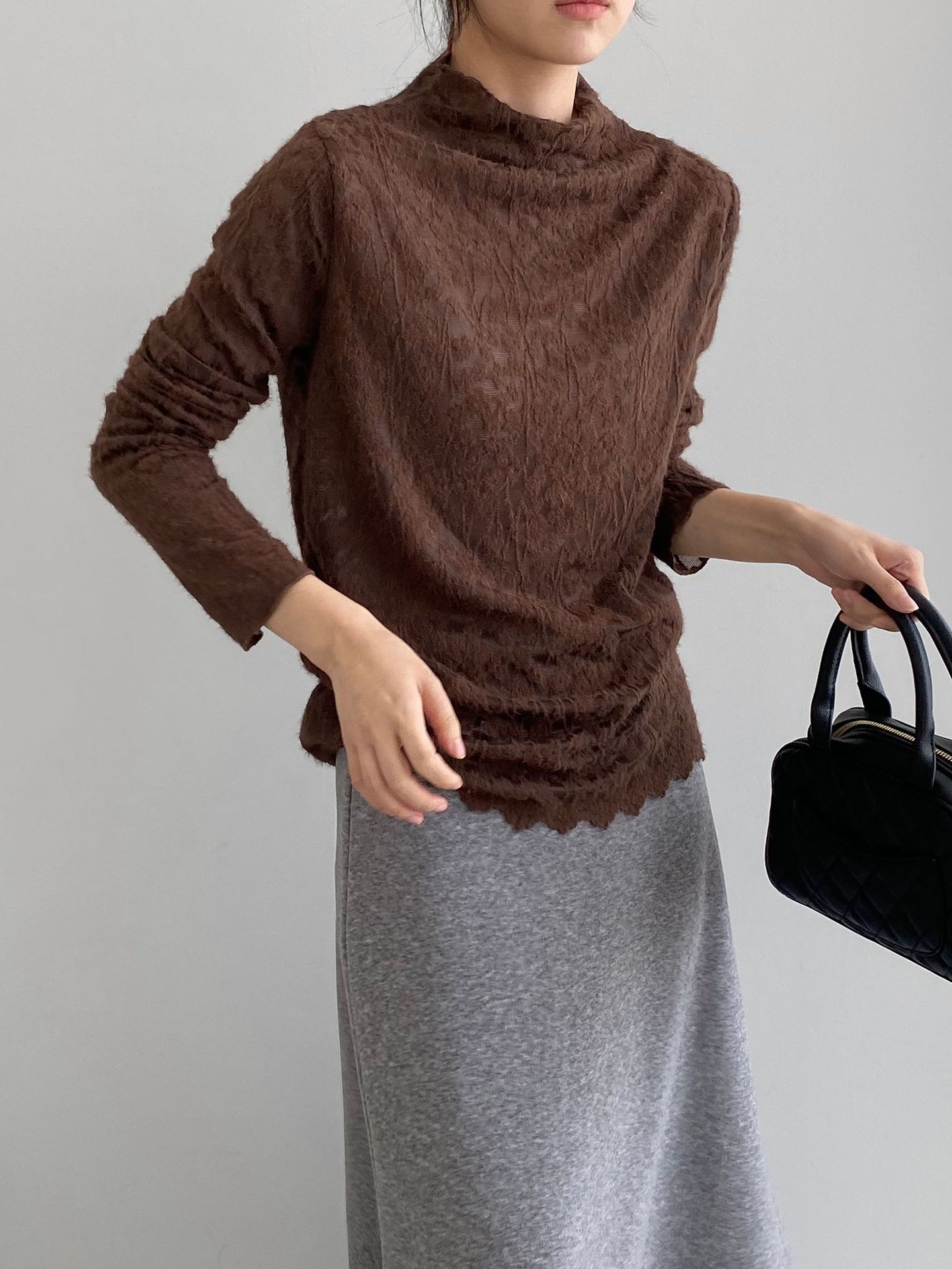 5カラー【トップス】韓国風オフィスカジュアル 大人可愛い レースインナー レディース ハーフハイネック テクスチャー感 Tシャツ【JZシリーズ】
