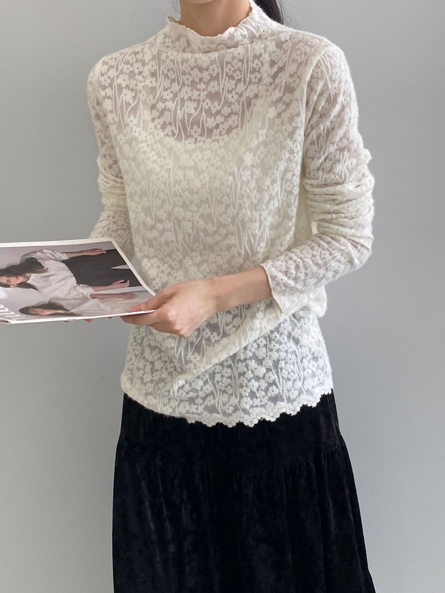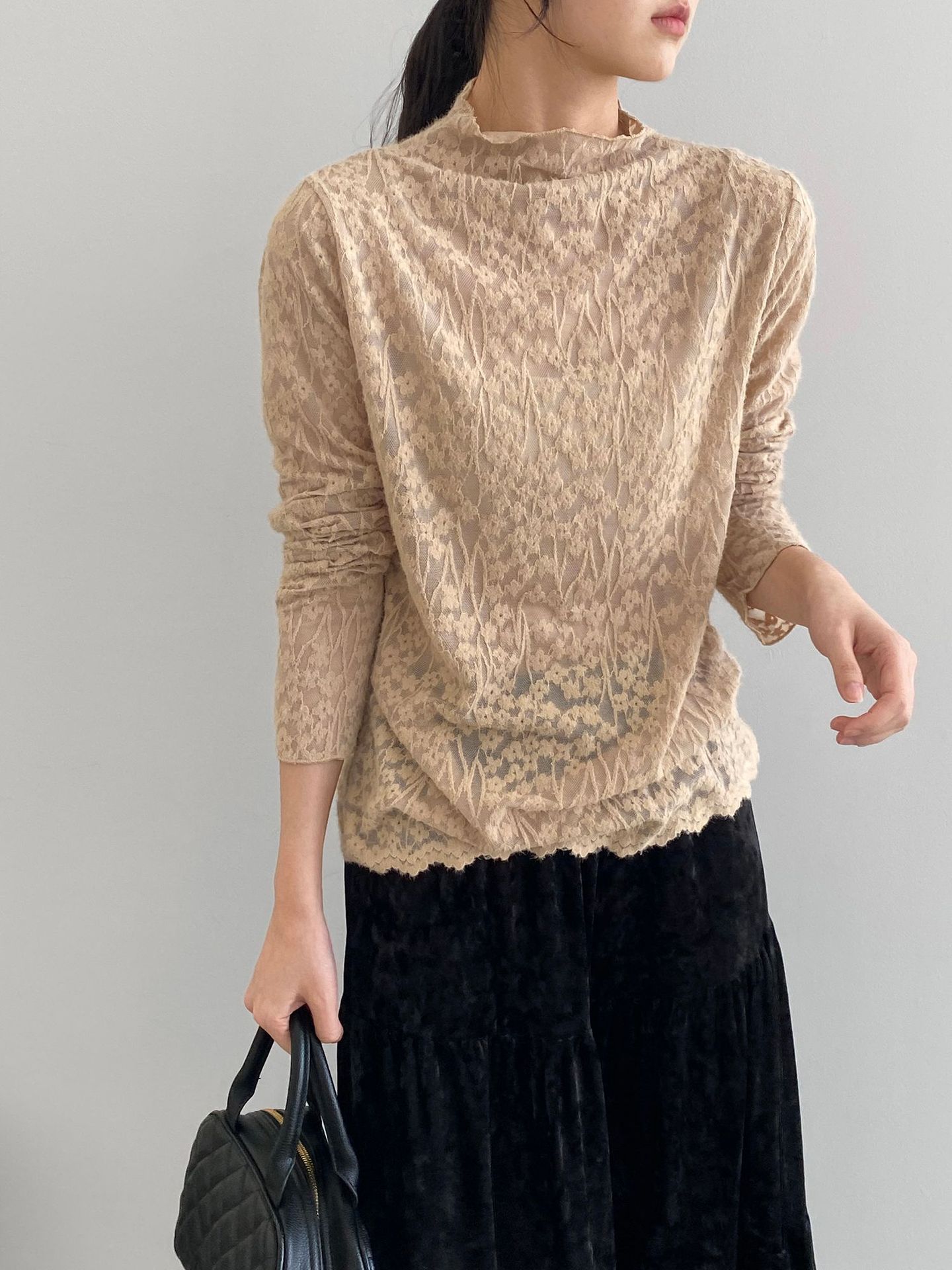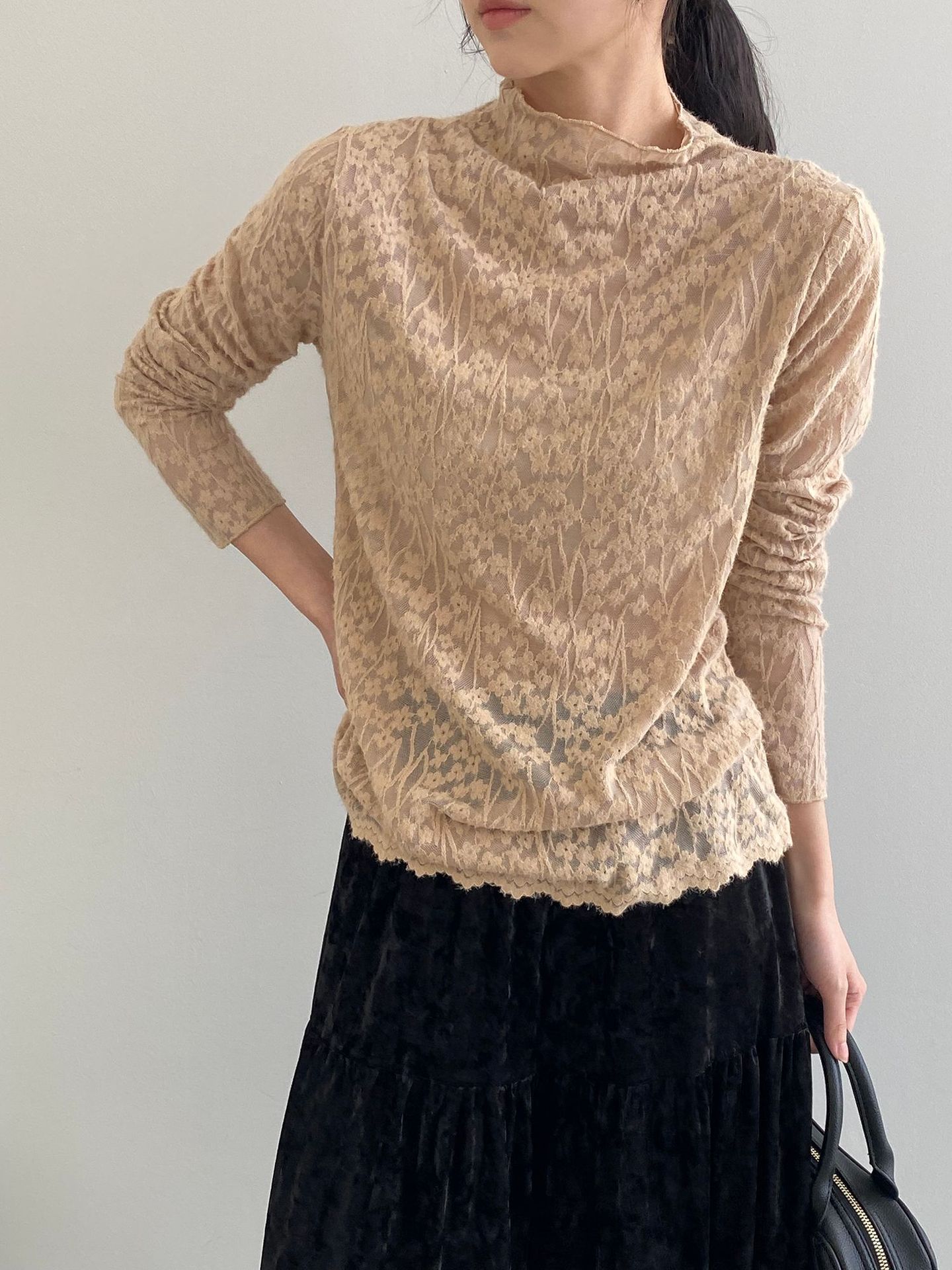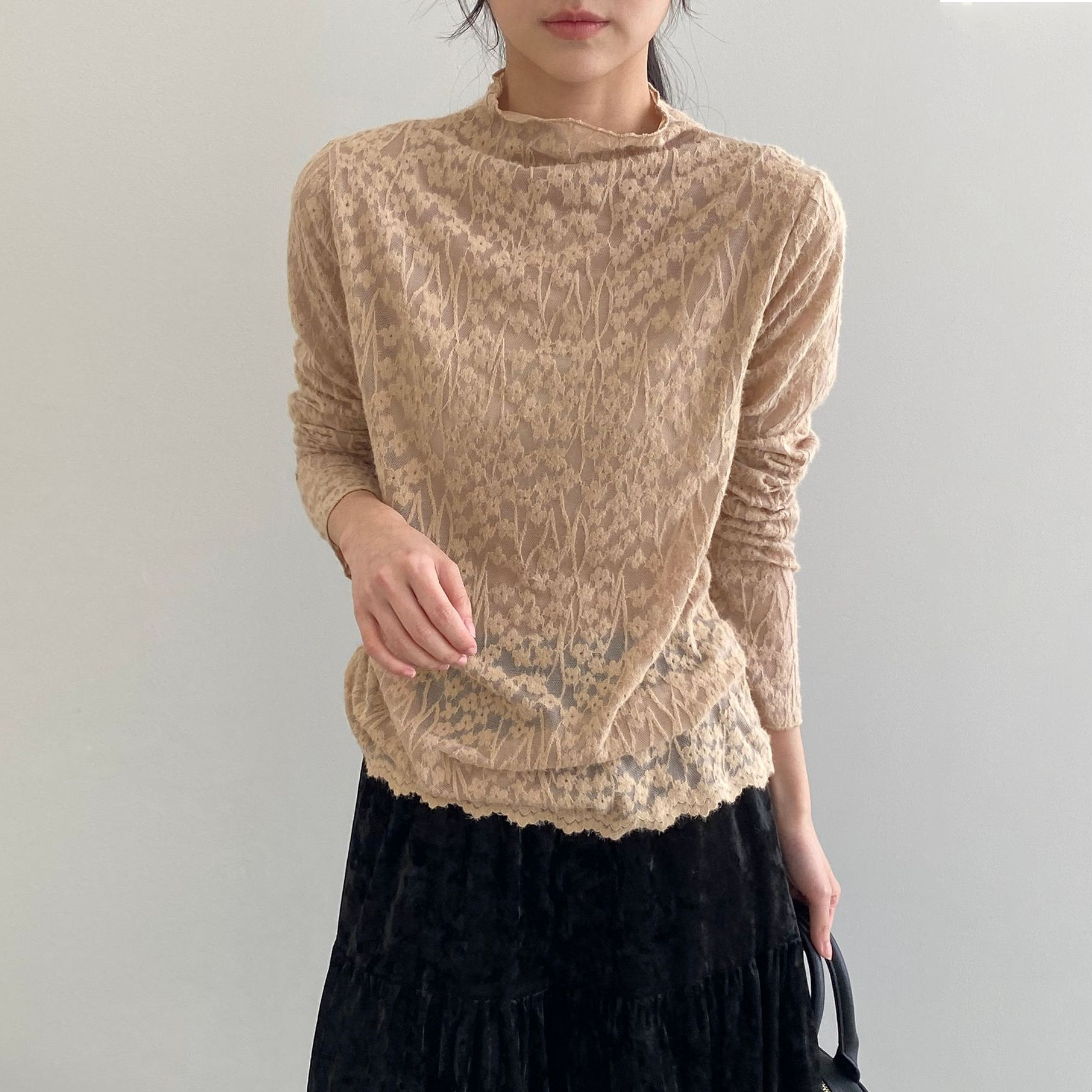 【商品名】【トップス】韓国風オフィスカジュアル 大人可愛い レースインナー レディース ハーフハイネック テクスチャー感 Tシャツ【JZシリーズ】