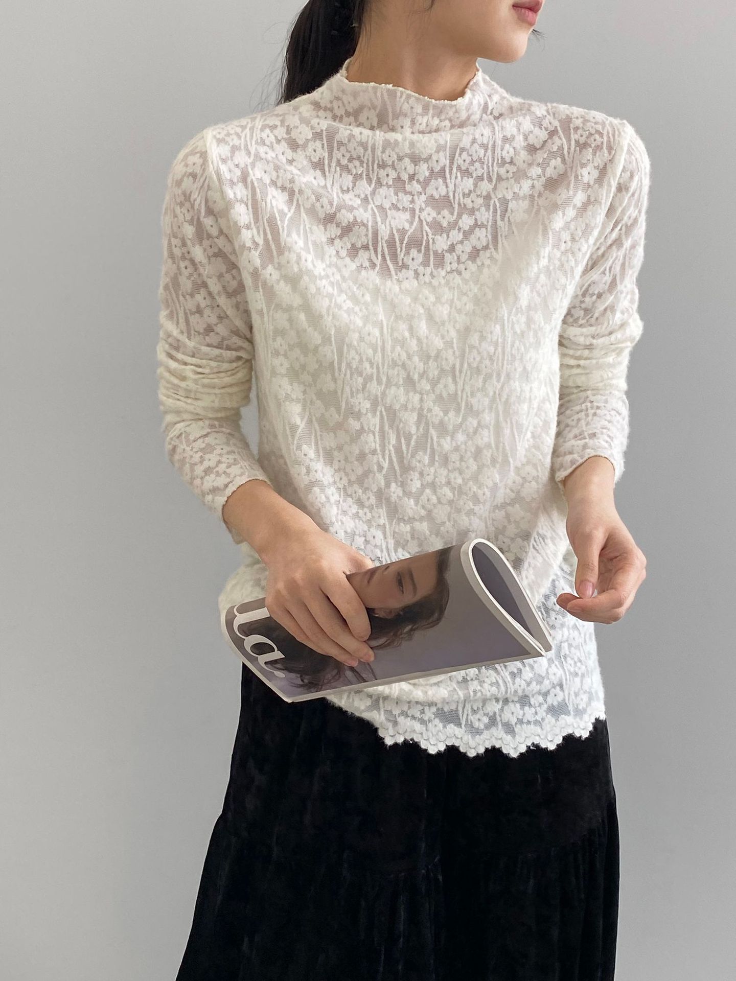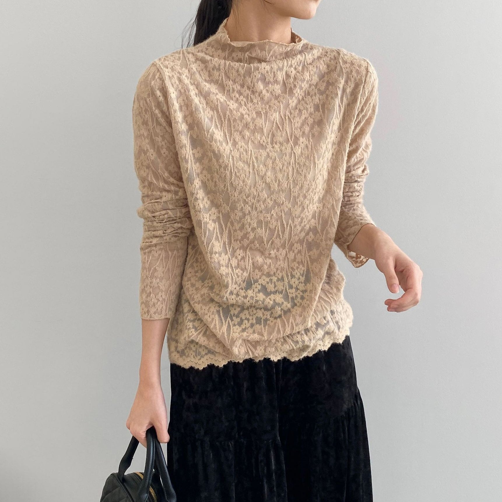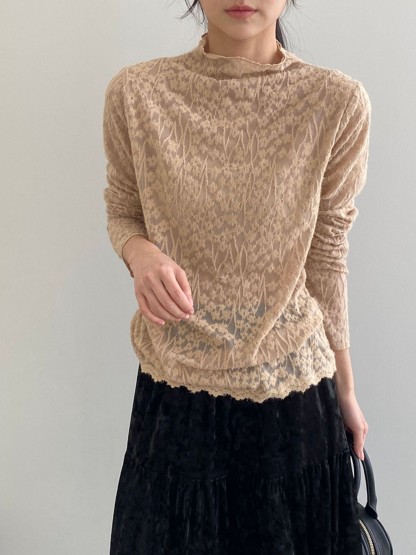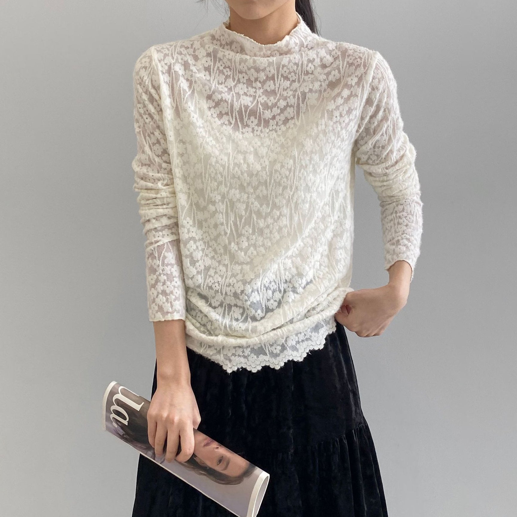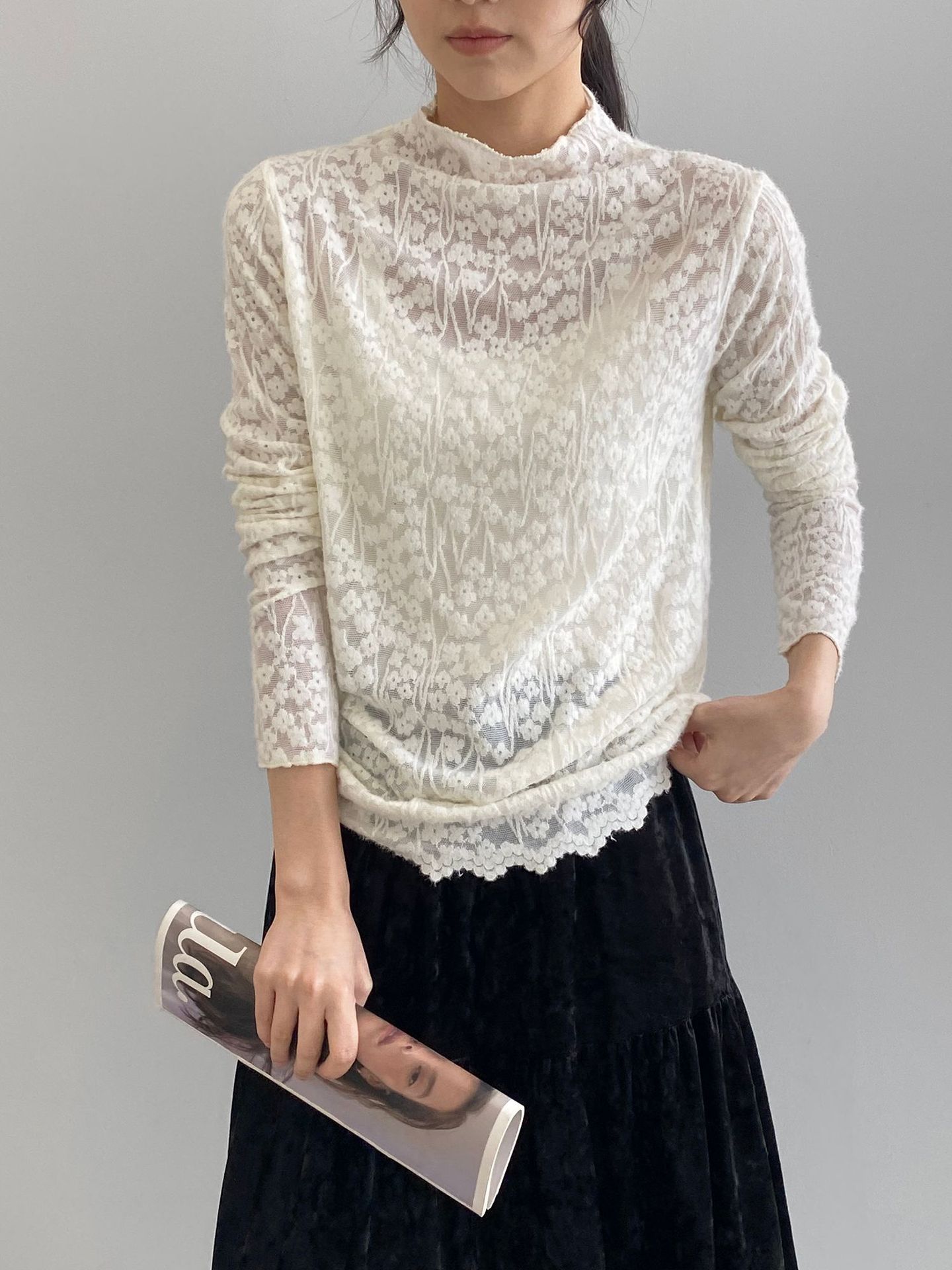 【商品名】【トップス】韓国風オフィスカジュアル 大人可愛い レースインナー レディース ハーフハイネック テクスチャー感 Tシャツ【JZシリーズ】
