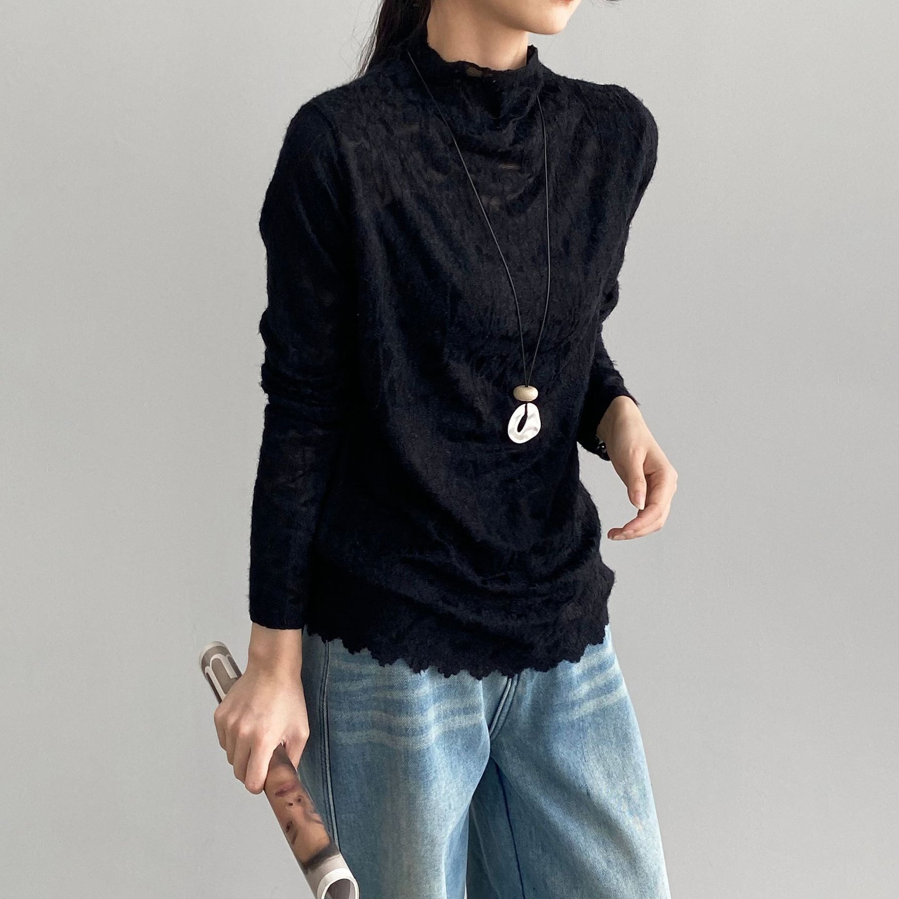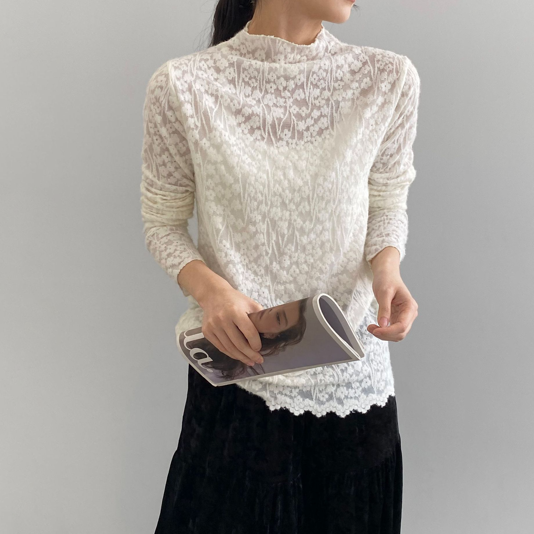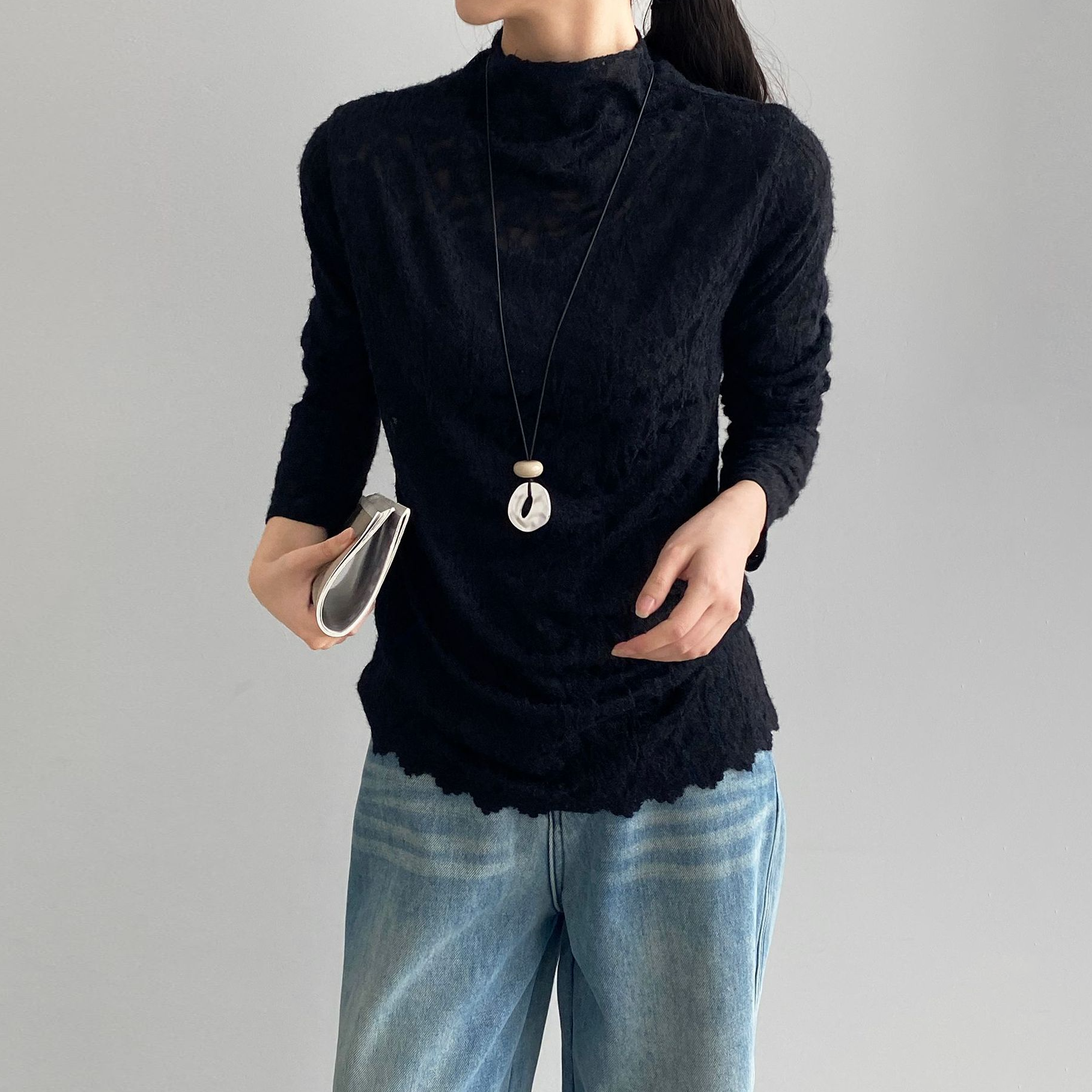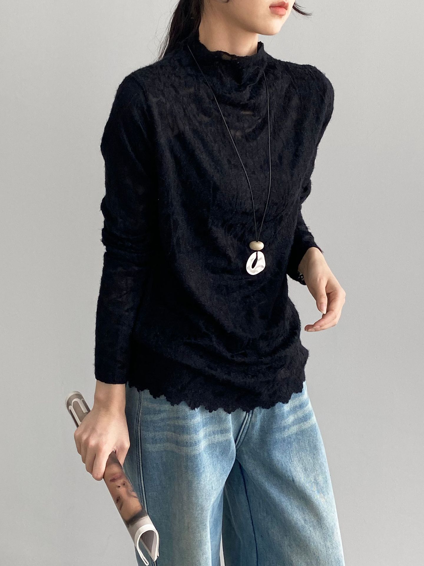 【商品名】【トップス】韓国風オフィスカジュアル 大人可愛い レースインナー レディース ハーフハイネック テクスチャー感 Tシャツ【JZシリーズ】