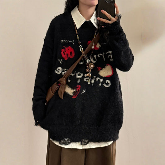 【トップス】秋冬 ねこ柄 破れ風 ダメージニット レトロ かわいい ゆったり 男女兼用 セーター【FCシリーズ】