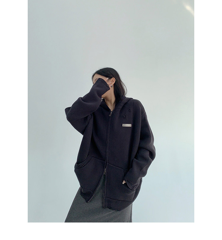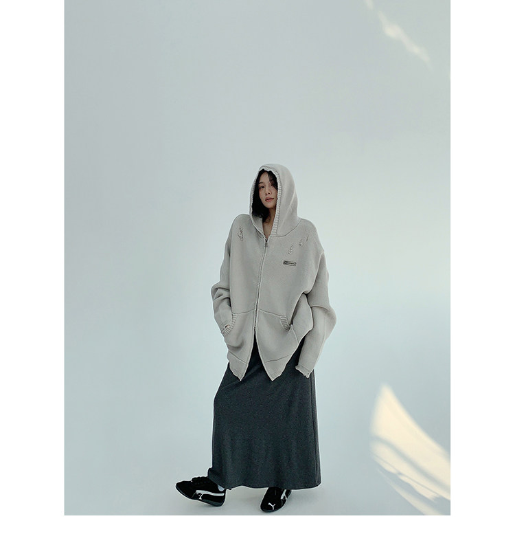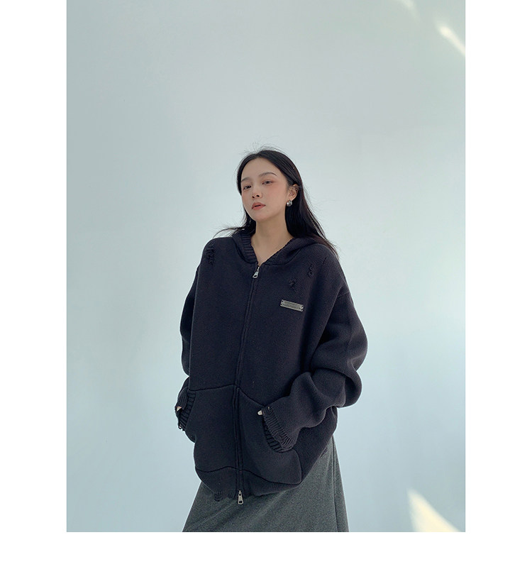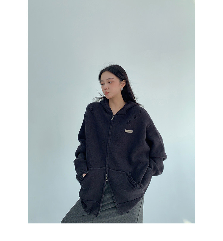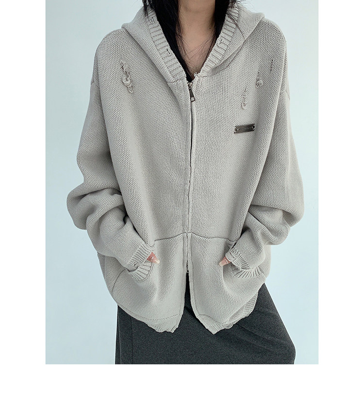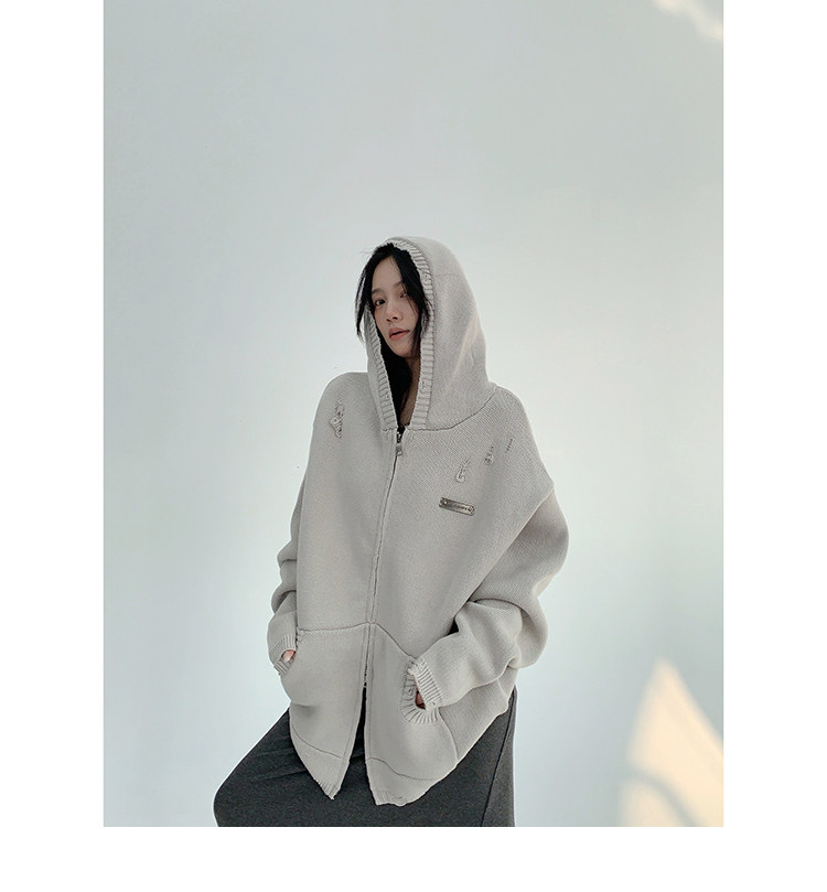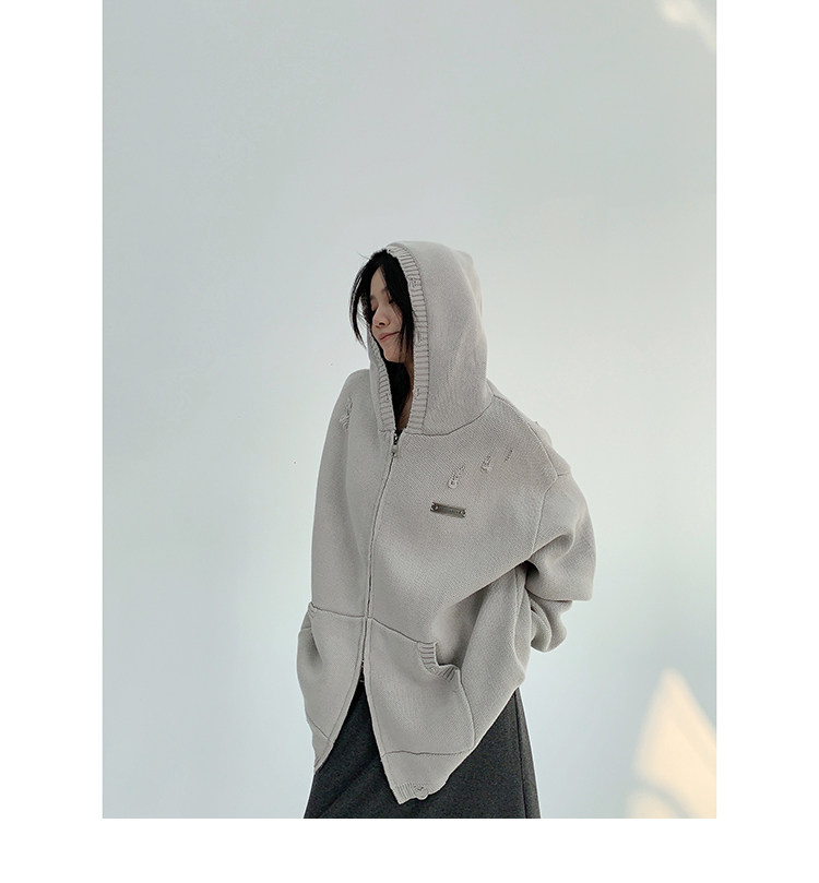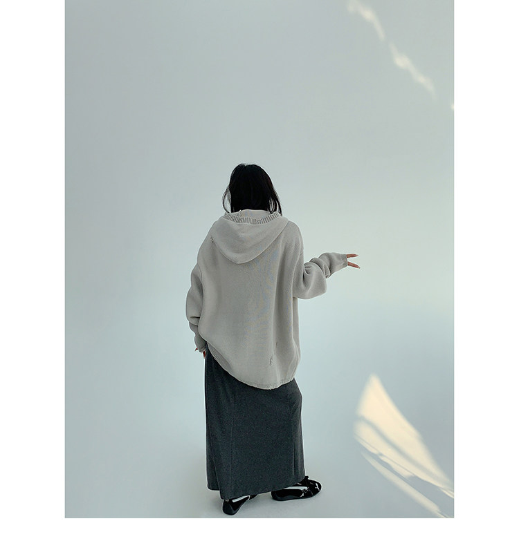 【トップス】🖤 ゆる感厚手ダメージニット・セーター レディース 冬新作 カジュアルフード付き【FCシリーズ】
