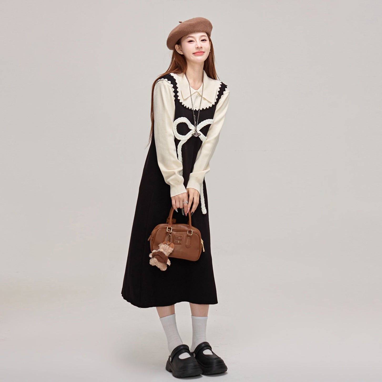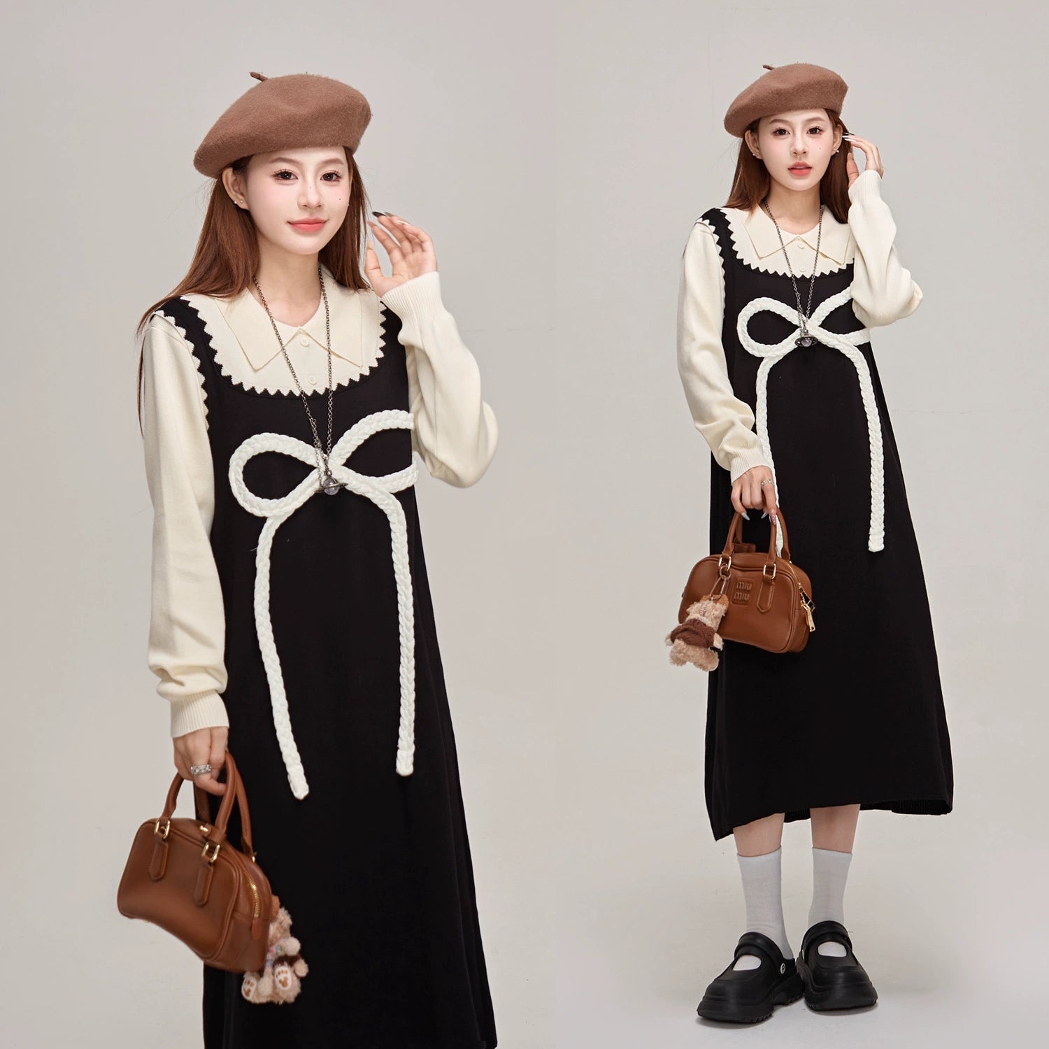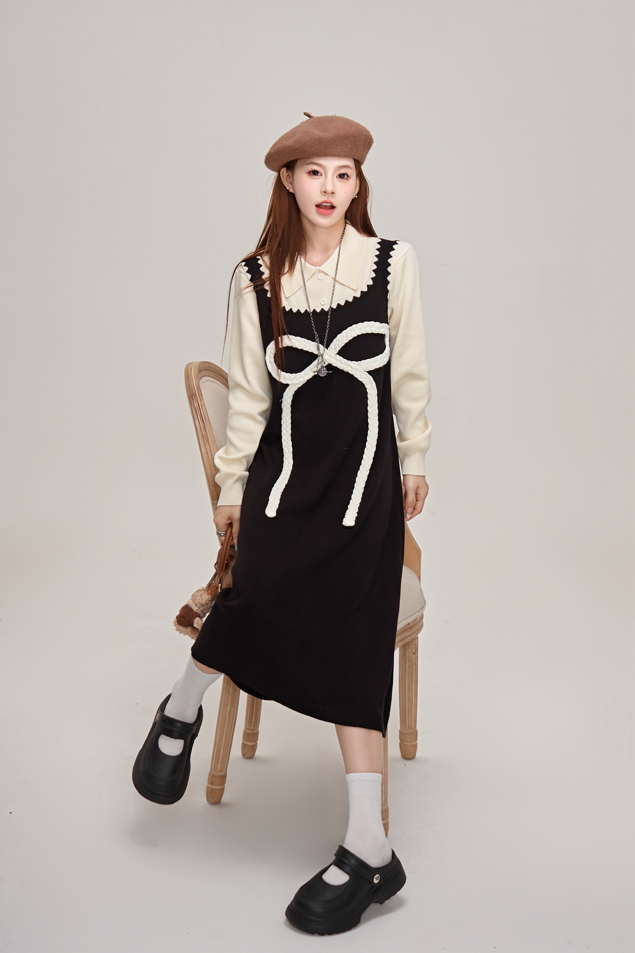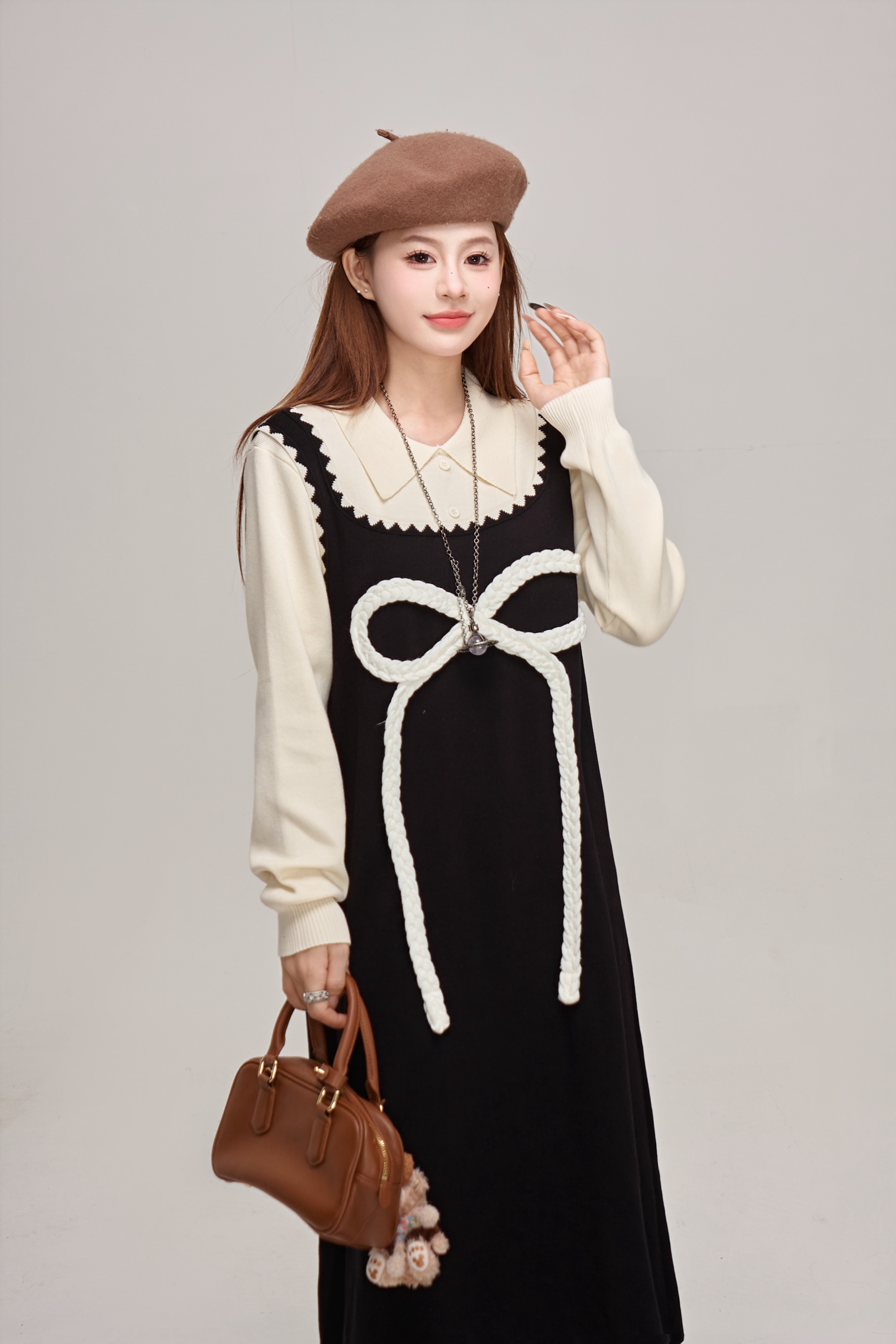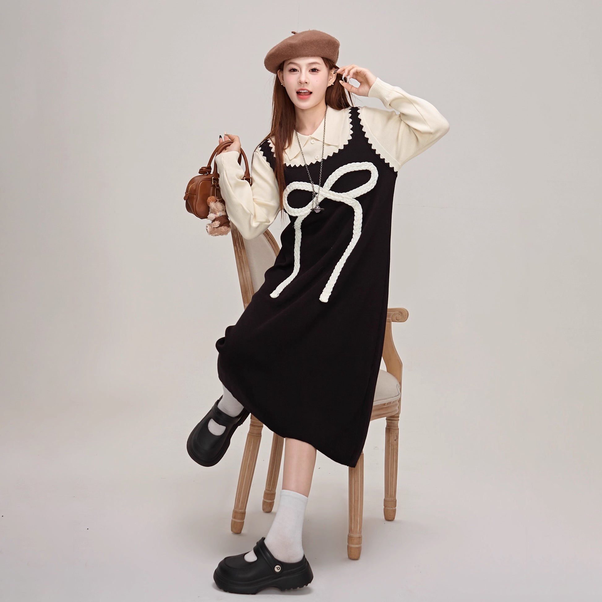 【商品名】【ワンピース】蝶結びデザイン🎀 ツーピース風ニットワンピ 冬 レディース 上品&高見え 長袖ワンピース【JZシリーズ】