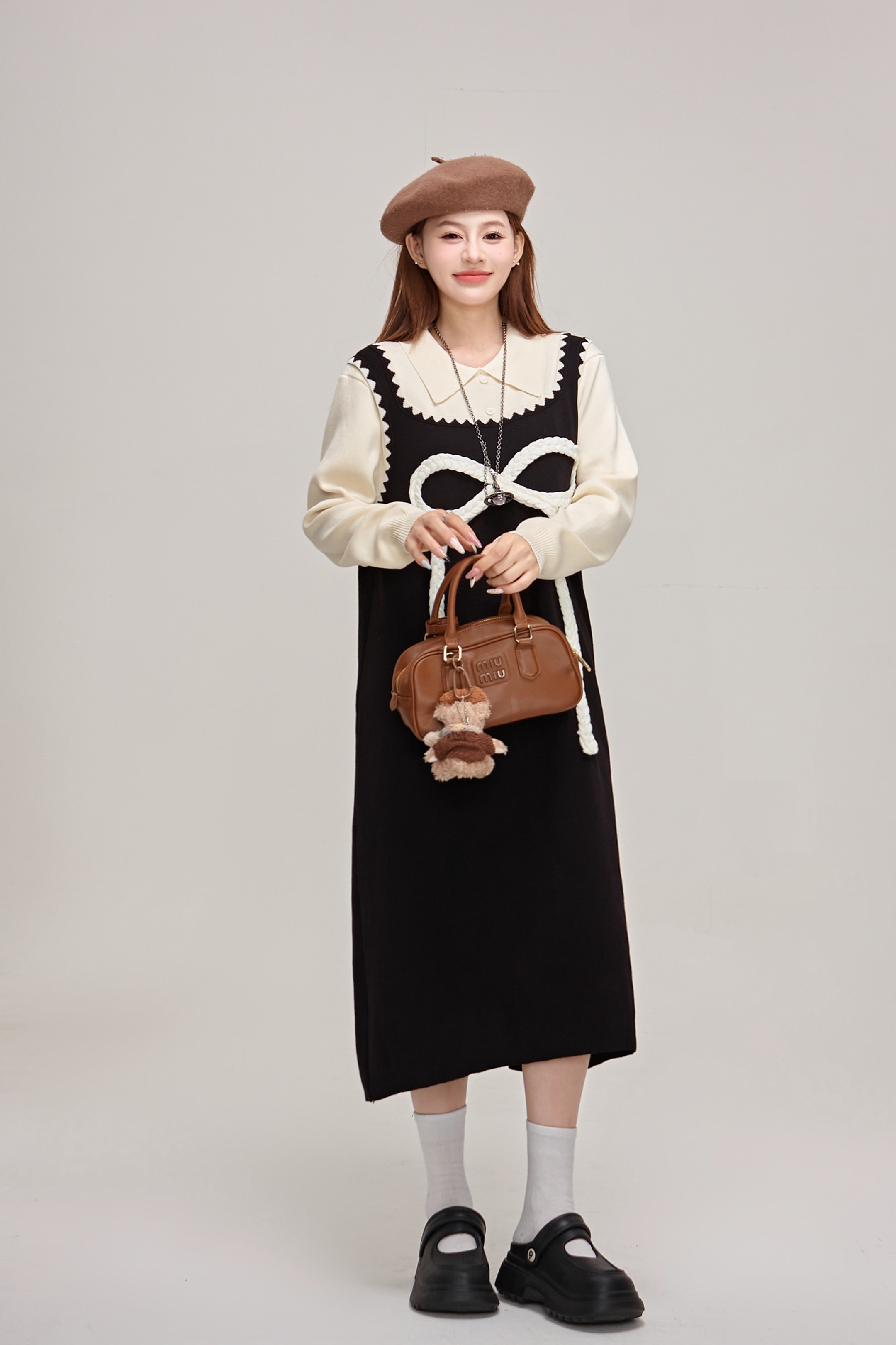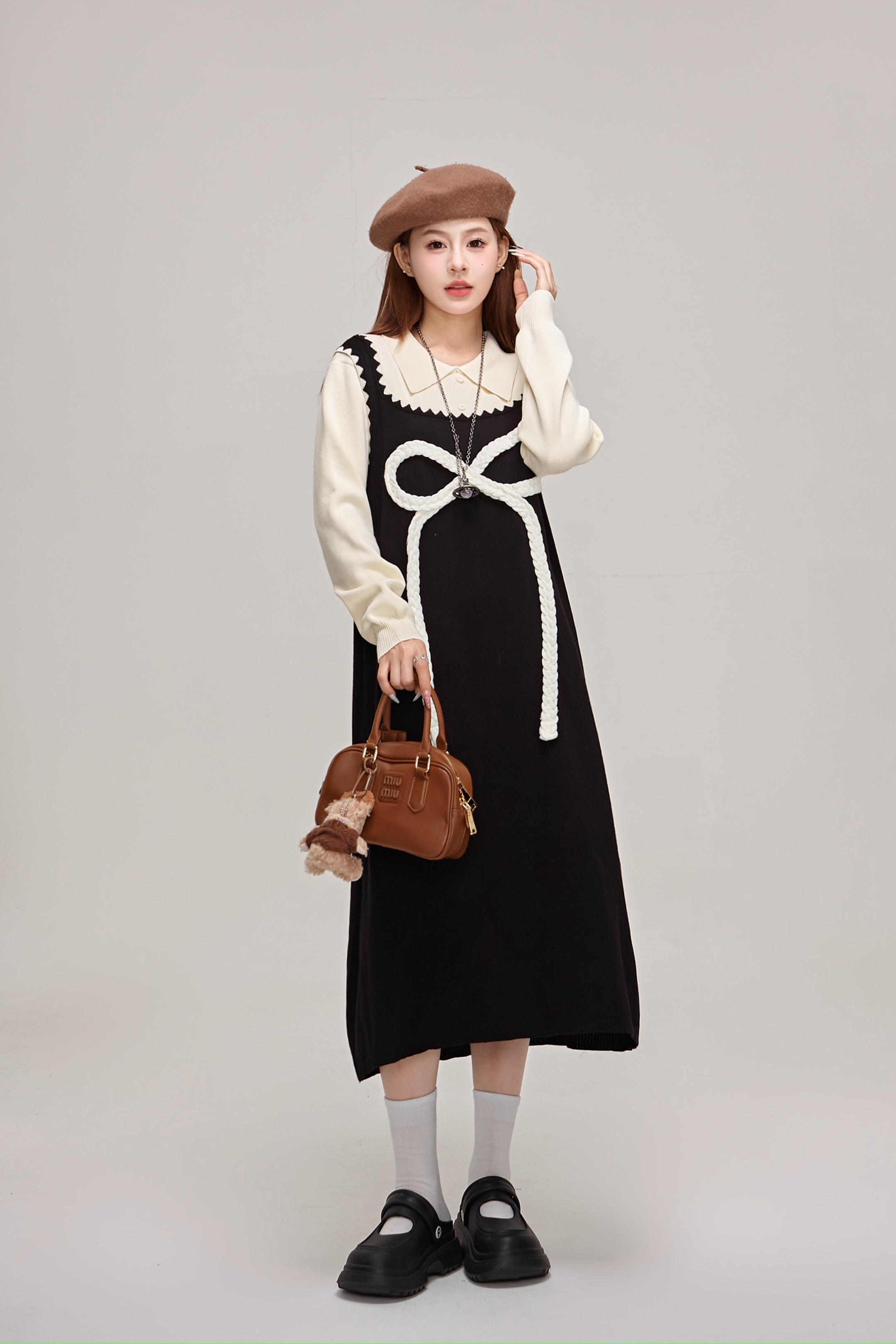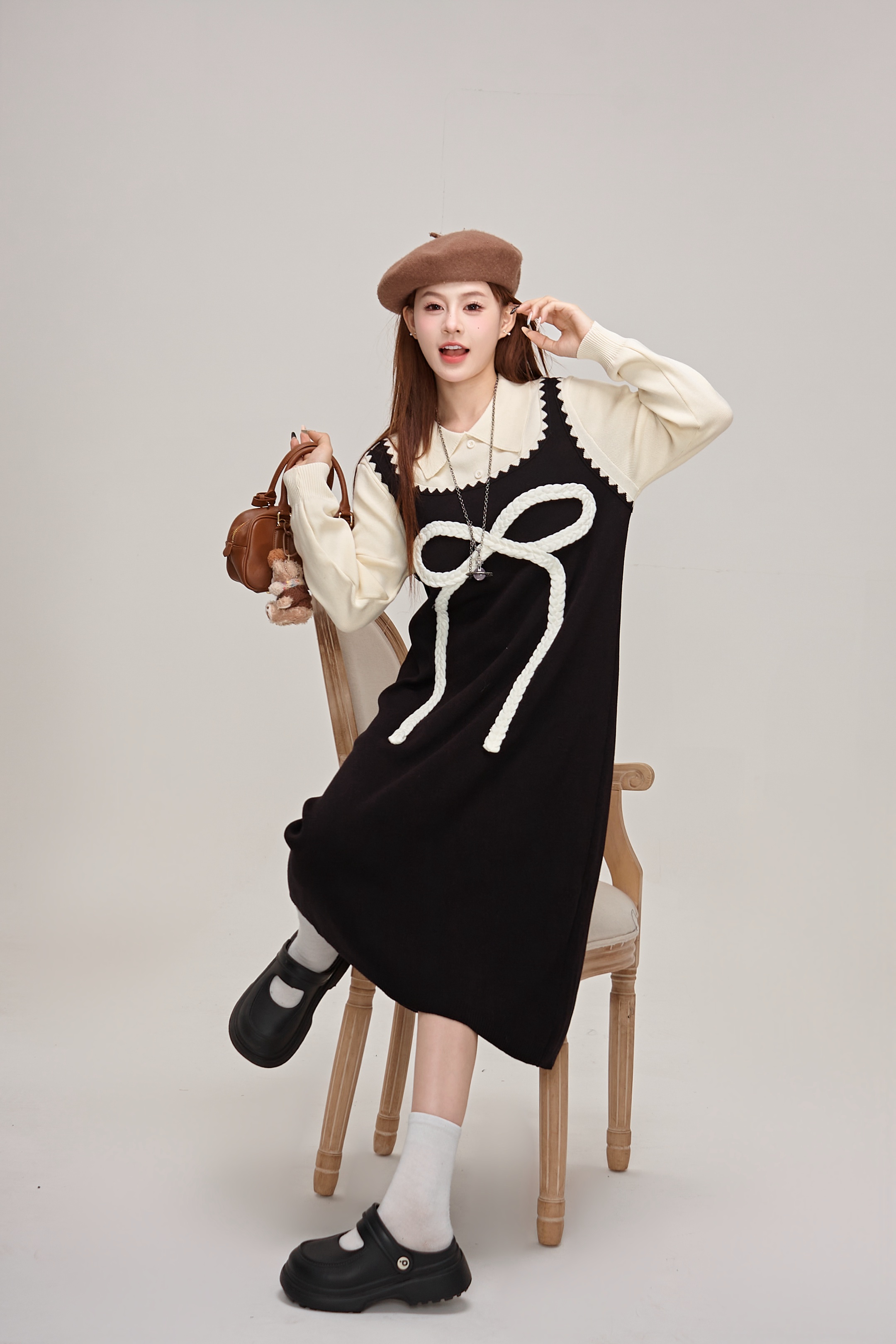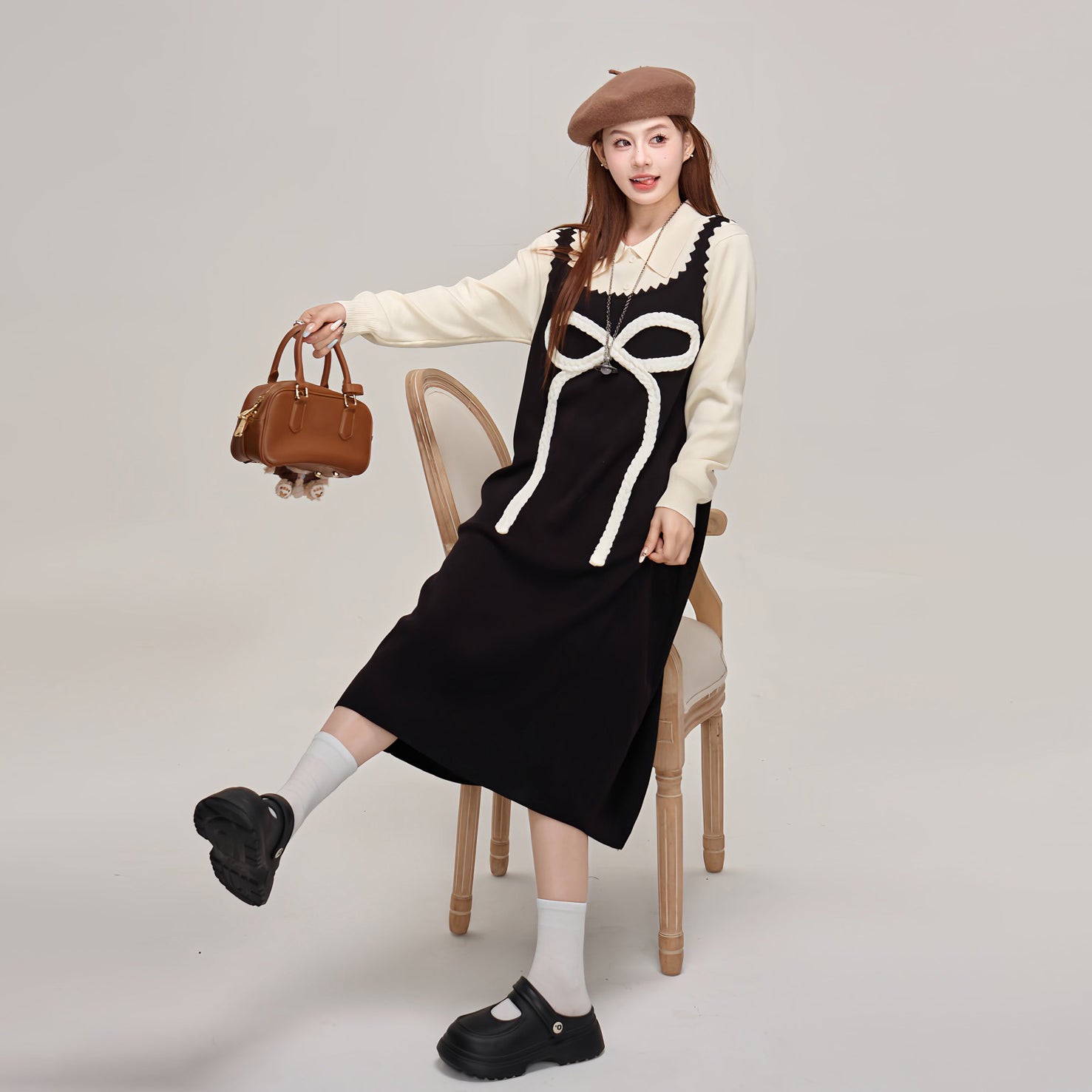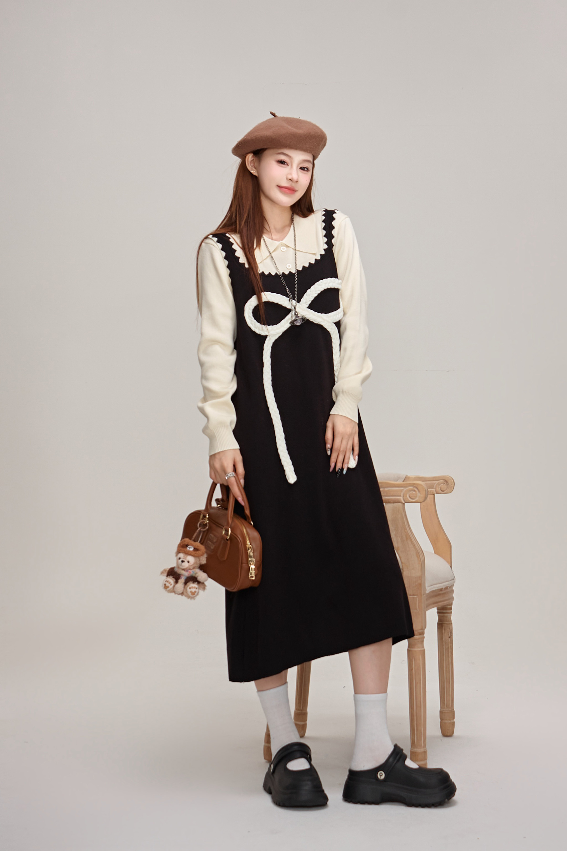 【商品名】【ワンピース】蝶結びデザイン🎀 ツーピース風ニットワンピ 冬 レディース 上品&高見え 長袖ワンピース【JZシリーズ】