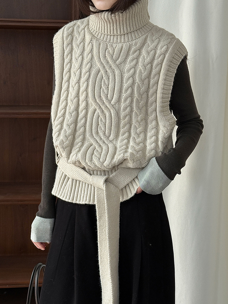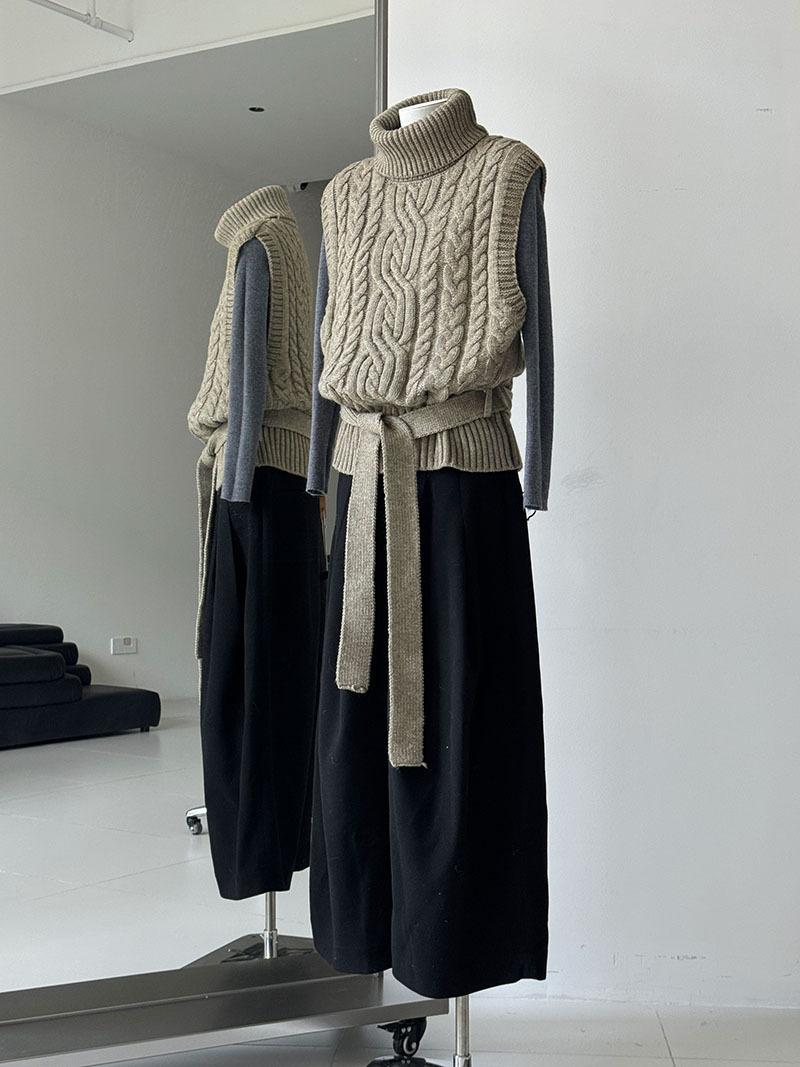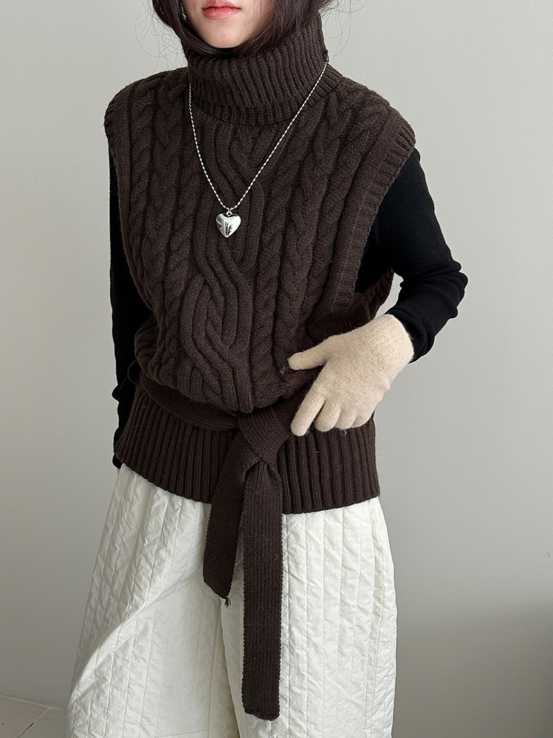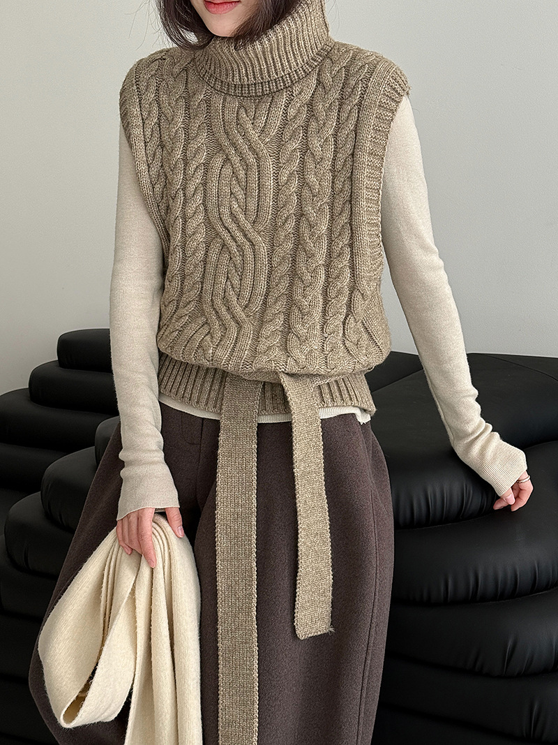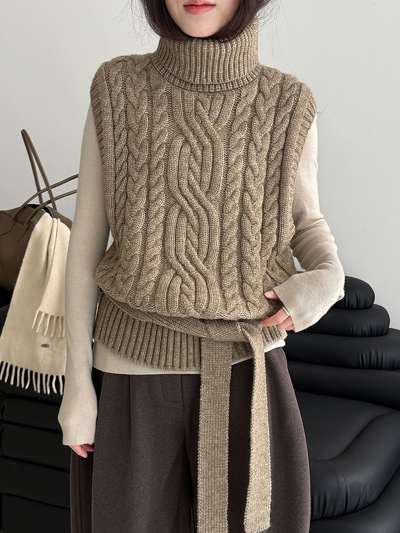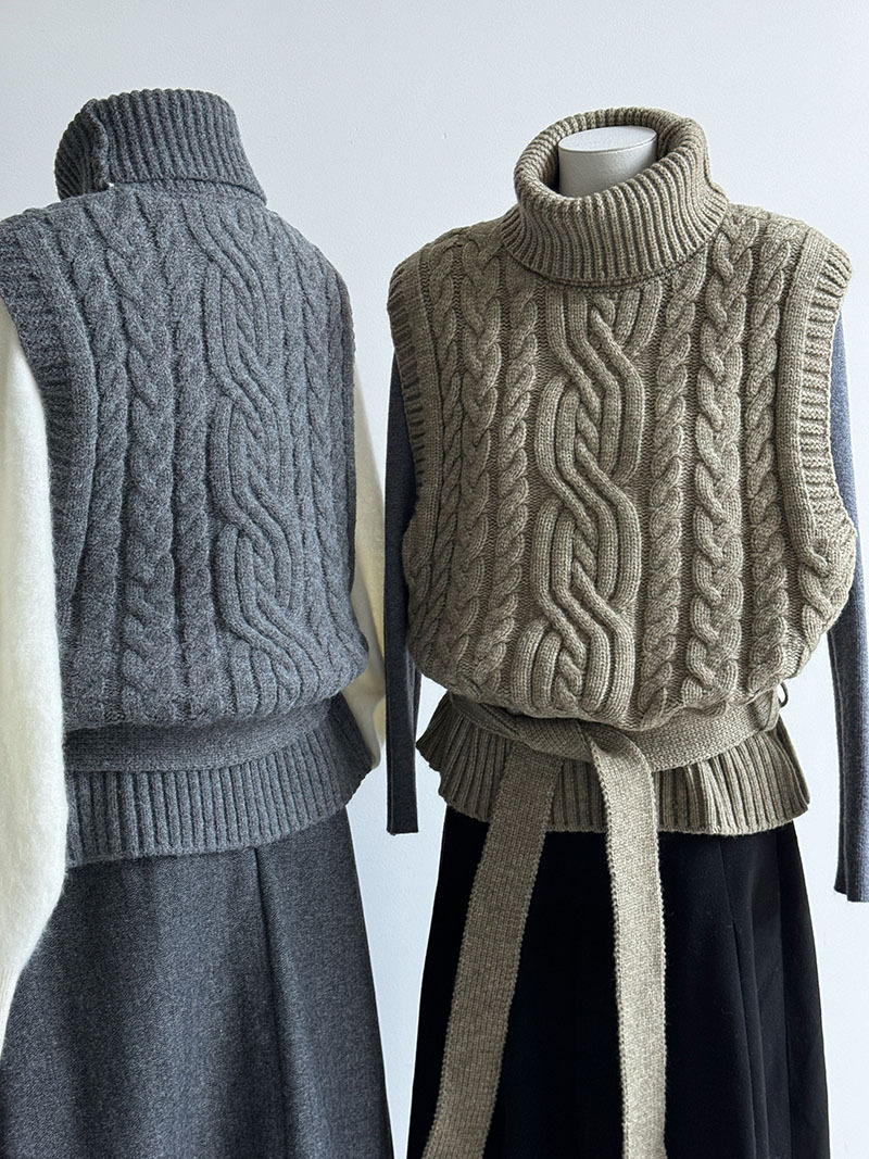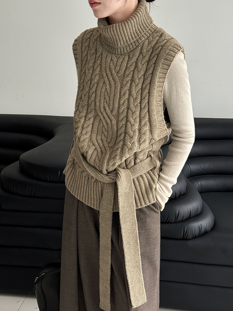 【トップス】春 秋 冬 ハイネック ケーブル ベルト付き ノースリーブ セーター 【JZシリーズ】