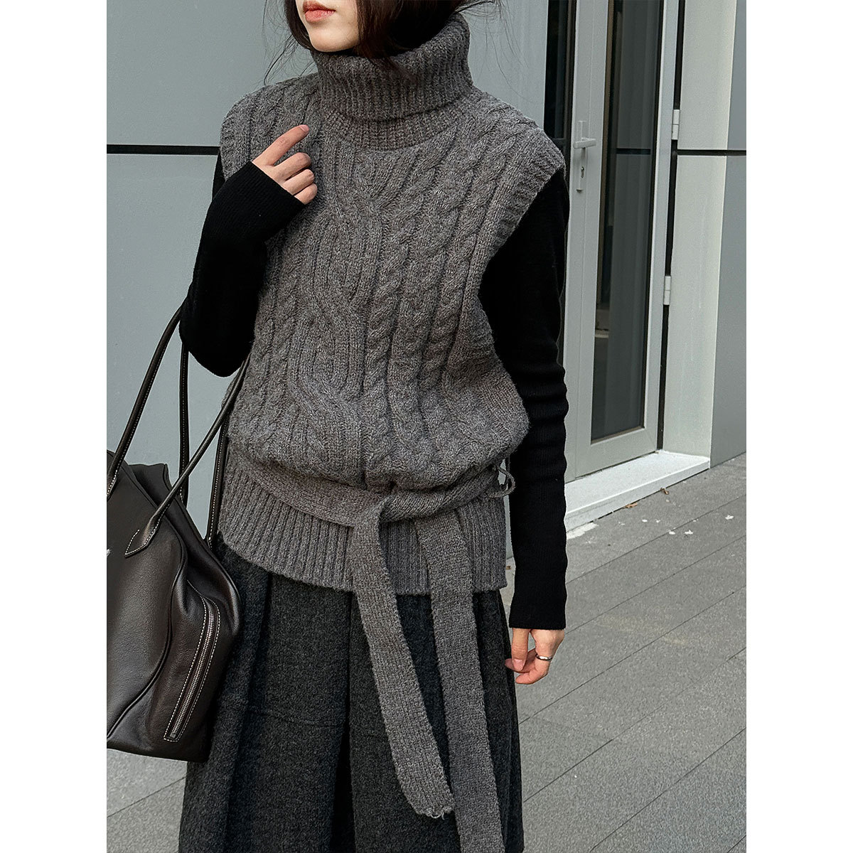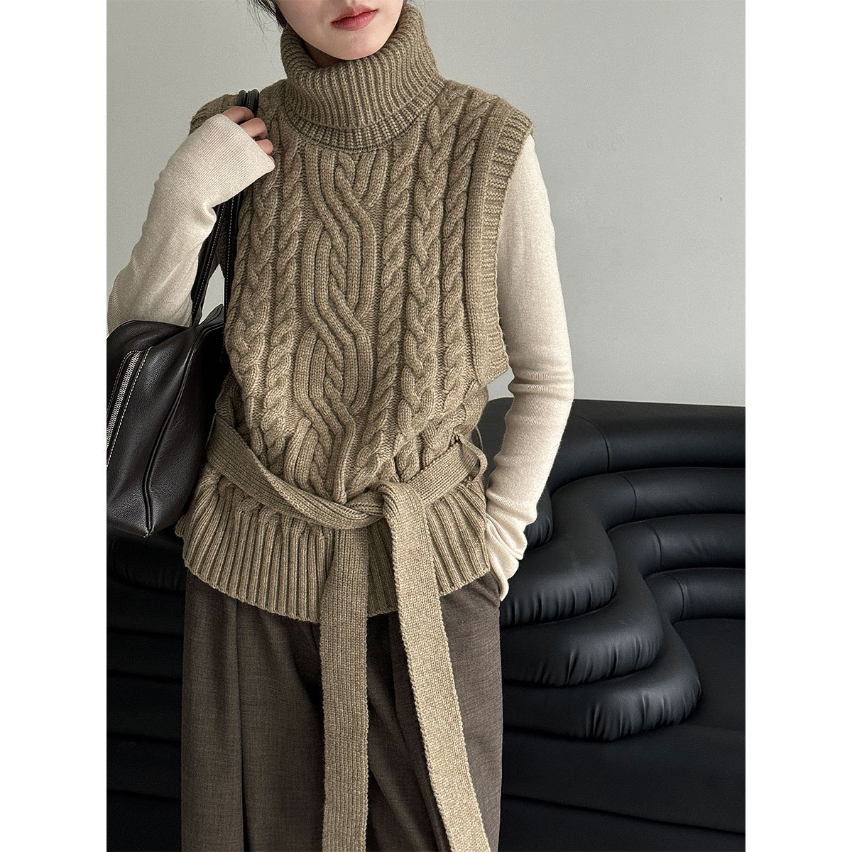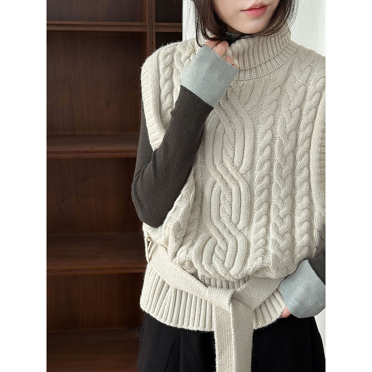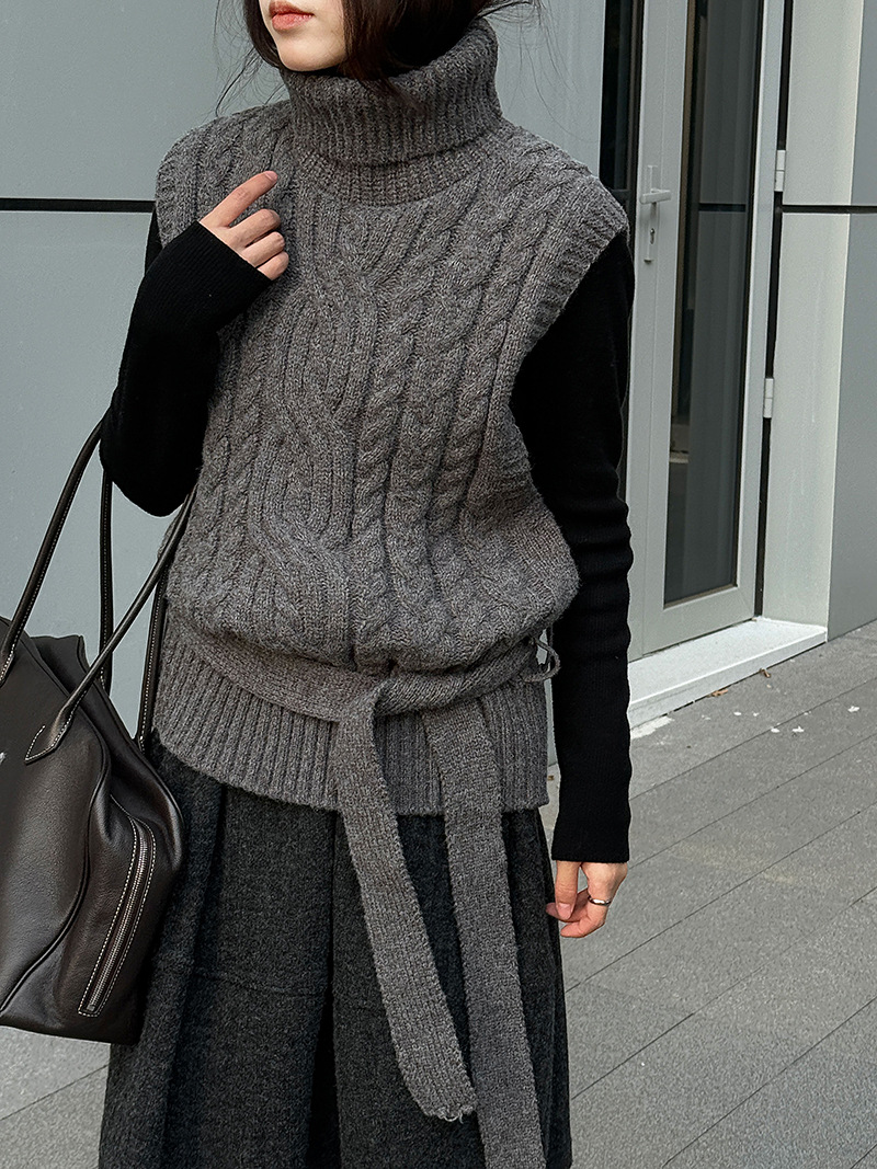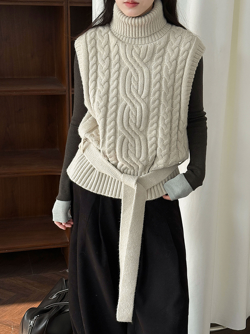 【トップス】春 秋 冬 ハイネック ケーブル ベルト付き ノースリーブ セーター 【JZシリーズ】
