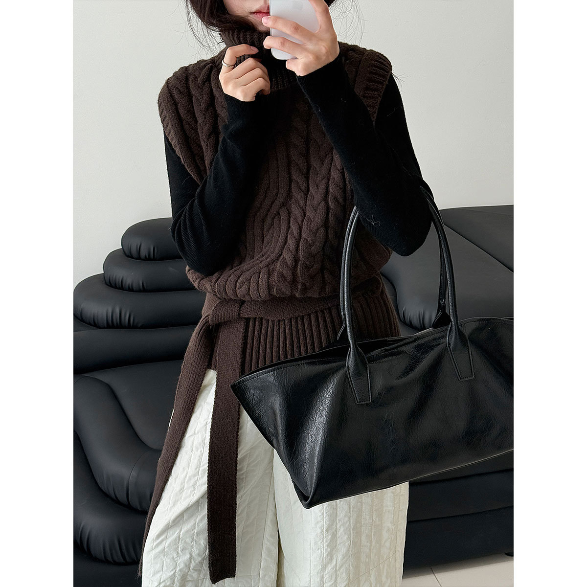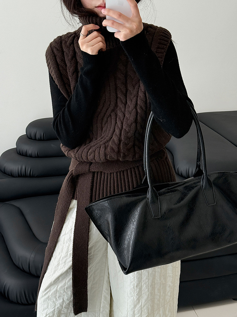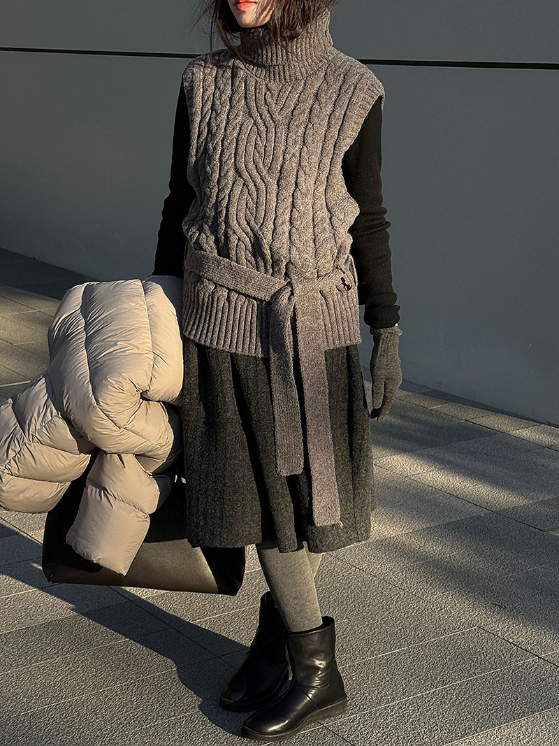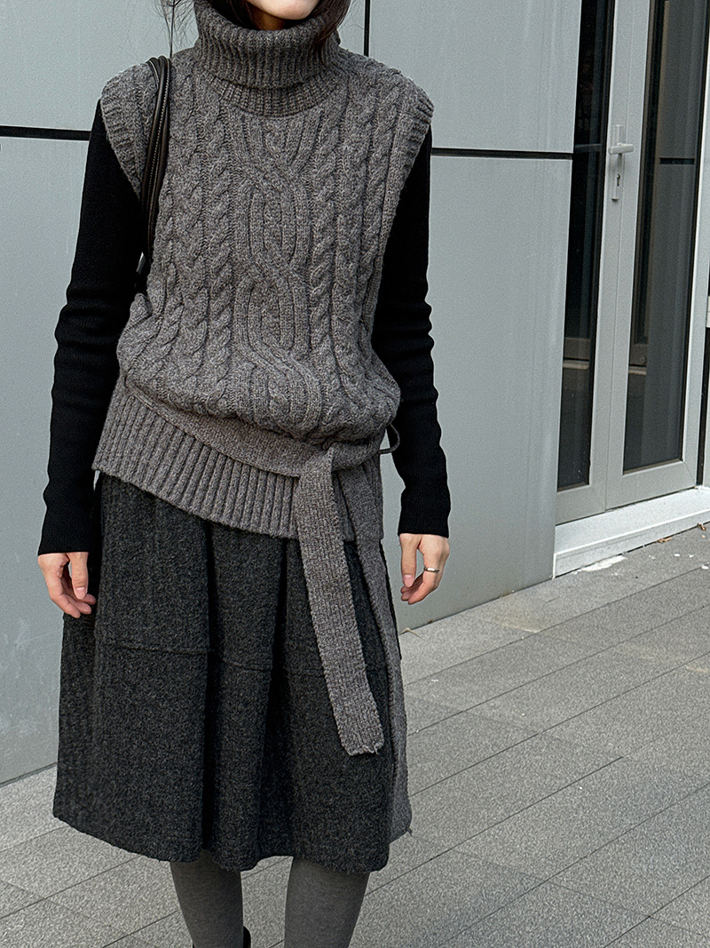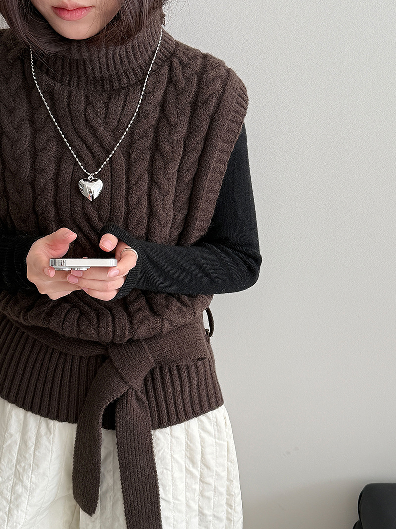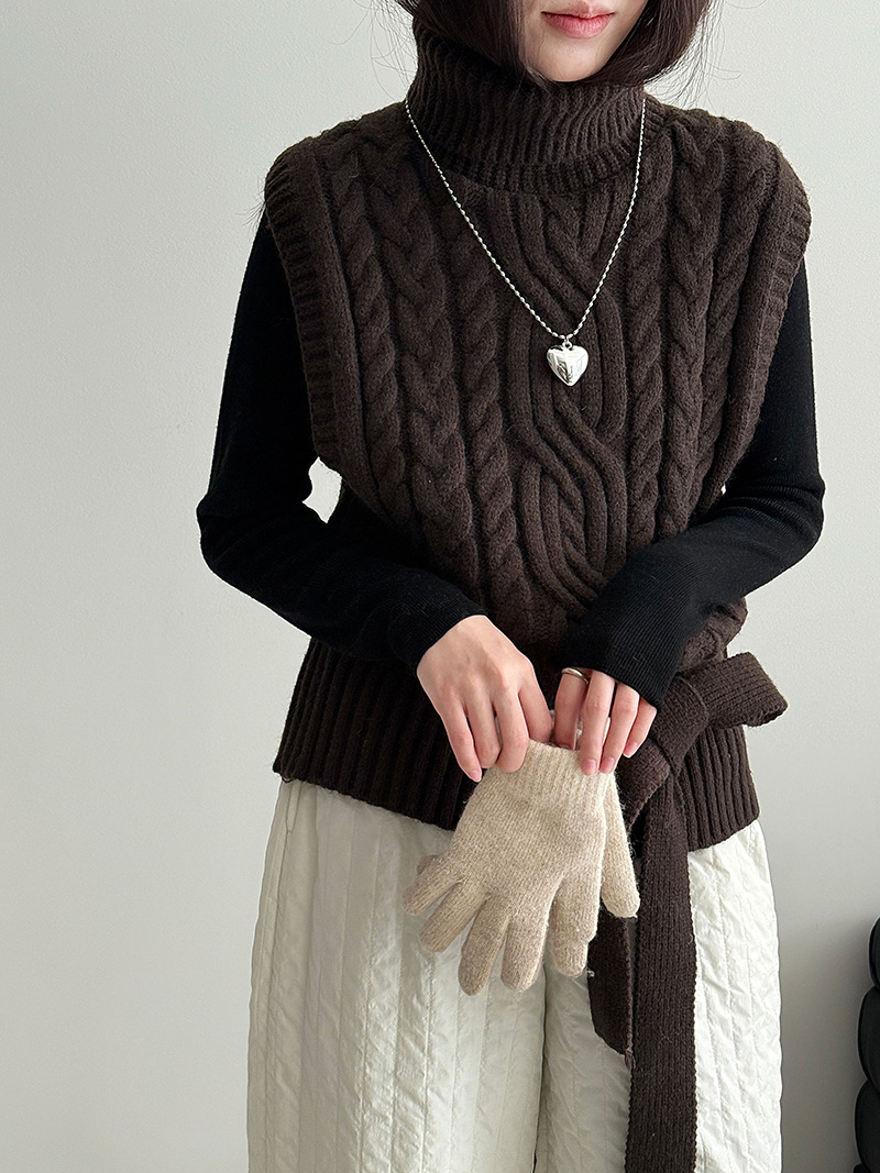 【トップス】春 秋 冬 ハイネック ケーブル ベルト付き ノースリーブ セーター 【JZシリーズ】