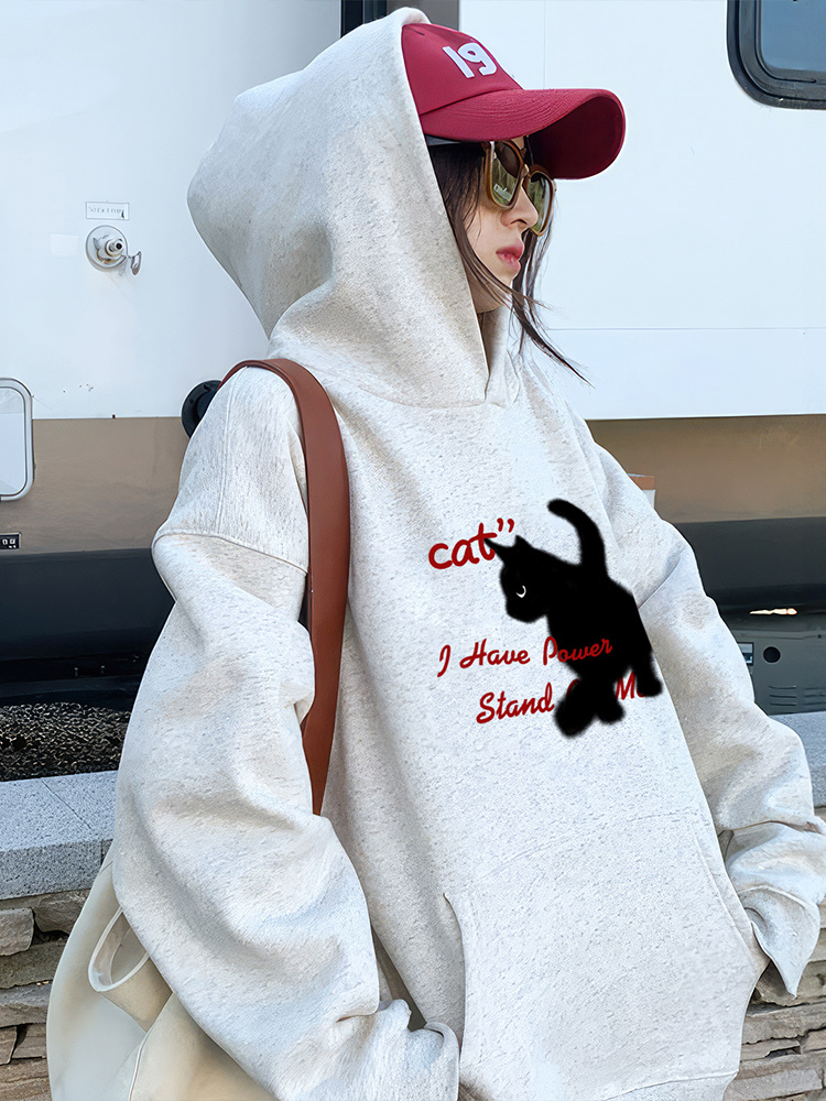 【商品名】【トップス】黒猫柄 フード付き スウェット レディース 秋冬 裏起毛 ゆったり おしゃれ【FCシリーズ】