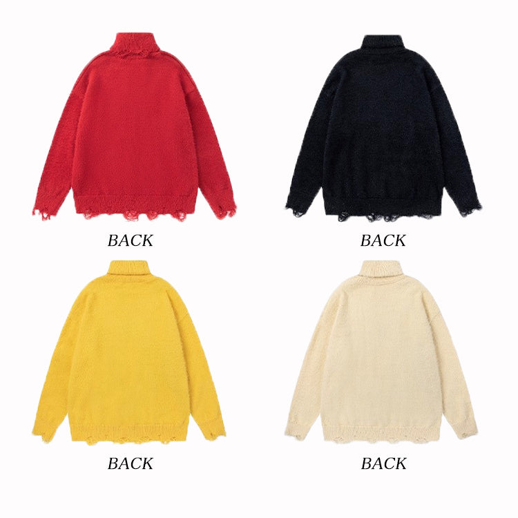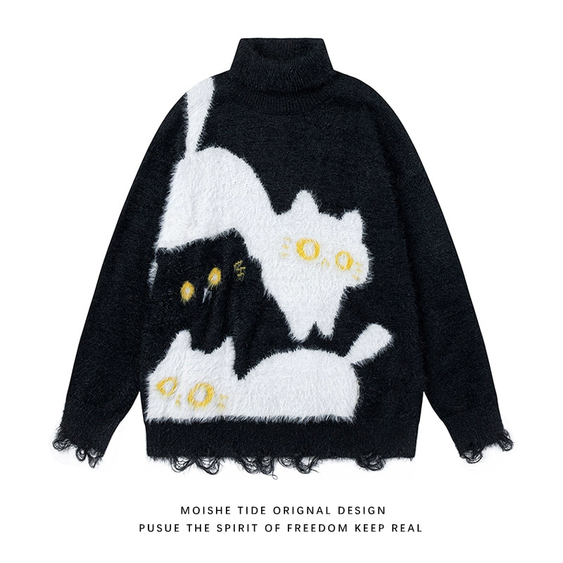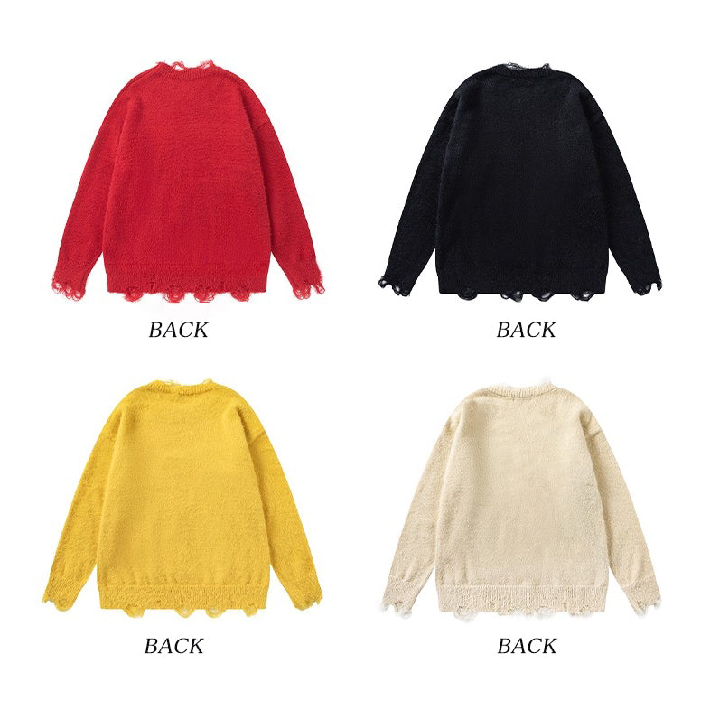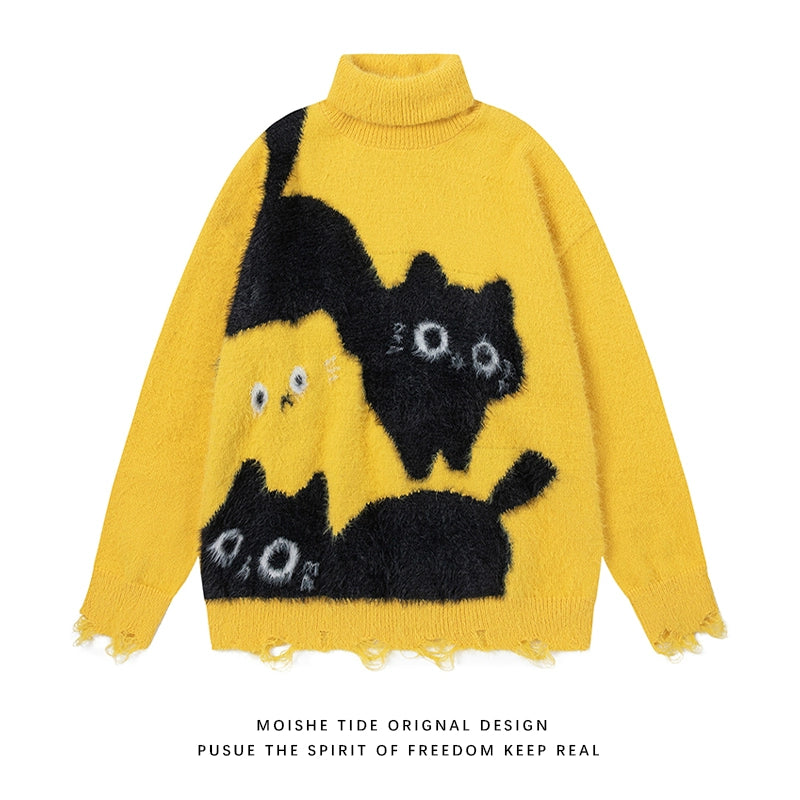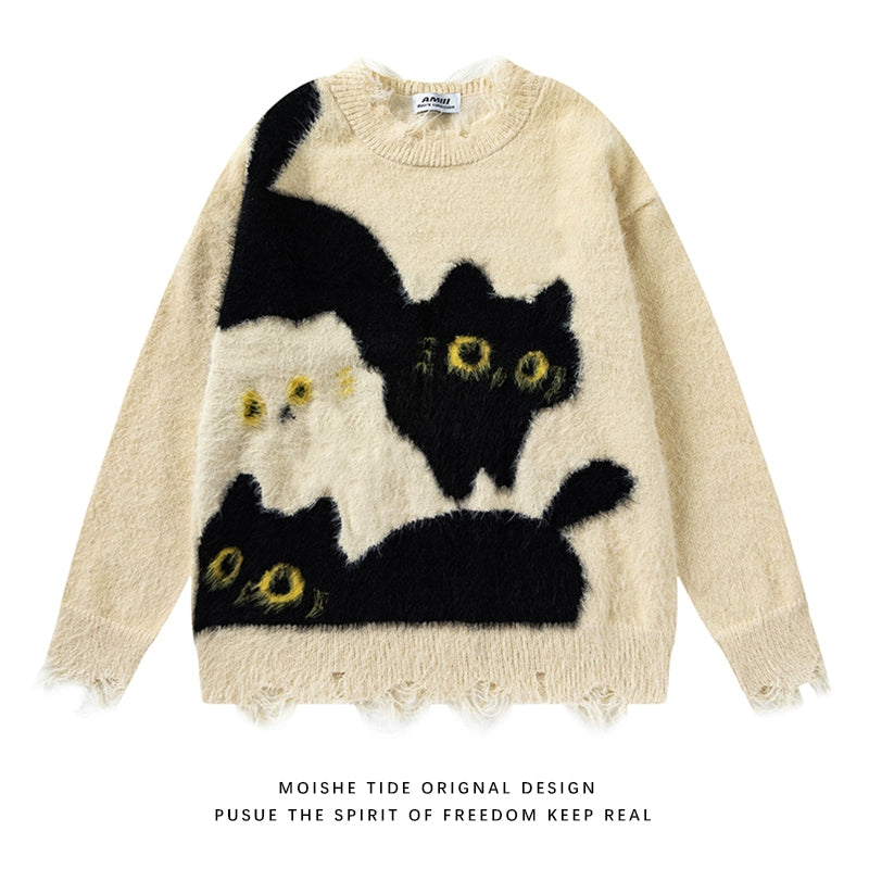 【トップス】秋冬 ねこ柄 破れ風 ダメージニット レトロ かわいい ゆったり 男女兼用 セーター【FCシリーズ】