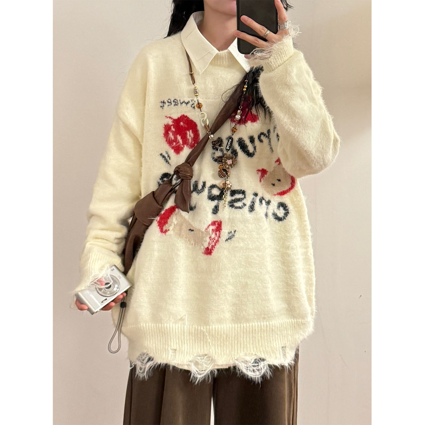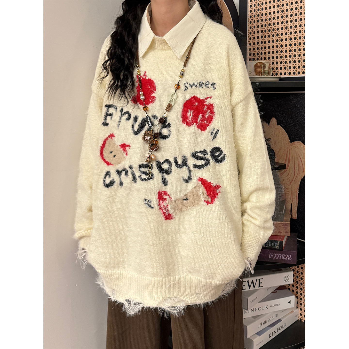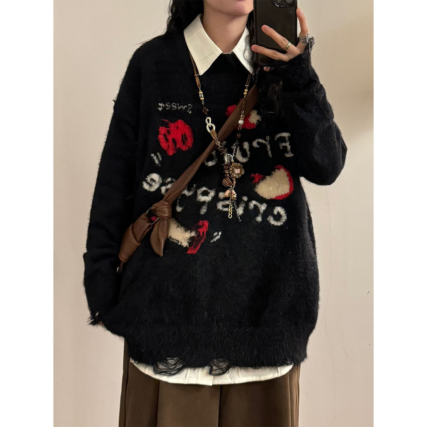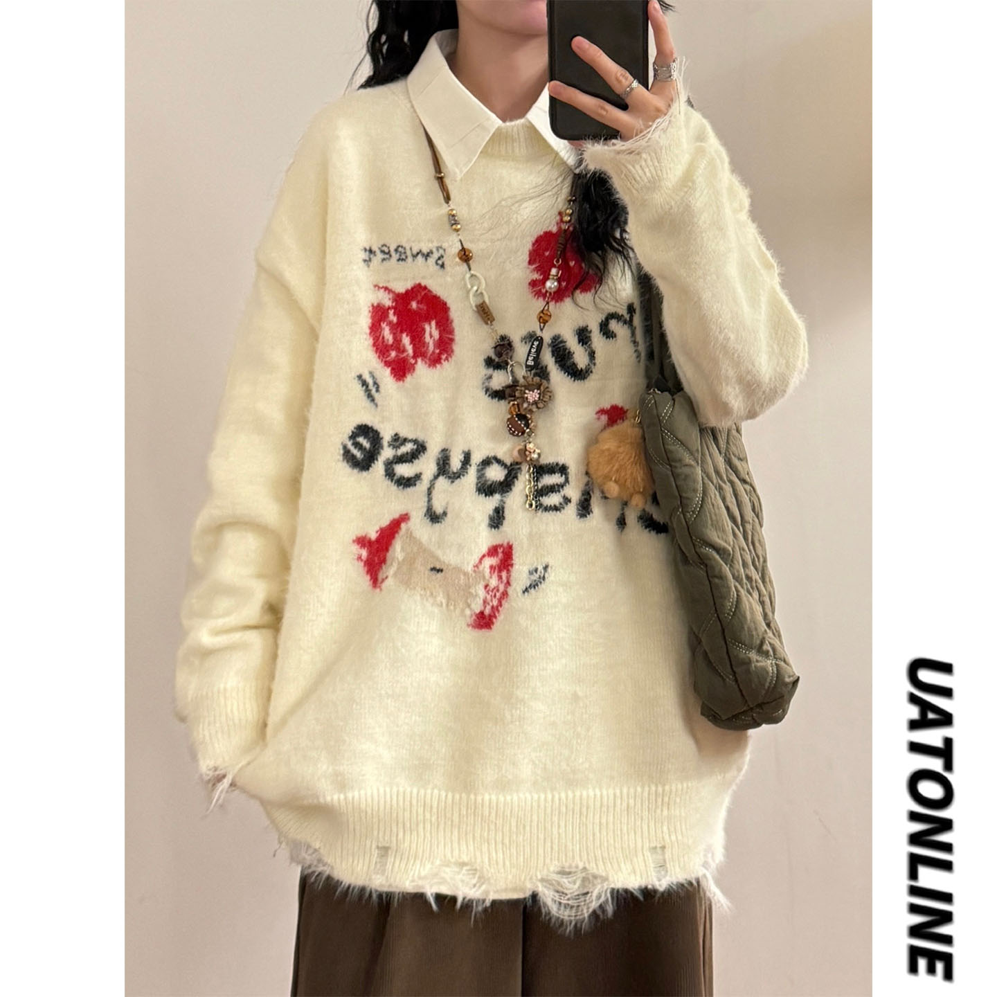 【トップス】秋冬 ねこ柄 破れ風 ダメージニット レトロ かわいい ゆったり 男女兼用 セーター【FCシリーズ】