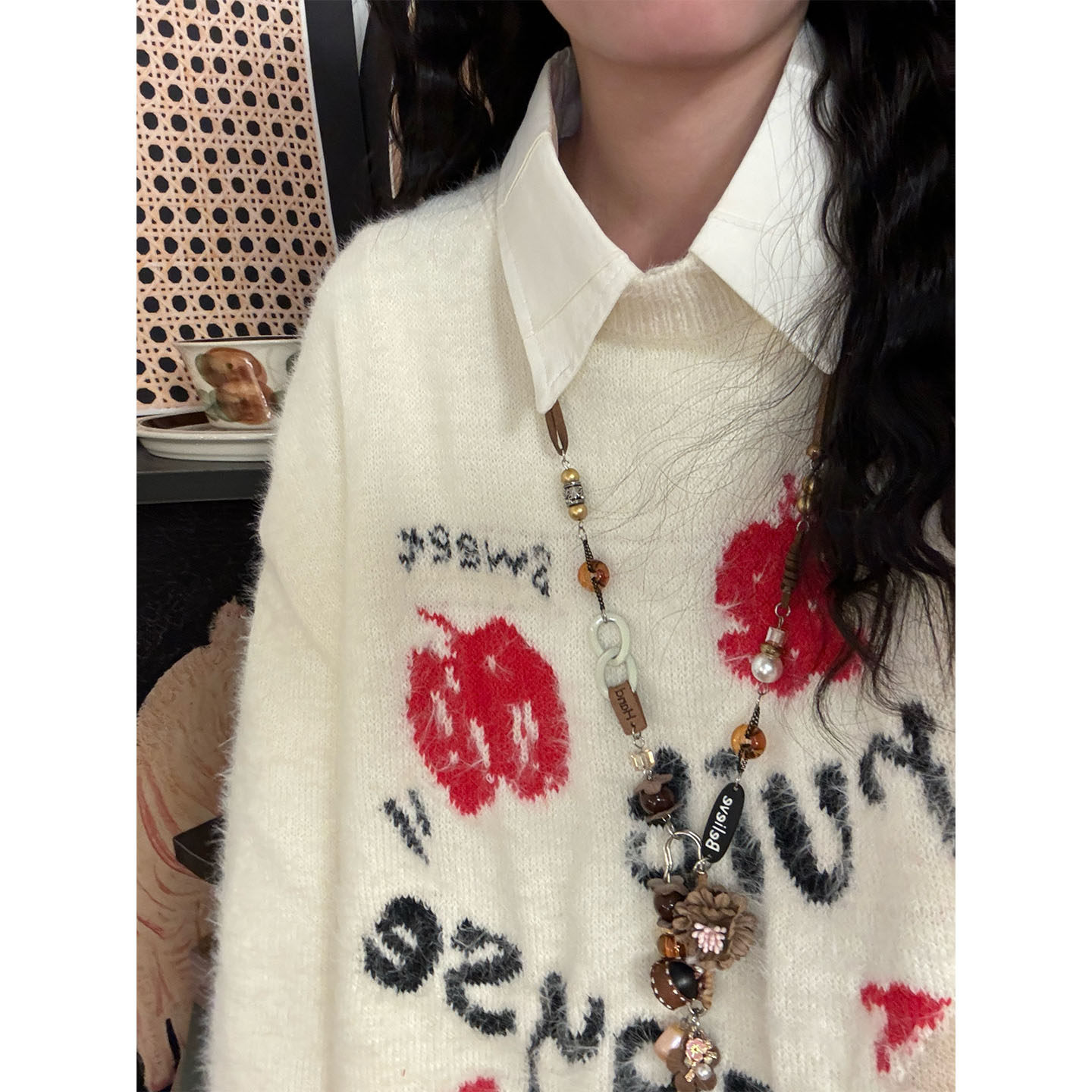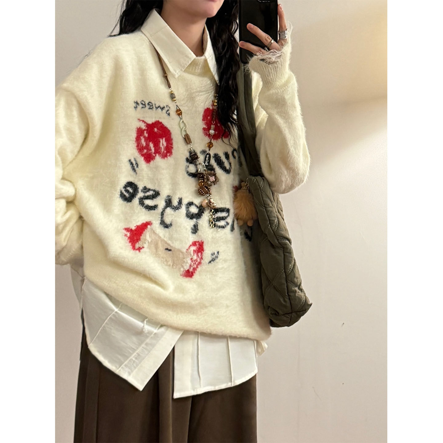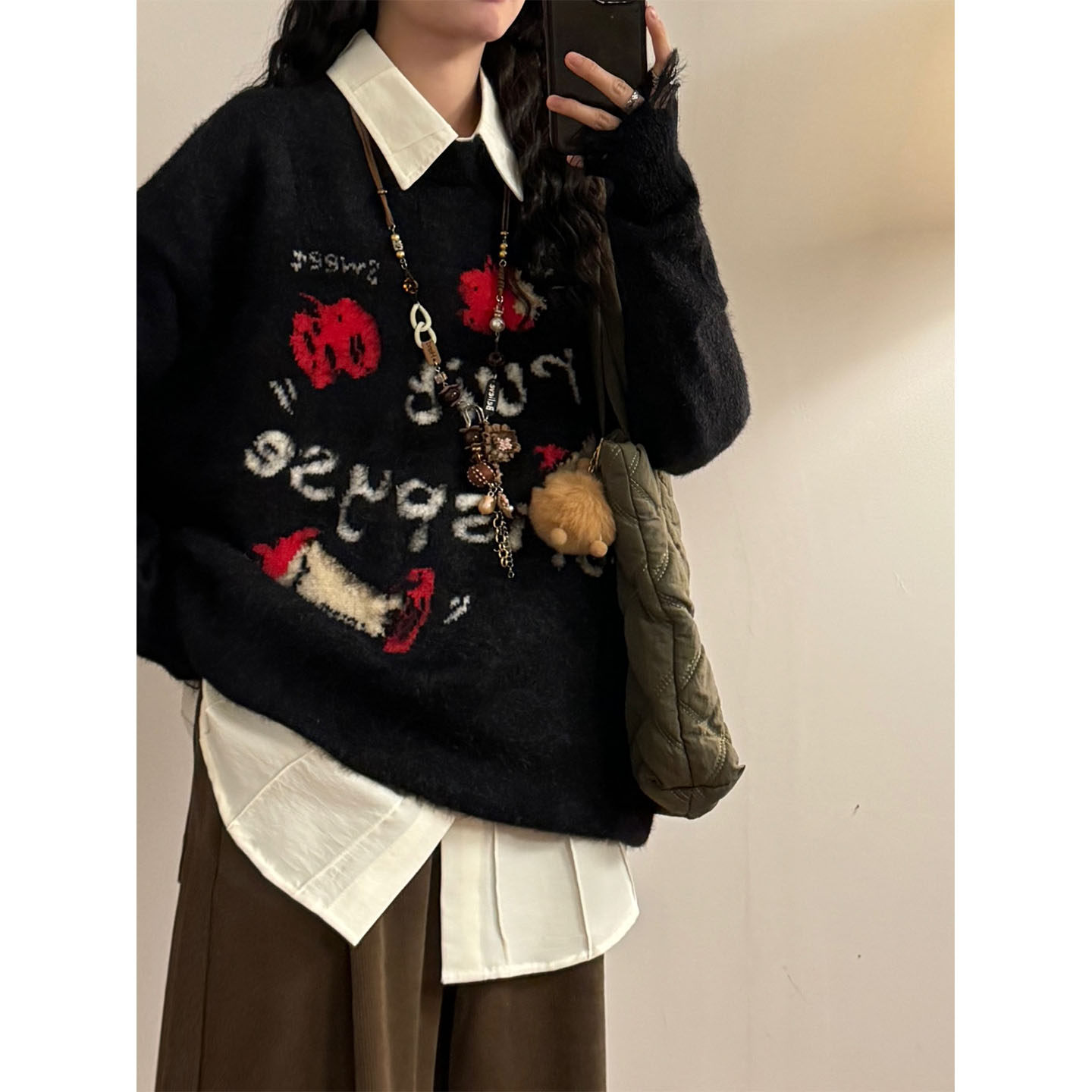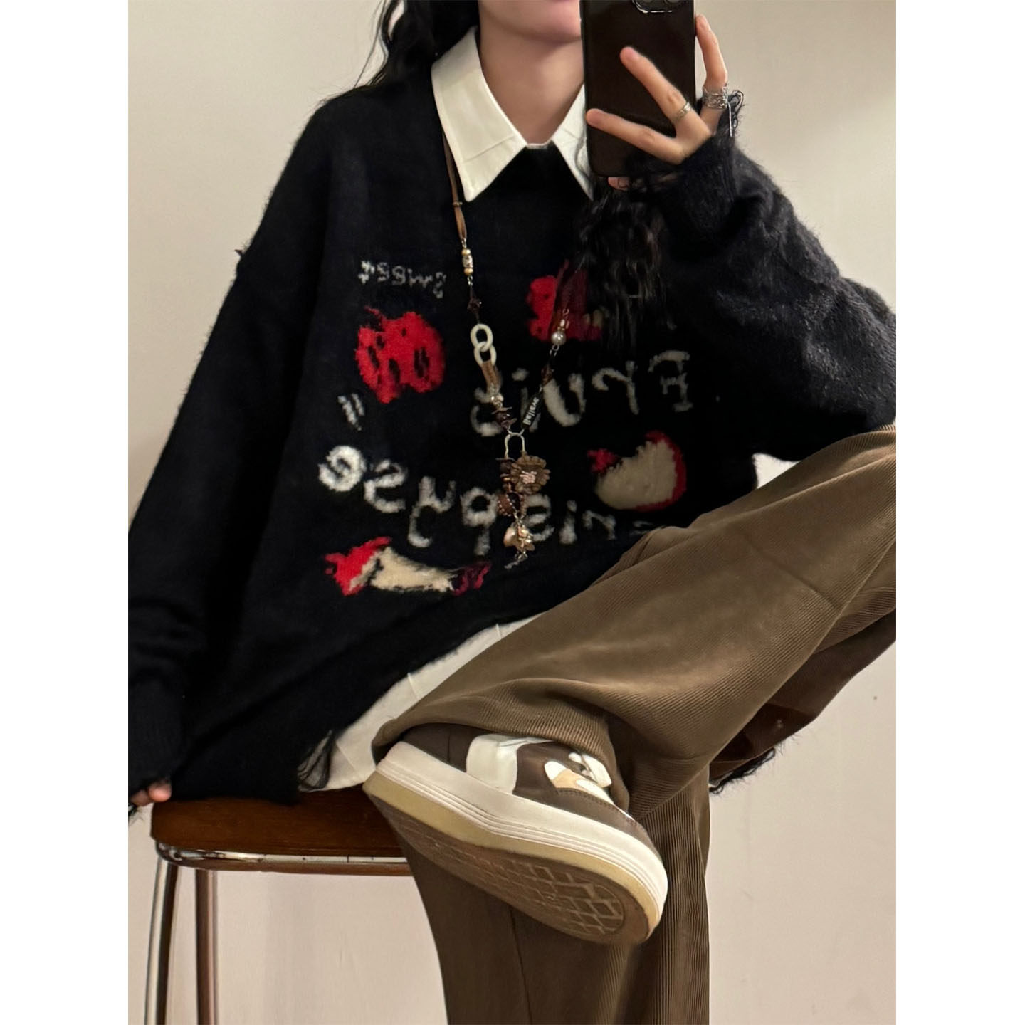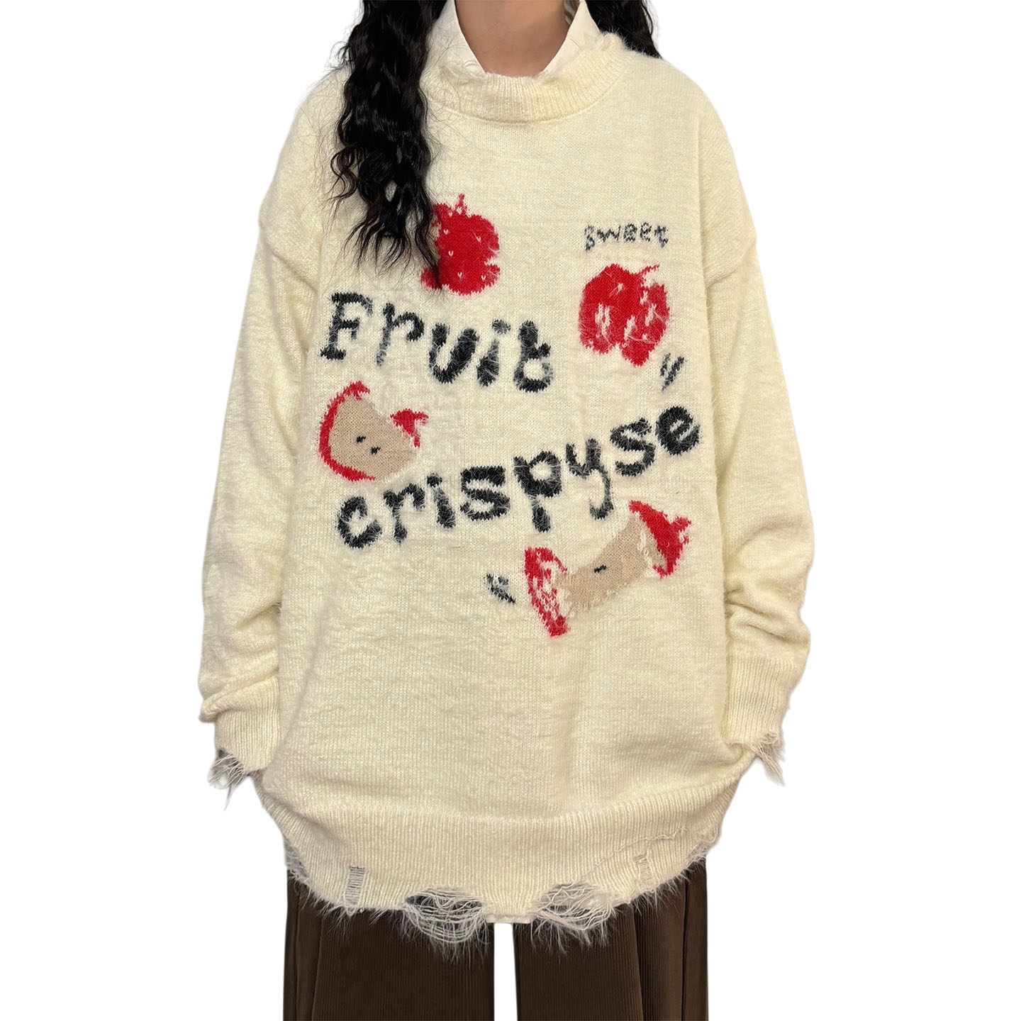 【トップス】秋冬 ねこ柄 破れ風 ダメージニット レトロ かわいい ゆったり 男女兼用 セーター【FCシリーズ】