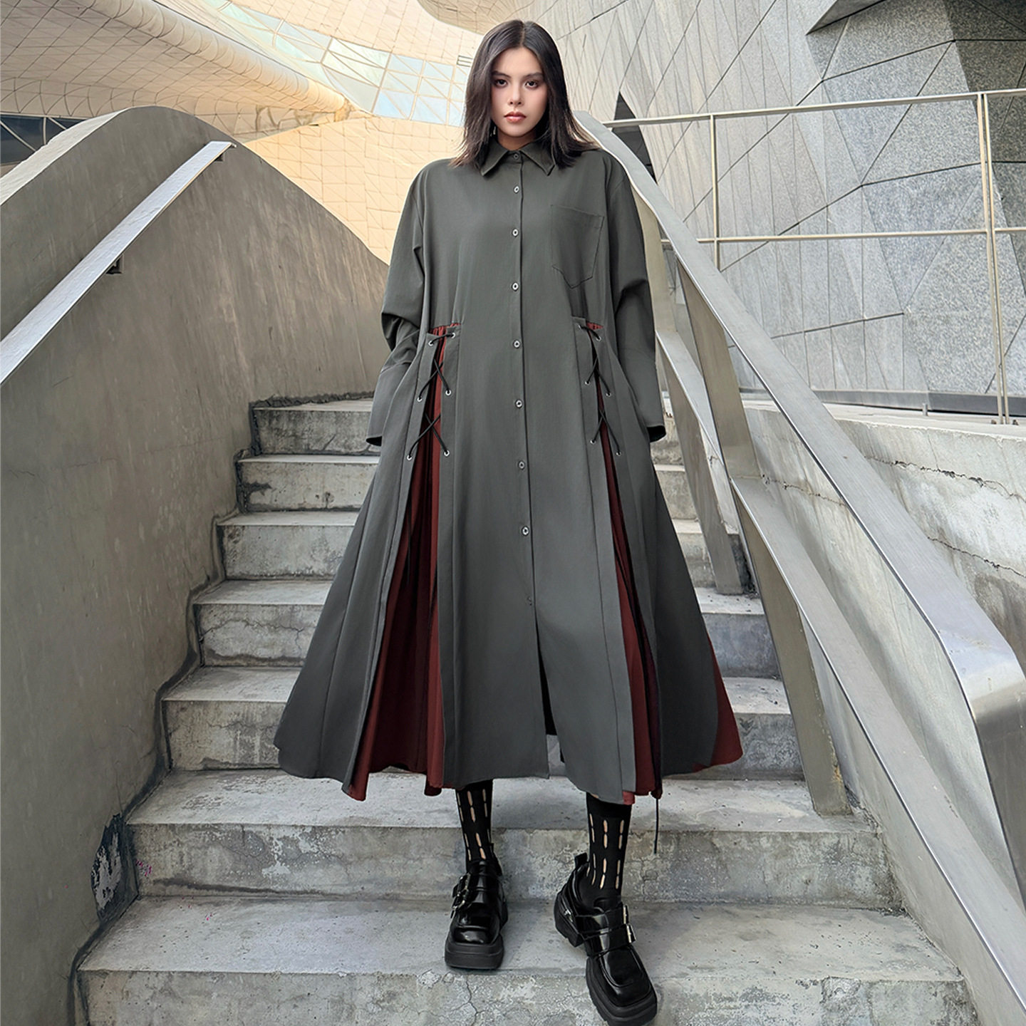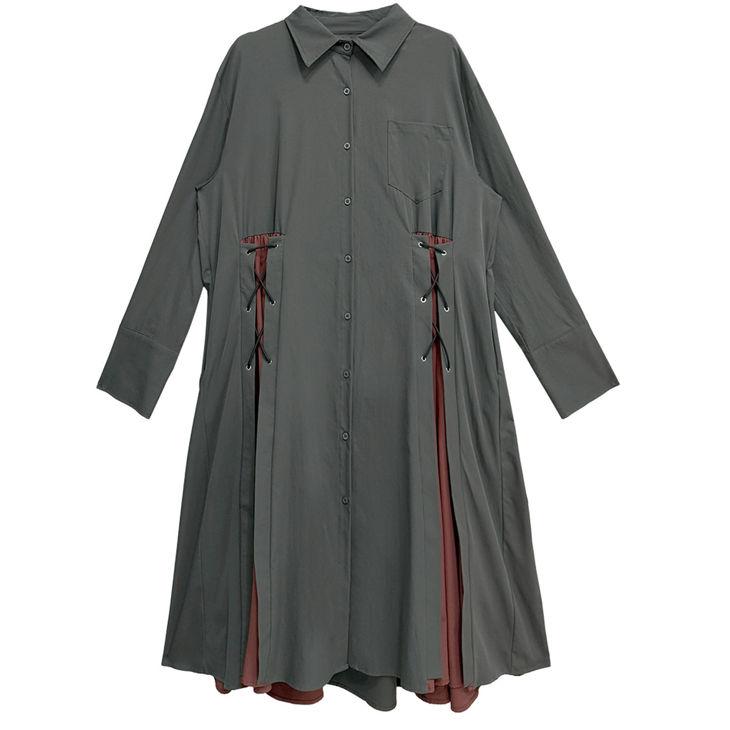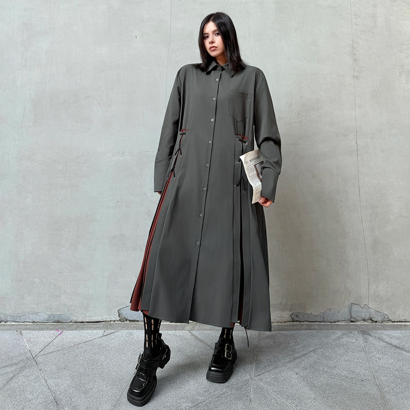 【商品名】【ワンピース】配色デザイン ポロ襟 ゆったり 上品 すっきり見え Aラインスカート 【AHシリーズ】