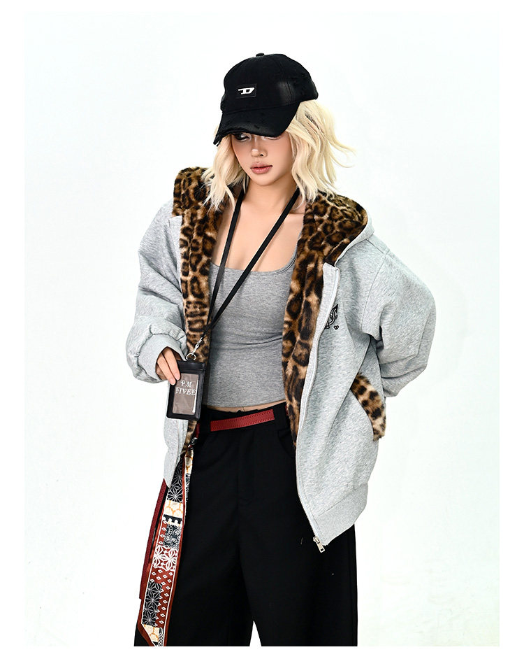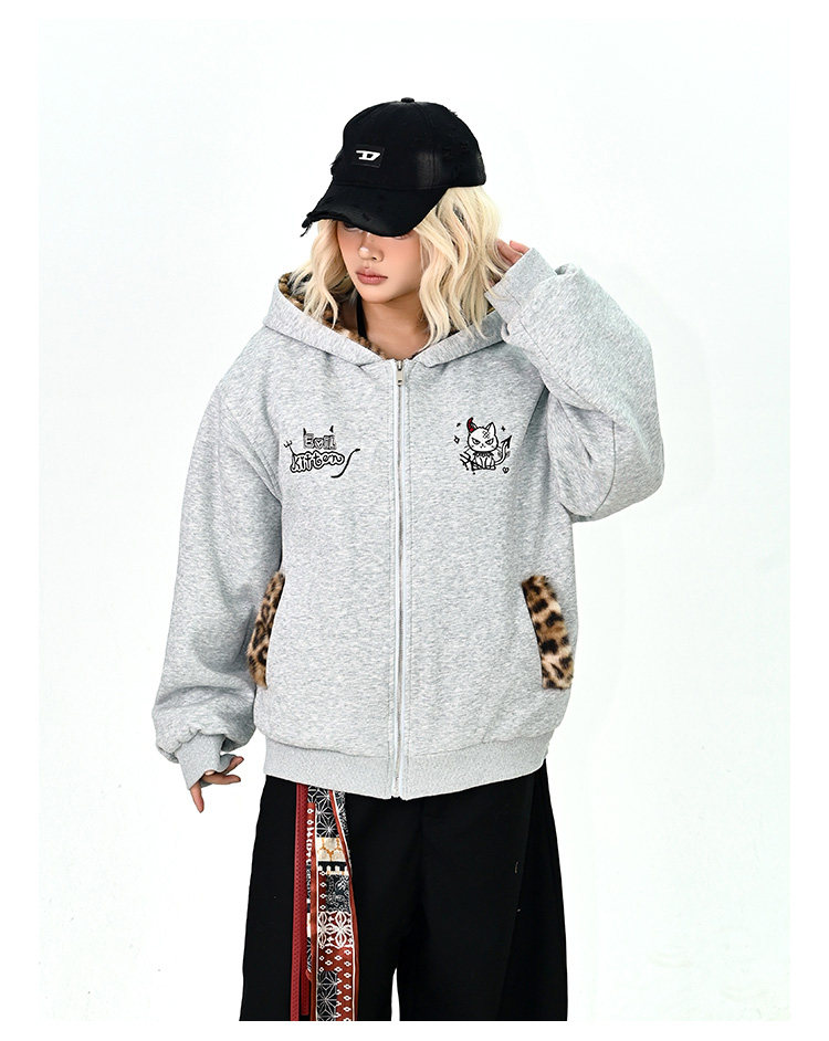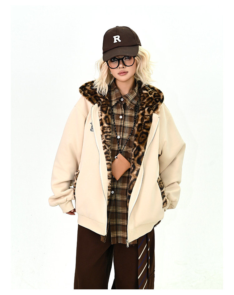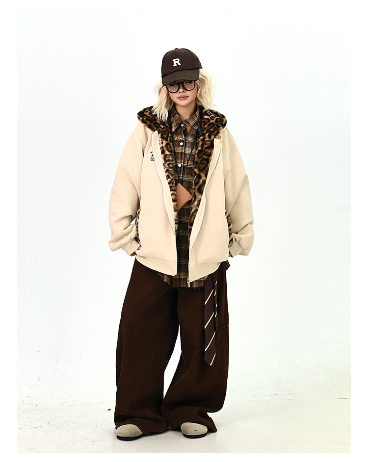 【アウター】アメリカンヴィンテージ レオパード ロゴ ジップアップパーカー ゆったり 男女兼用 カジュアルカーディガン【FCシリーズ】