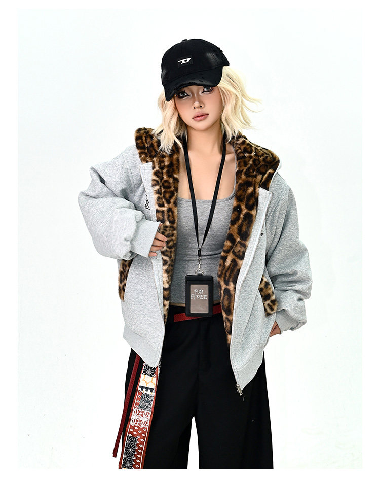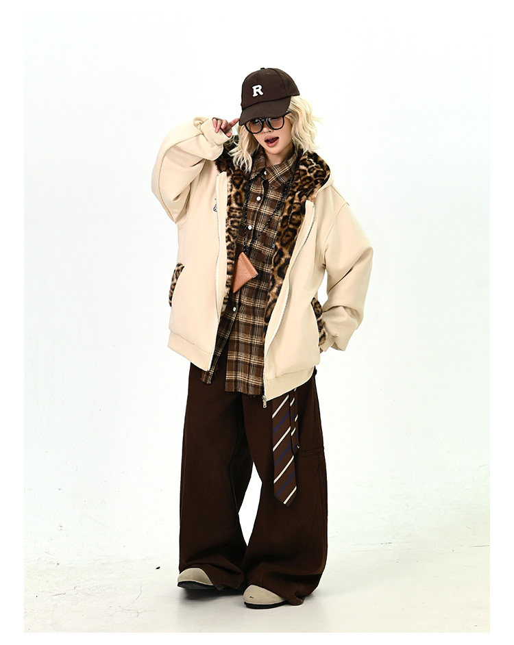 【商品名】【アウター】レオパード 猫耳 フード付き 綿入れコート 冬 ゆったりBF風 アメカジ 学院風 カップルペア【FCシリーズ】