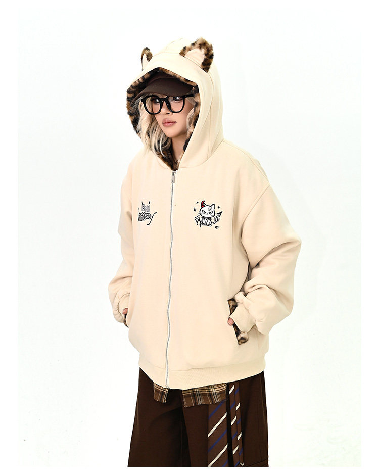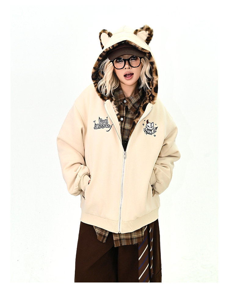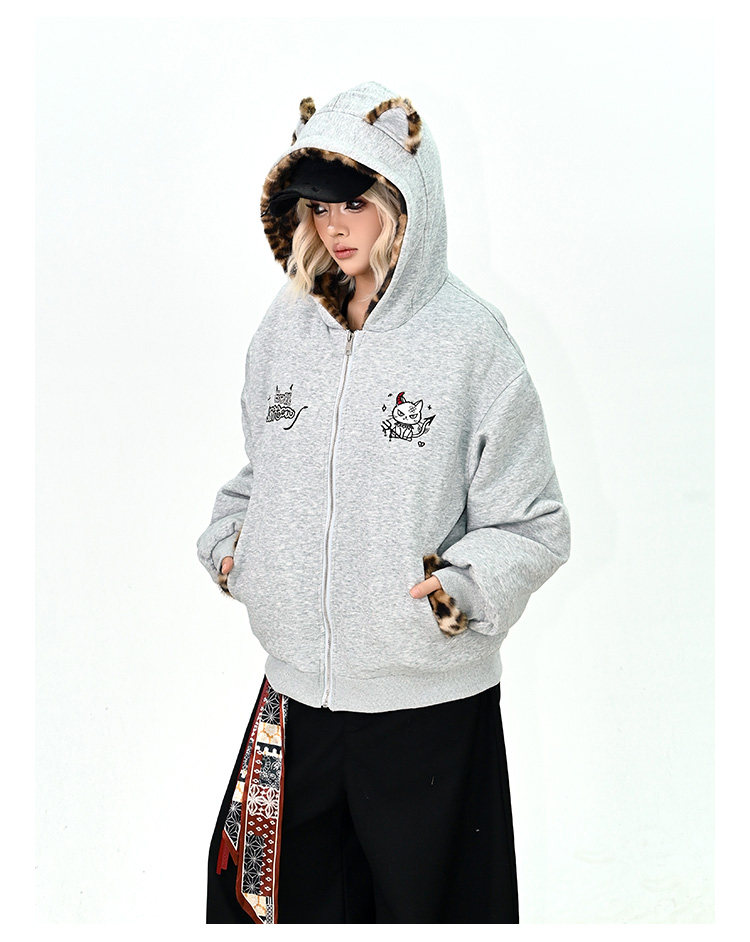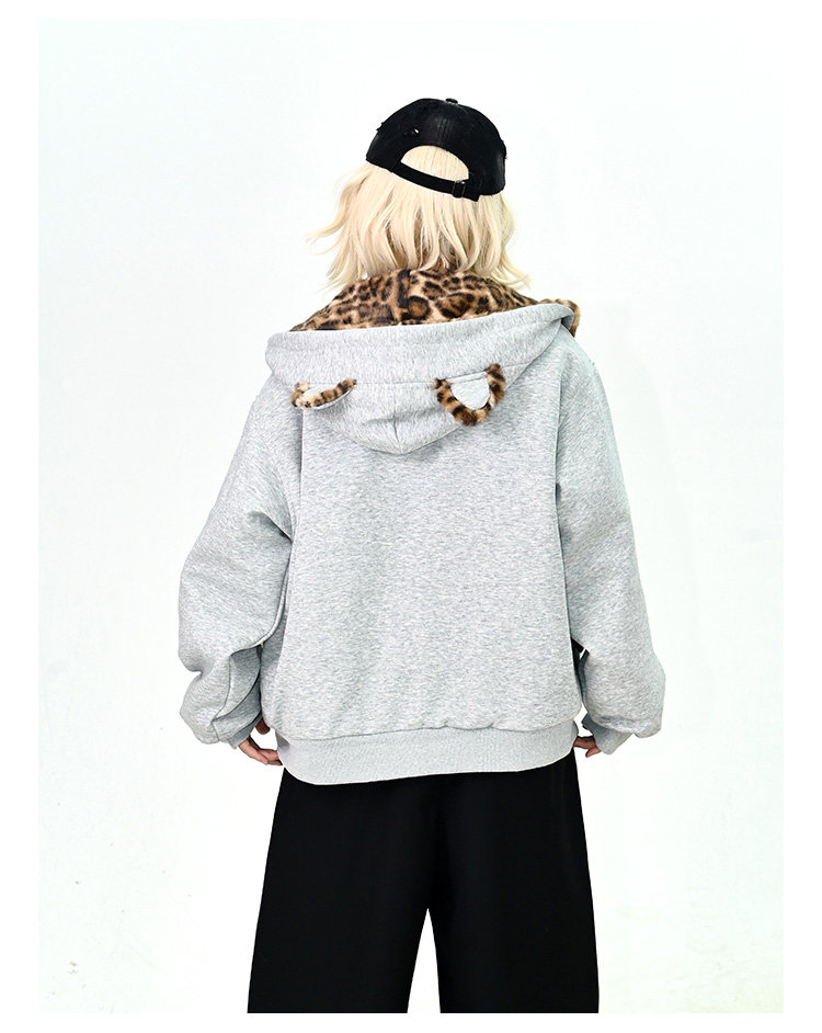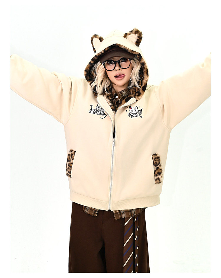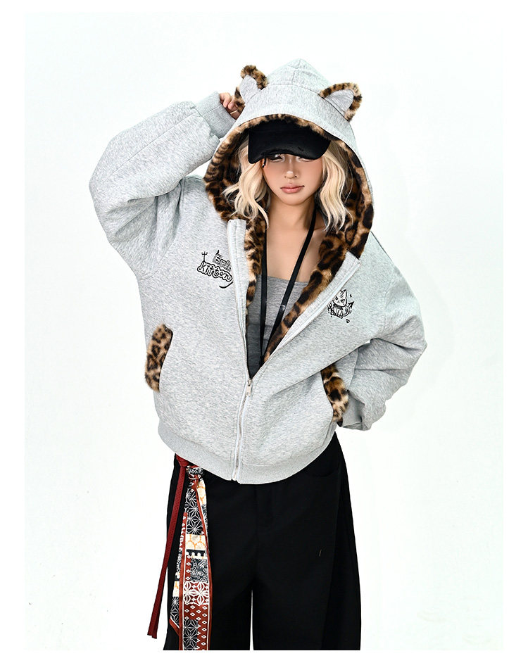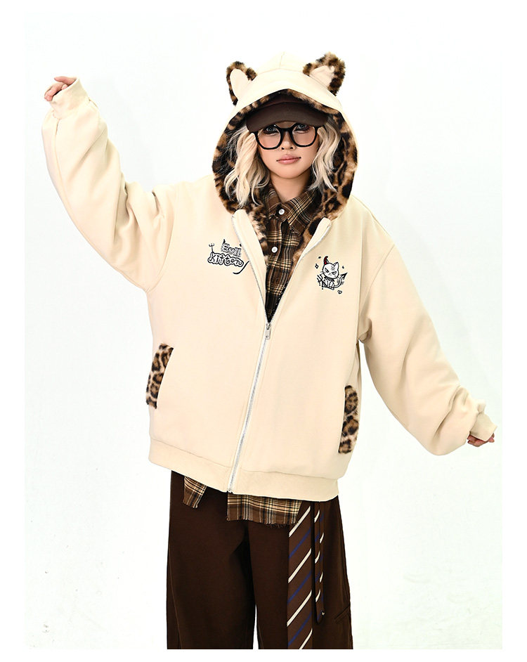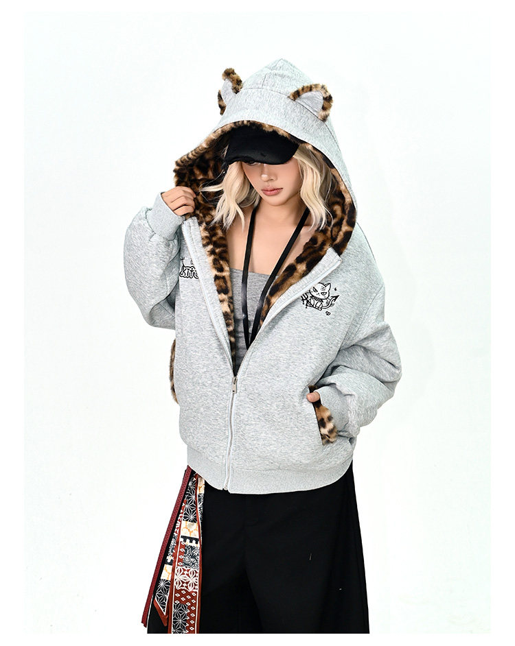 【アウター】レオパード 猫耳 フード付き 綿入れコート 冬 ゆったりBF風 アメカジ 学院風 カップルペア【FCシリーズ】
