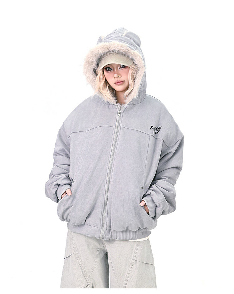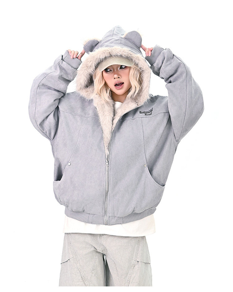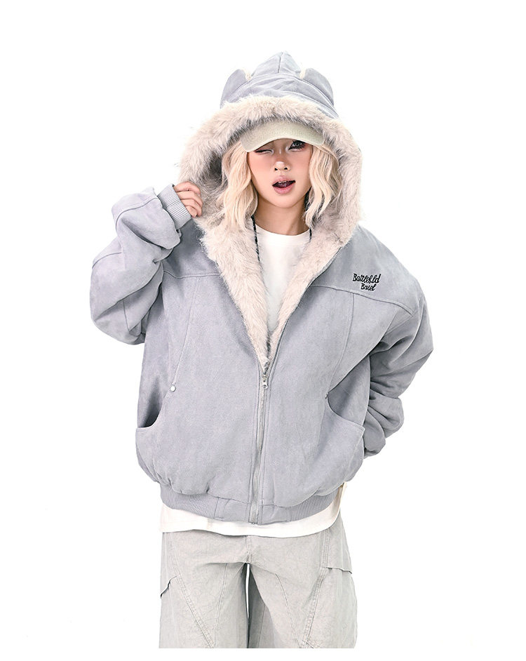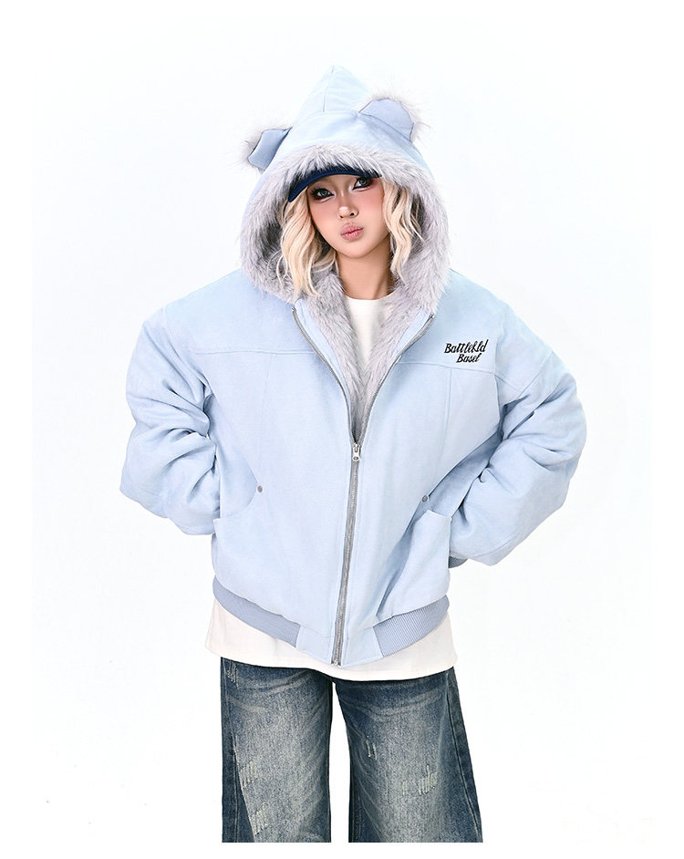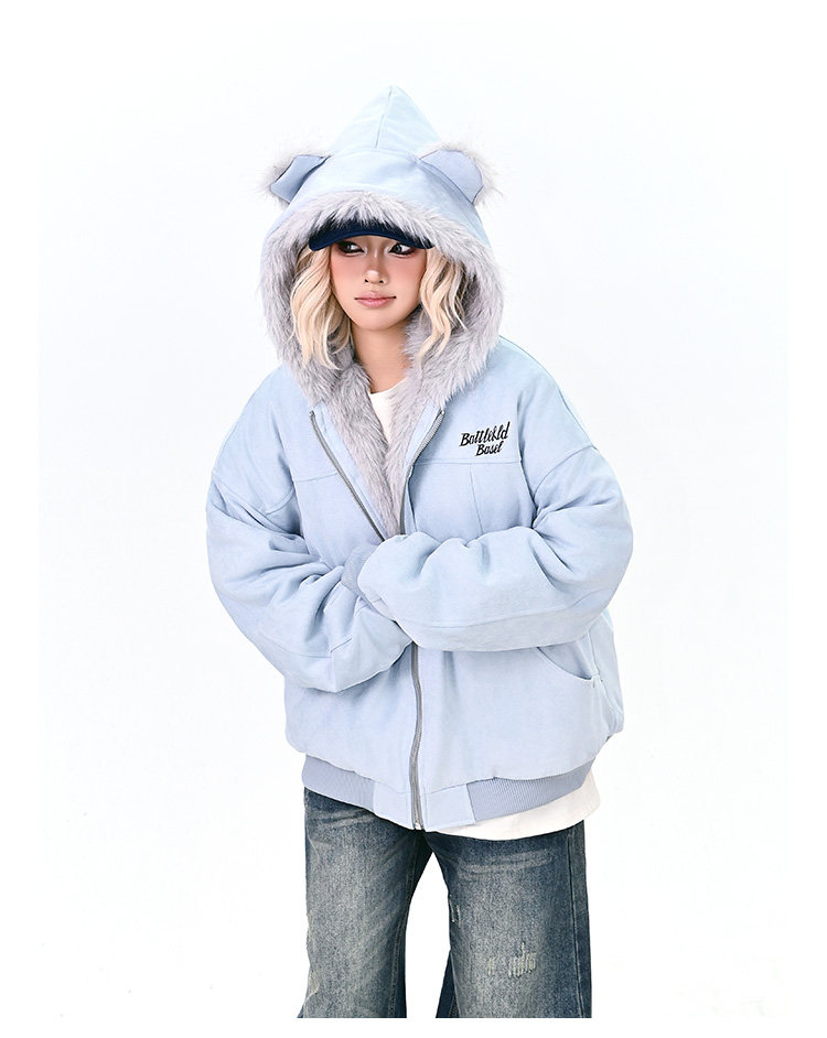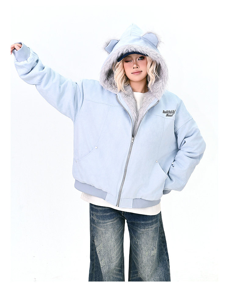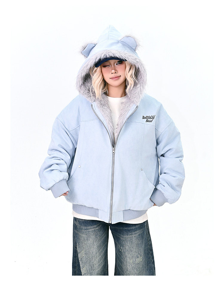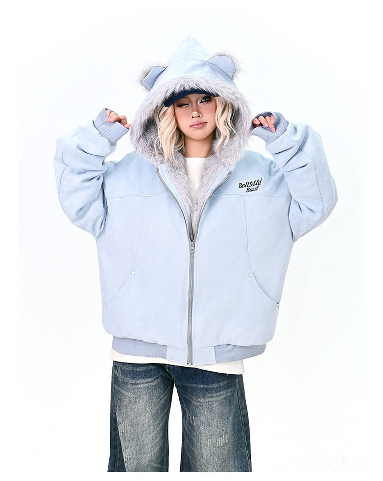 【商品名】【アウター】もこもこ耳付きフードコート レディース ゆったりBF風 アメカジ 学院風 綿入れコート 【FCシリーズ】