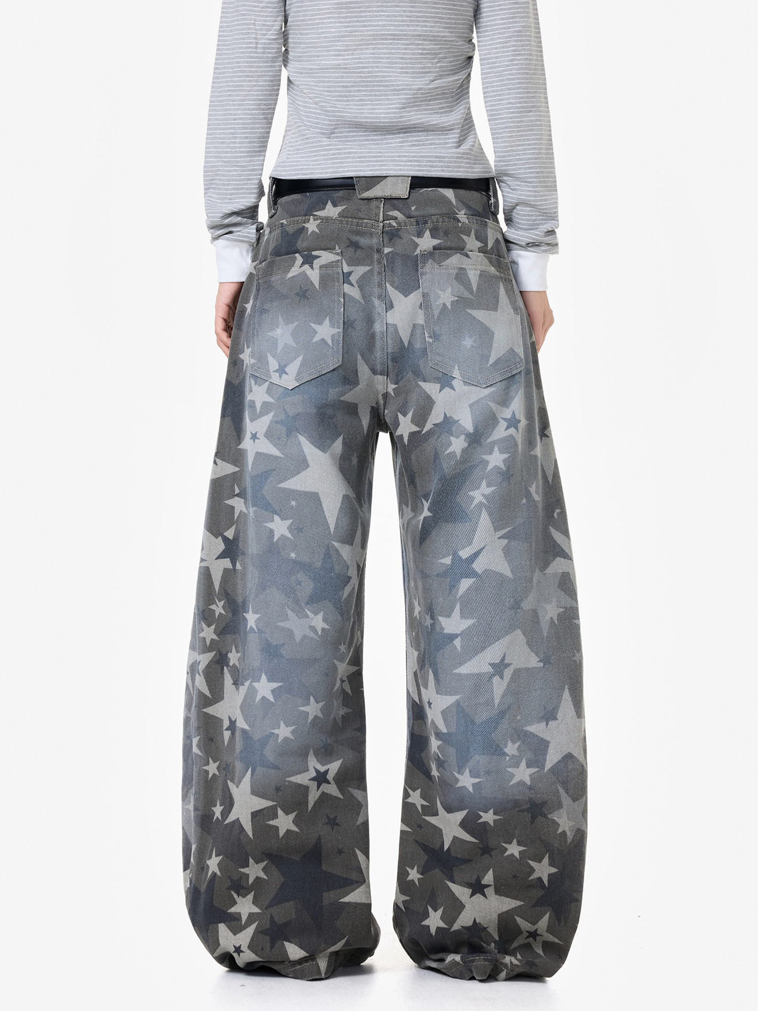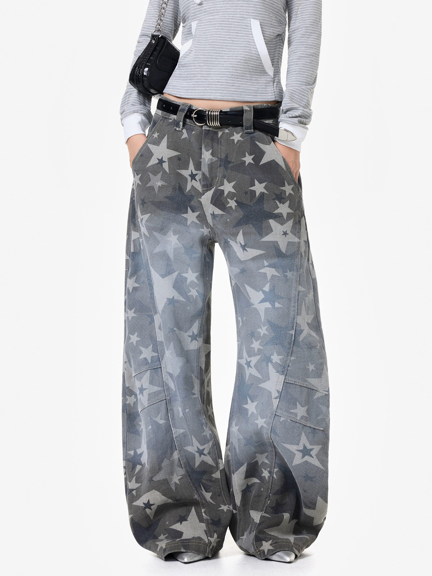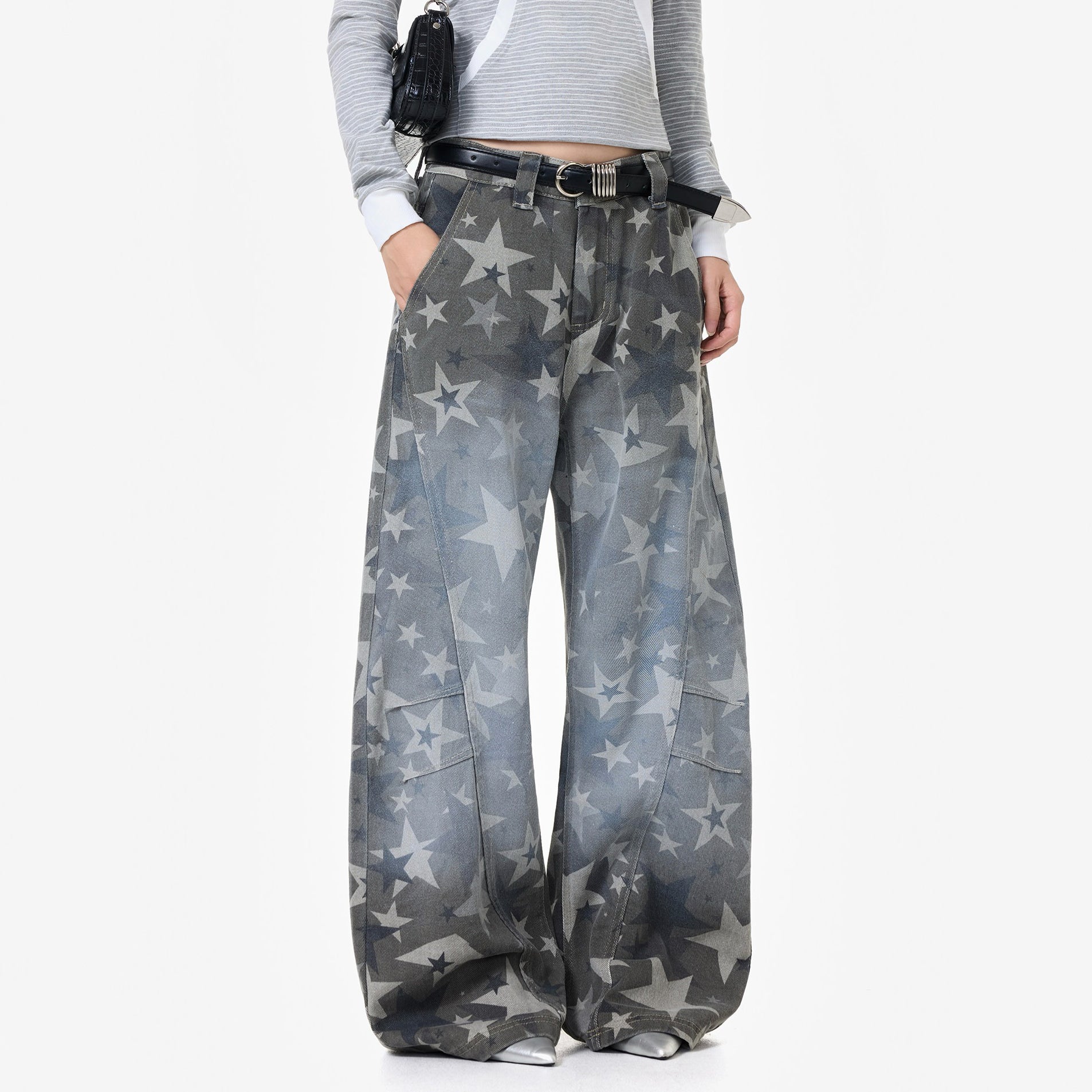 【商品名】【ボトムス】アメリカンストリート スター総柄 ウォッシュ加工 カーブデニム レディース ワイドパンツ【FCシリーズ】