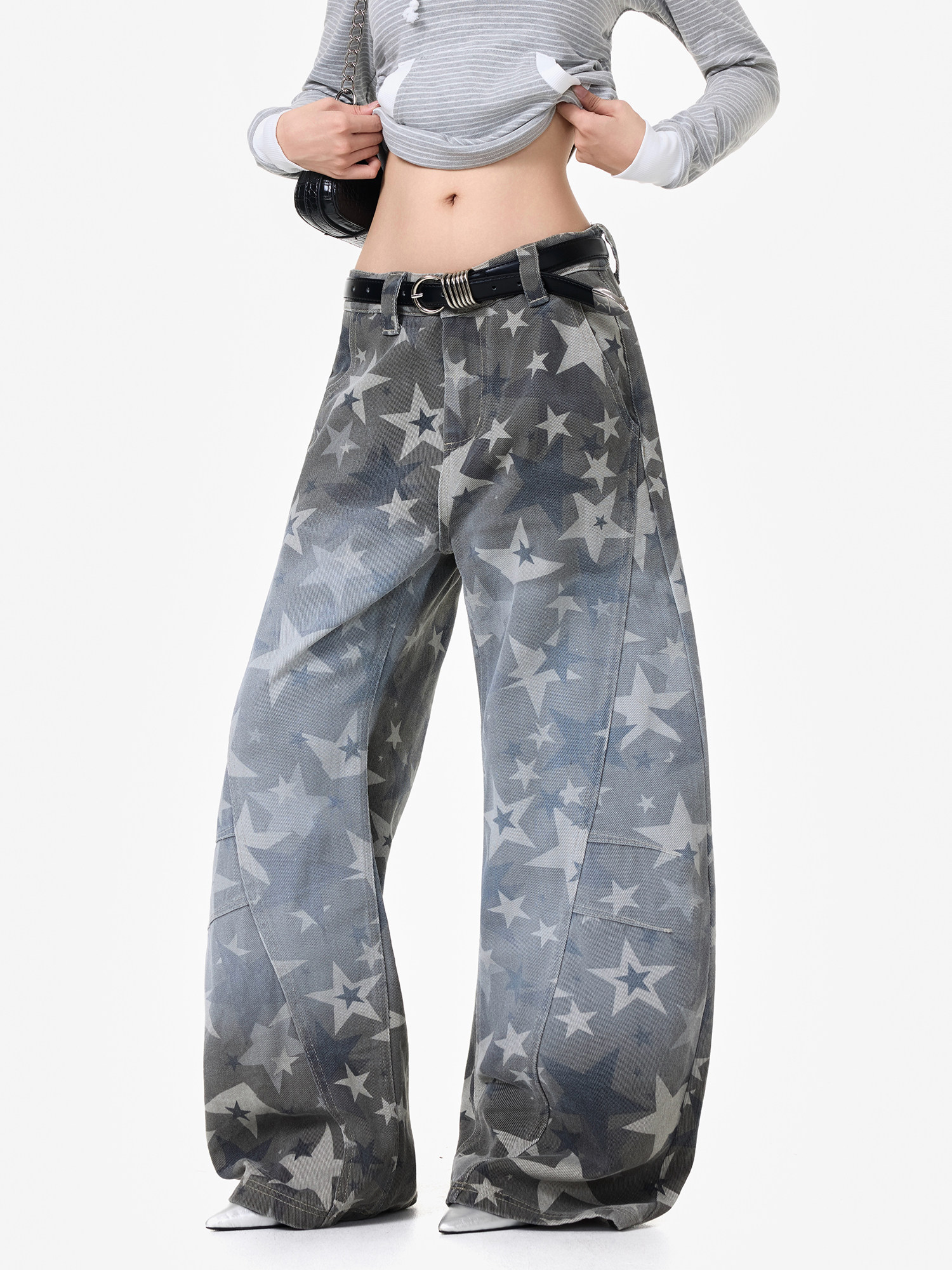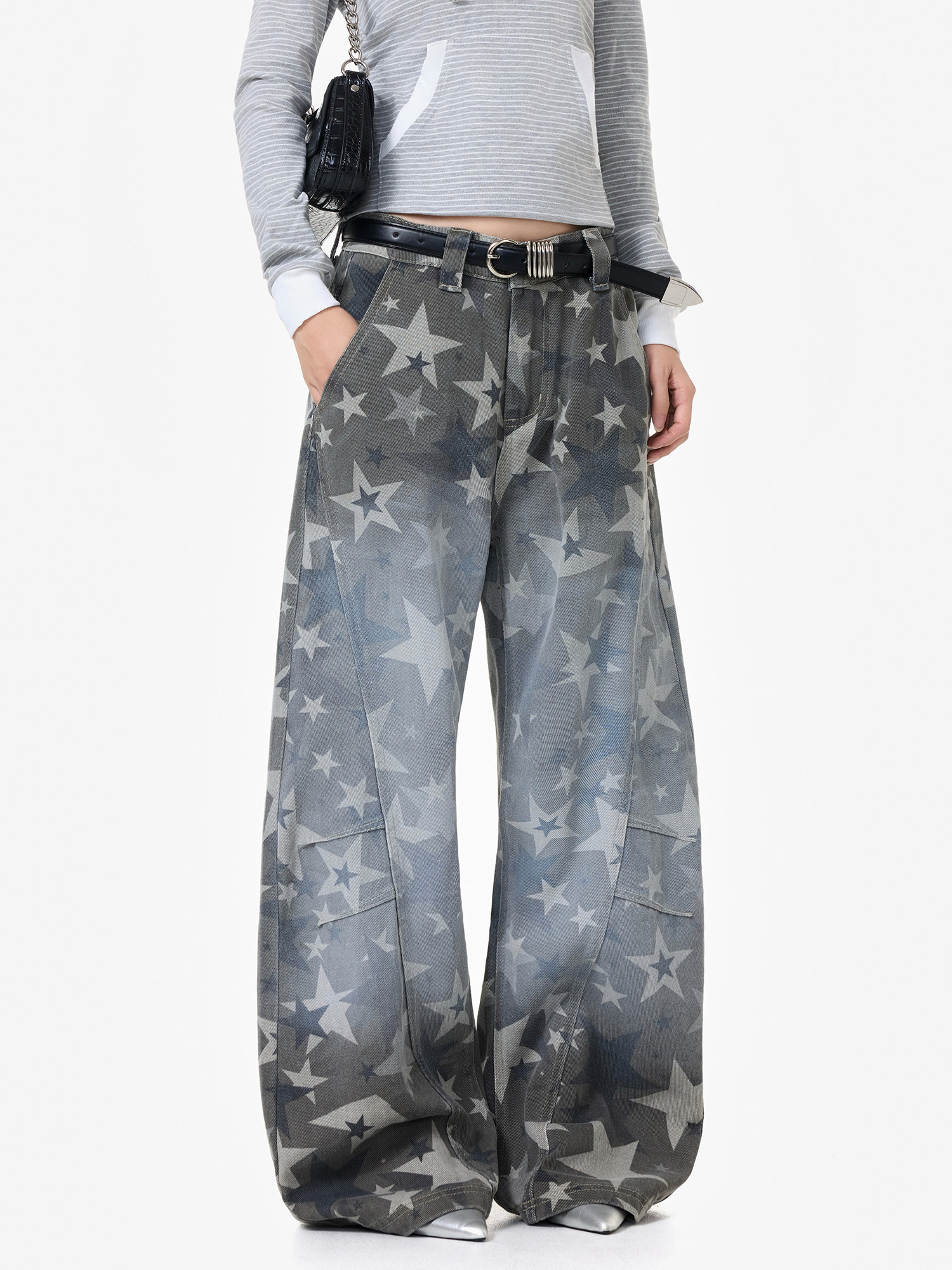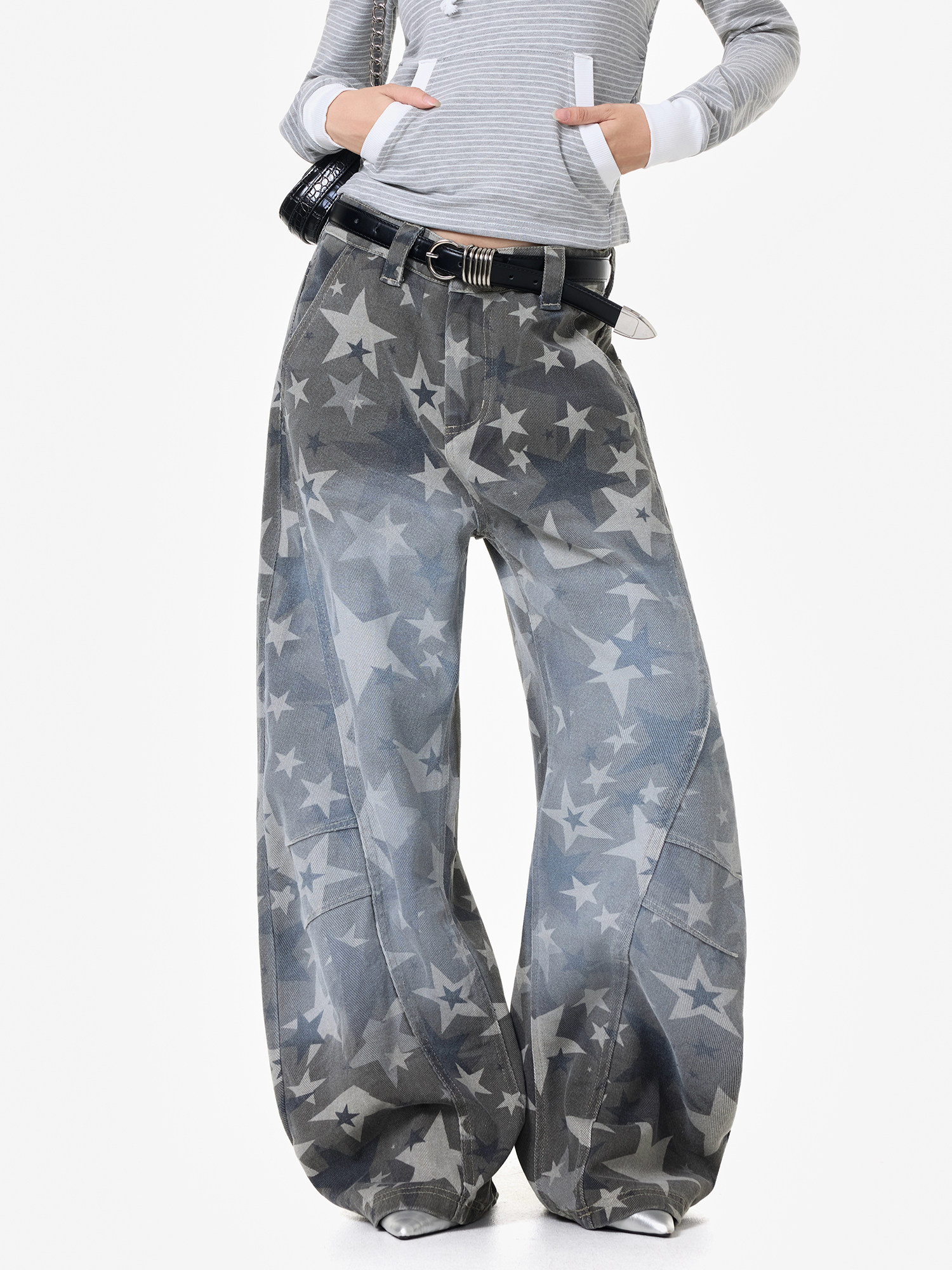 【商品名】【ボトムス】アメリカンストリート スター総柄 ウォッシュ加工 カーブデニム レディース ワイドパンツ【FCシリーズ】