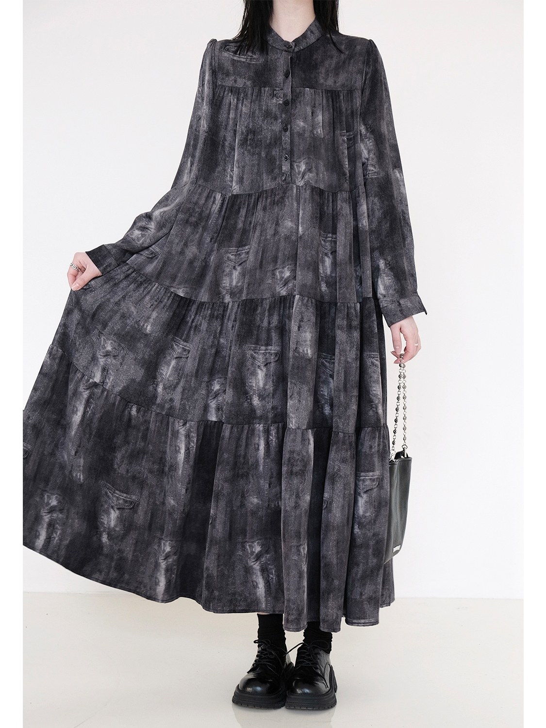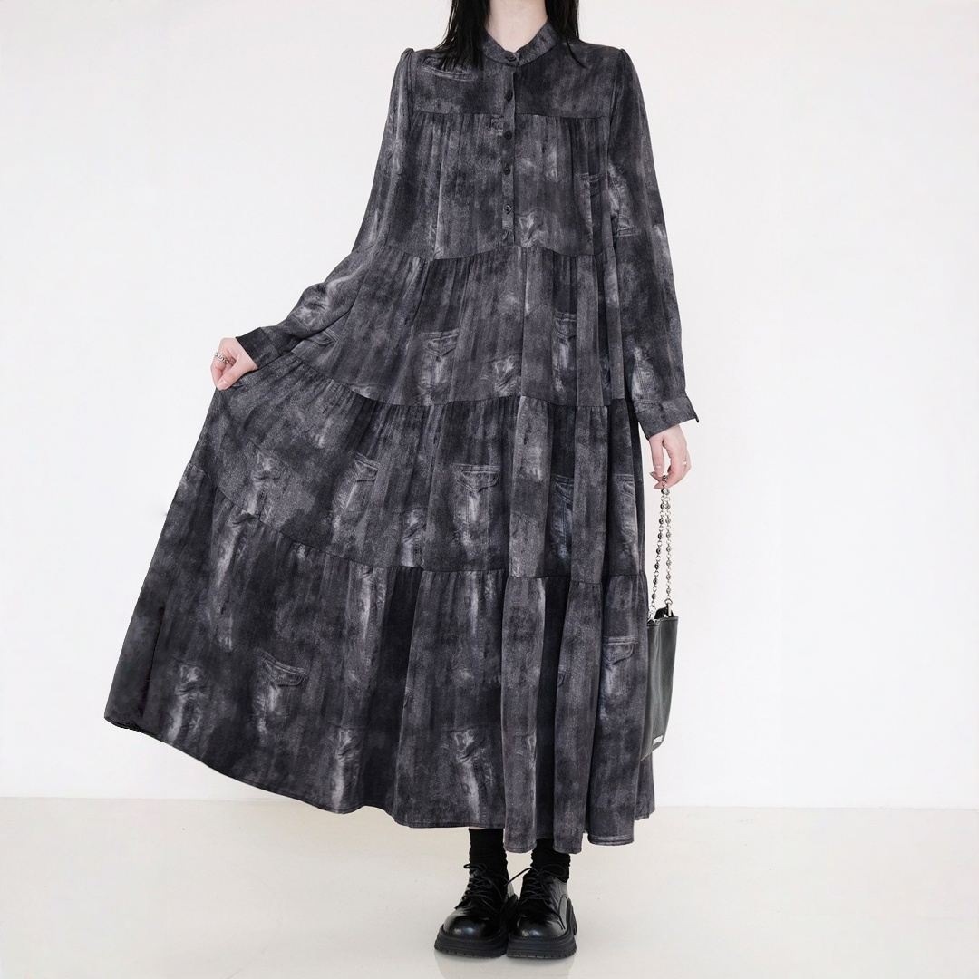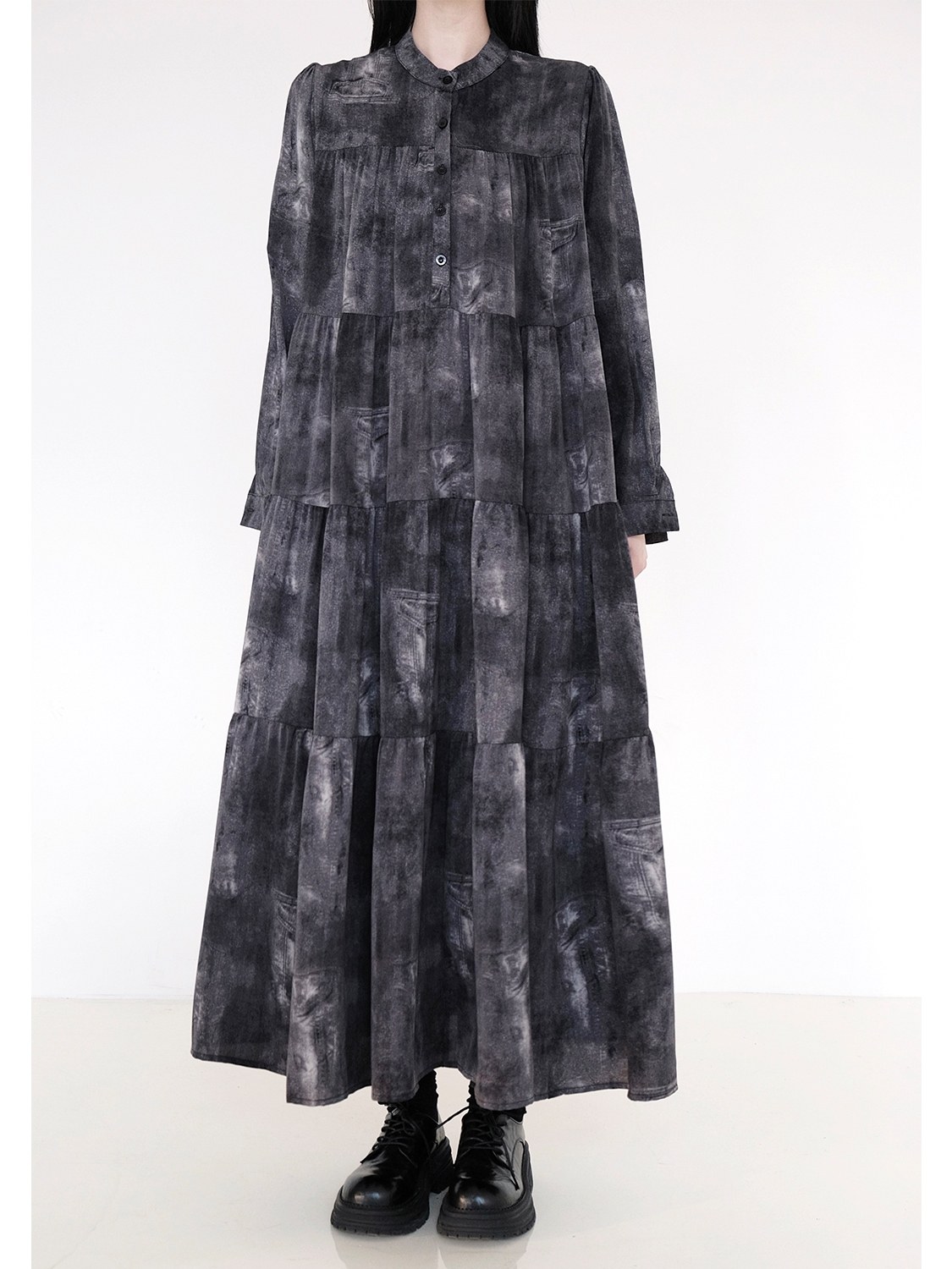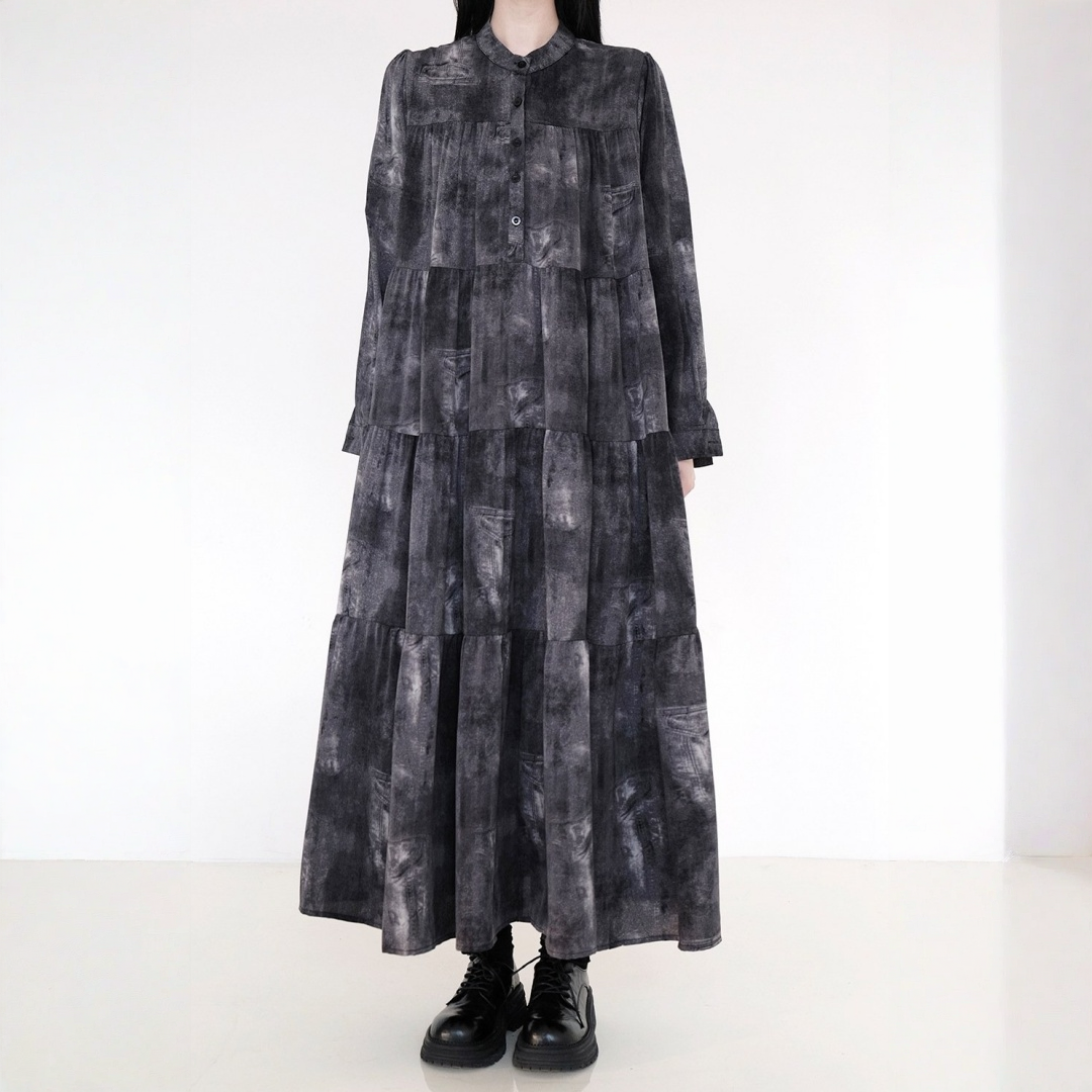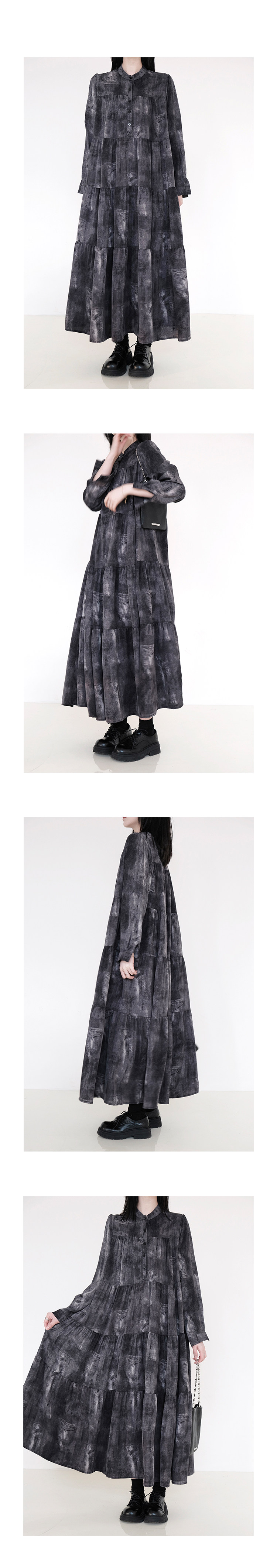 【ワンピース】タイダイ 体型カバー ダーク系 シワになりにくい 長袖 ワンピース 【AHシリーズ】