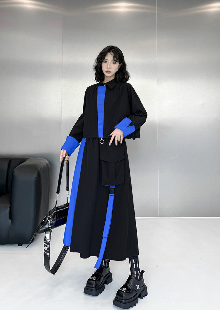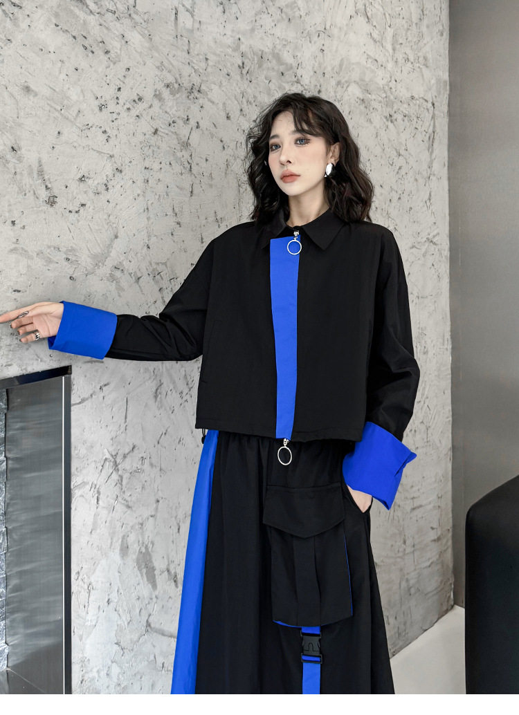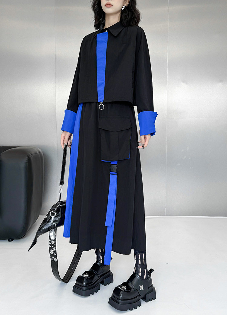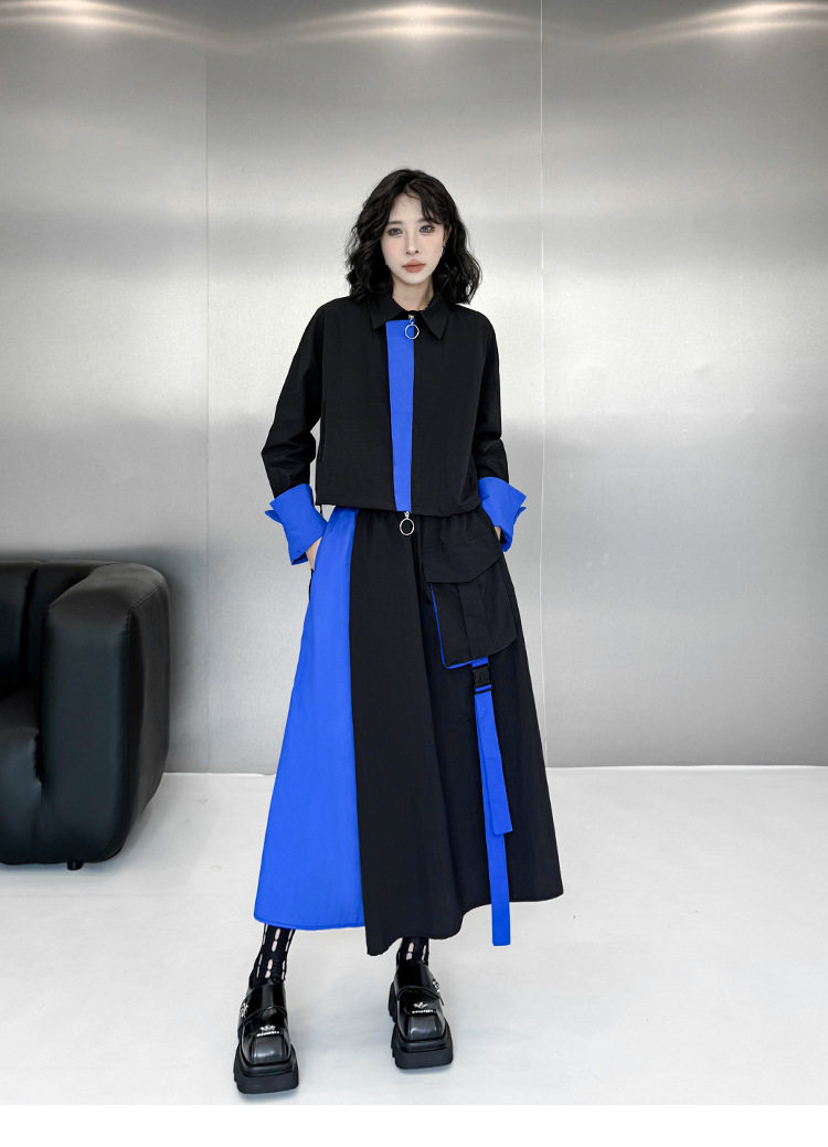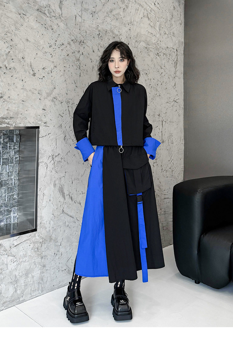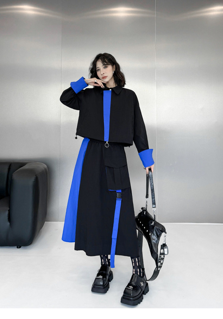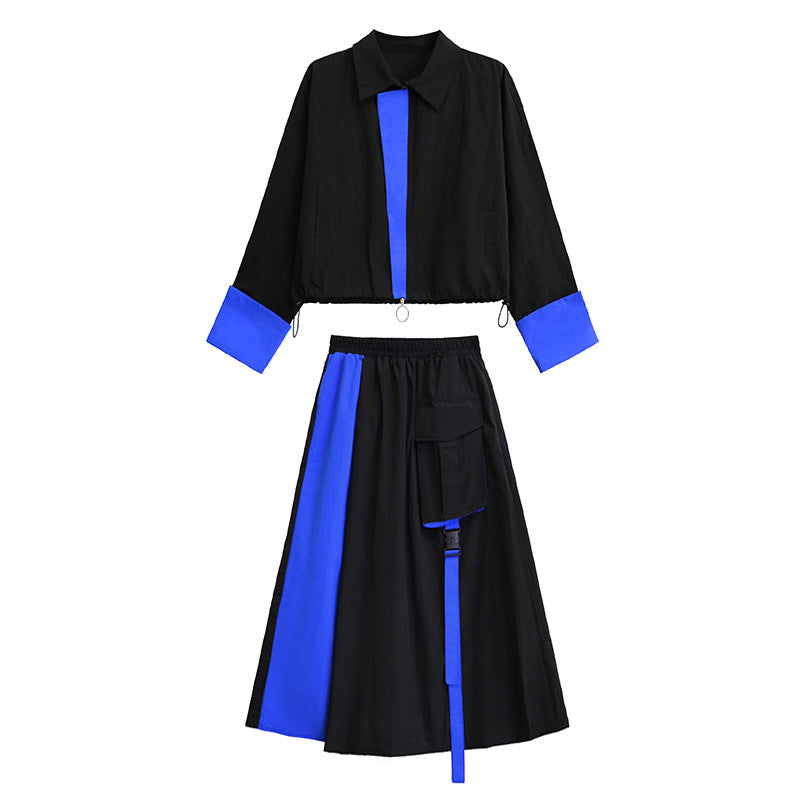 【商品名】2点セット!【セットアップ】モードデザイン 配色切替 ショートトップス+ウエストゴム スカート 上下セット レディース 春秋【AHシリーズ】