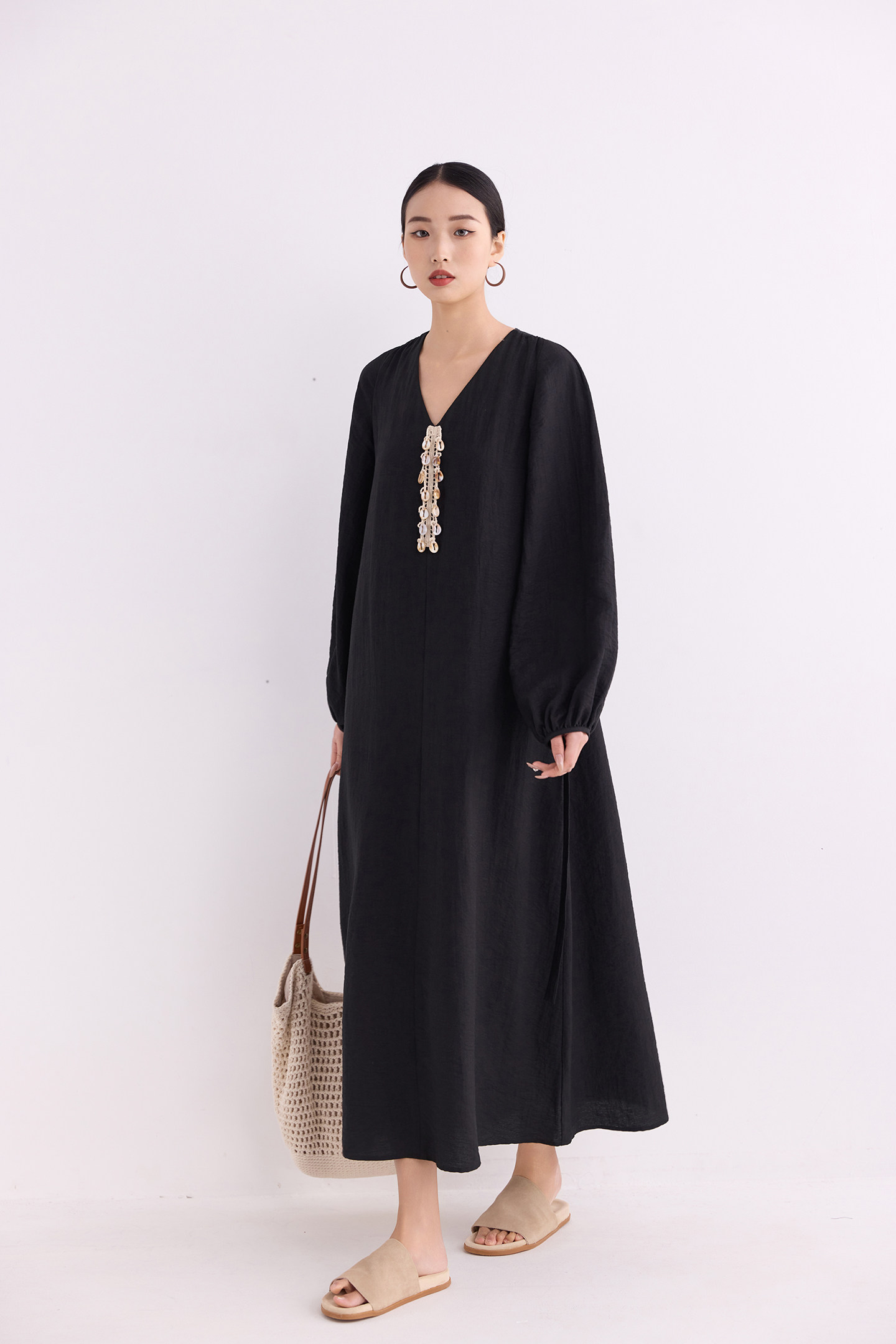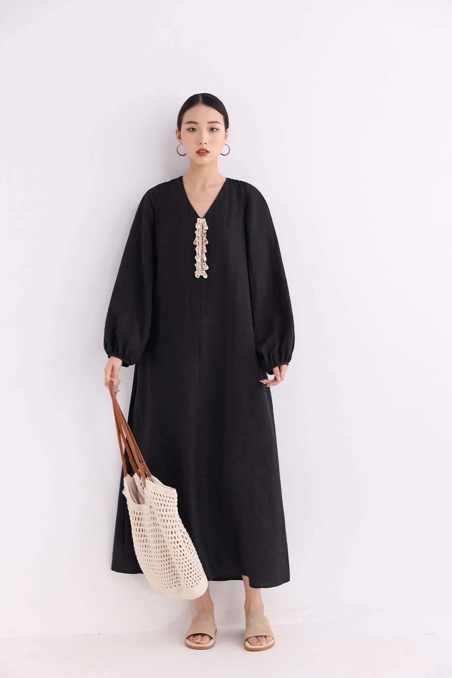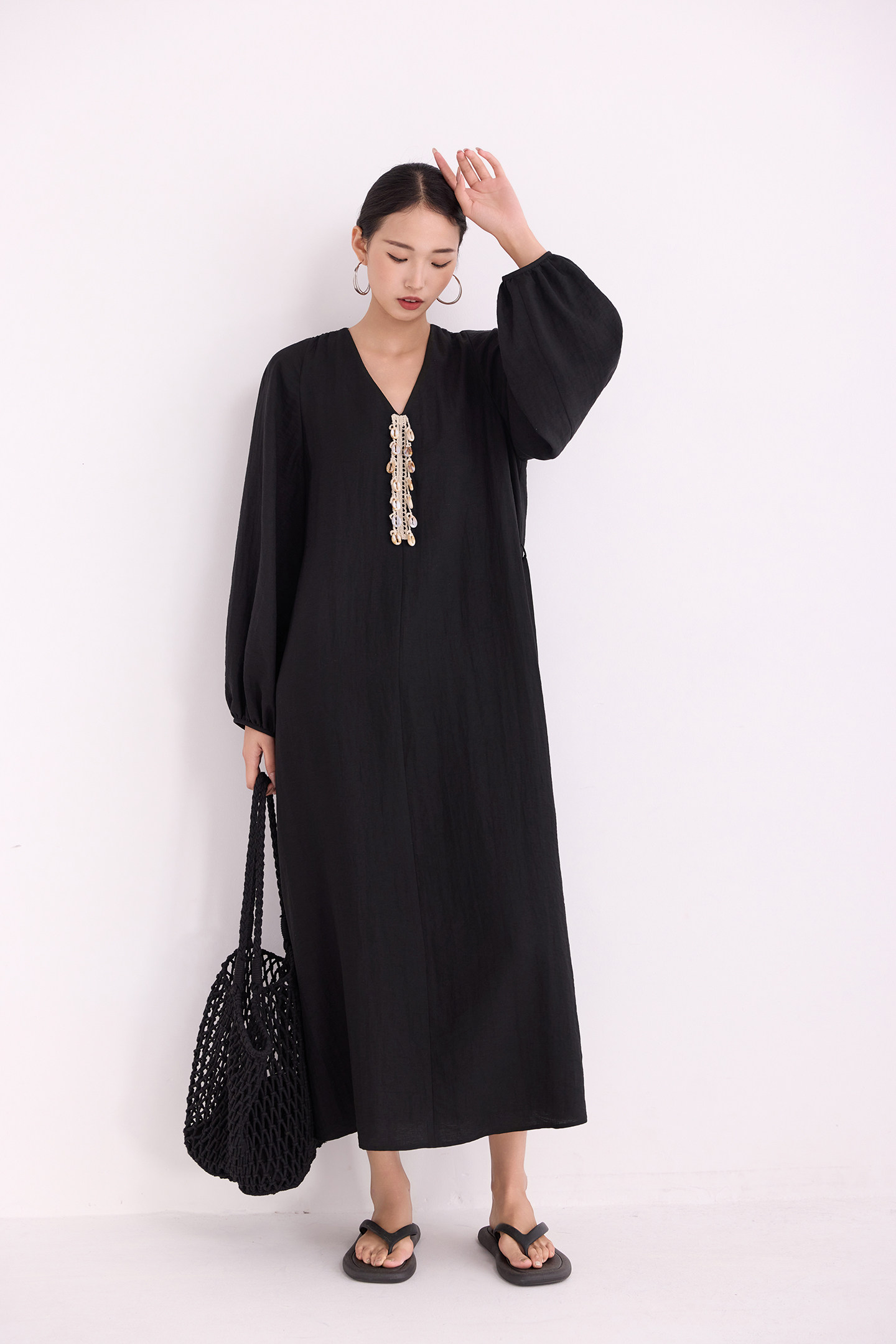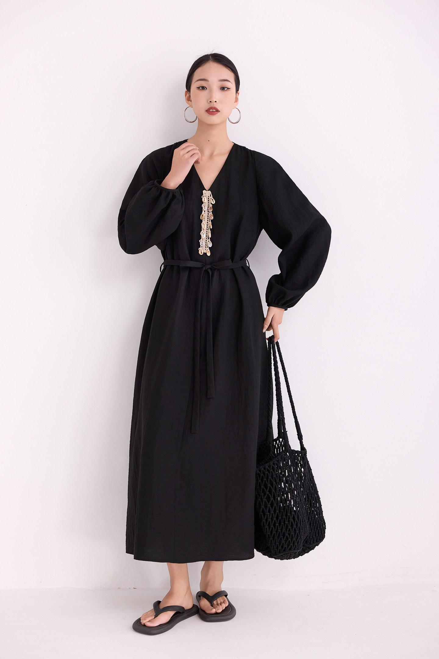【ワンピース】ブラックVネック シェルボタン付き 長袖Aライン ロングドレス レトロ&リラックス感漂うデザイン【JZシリーズ】