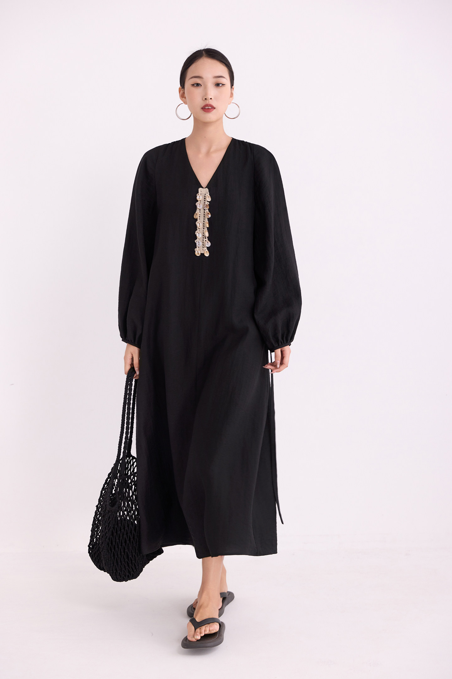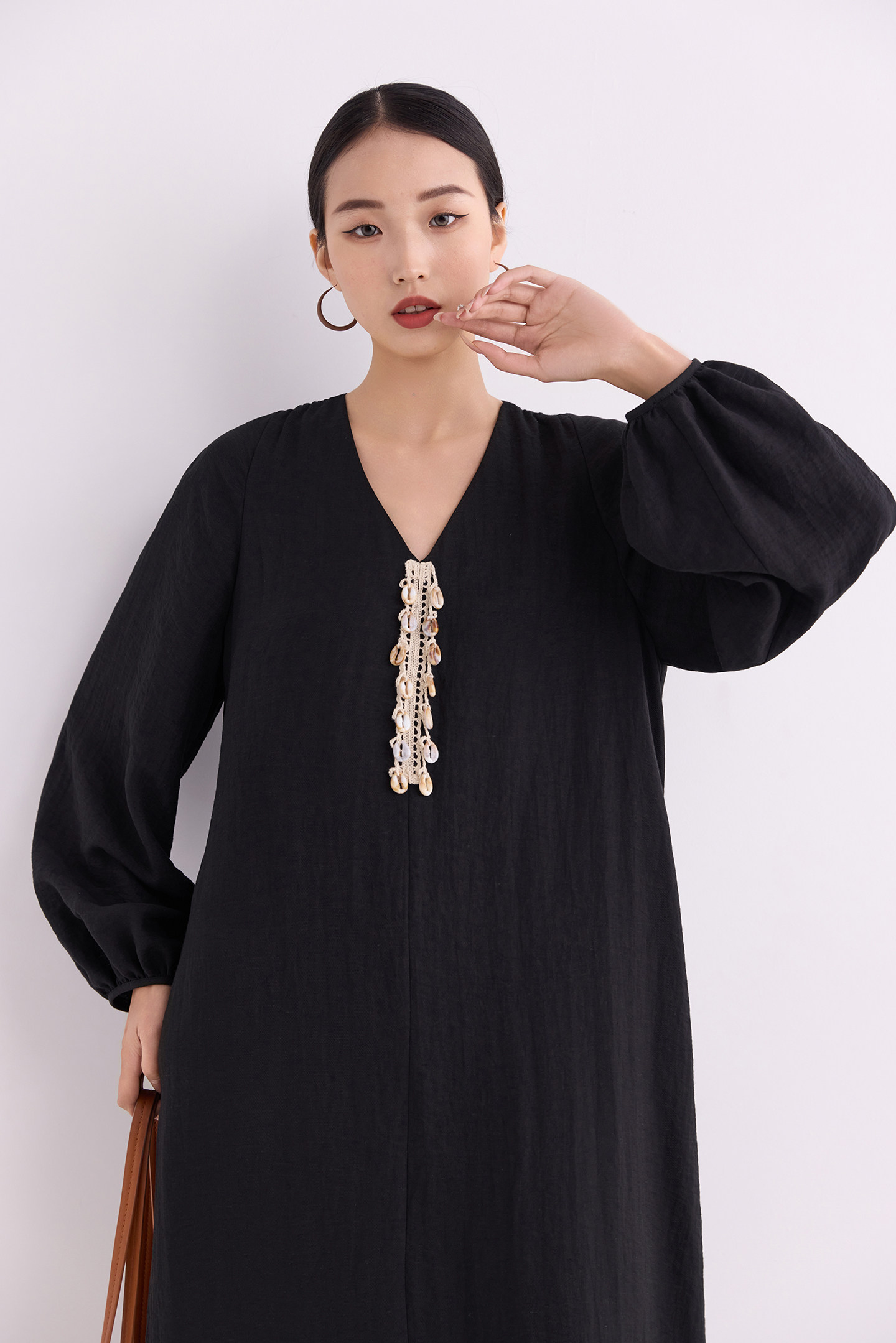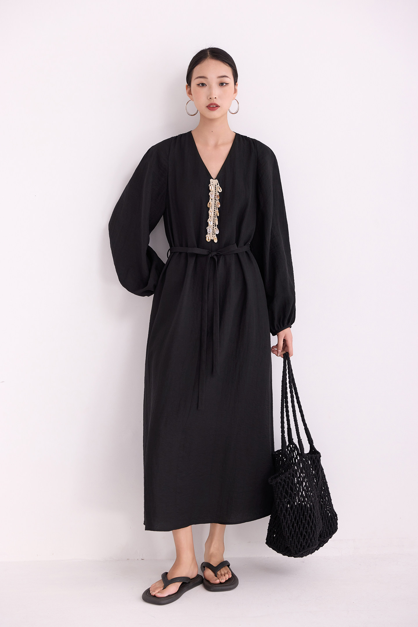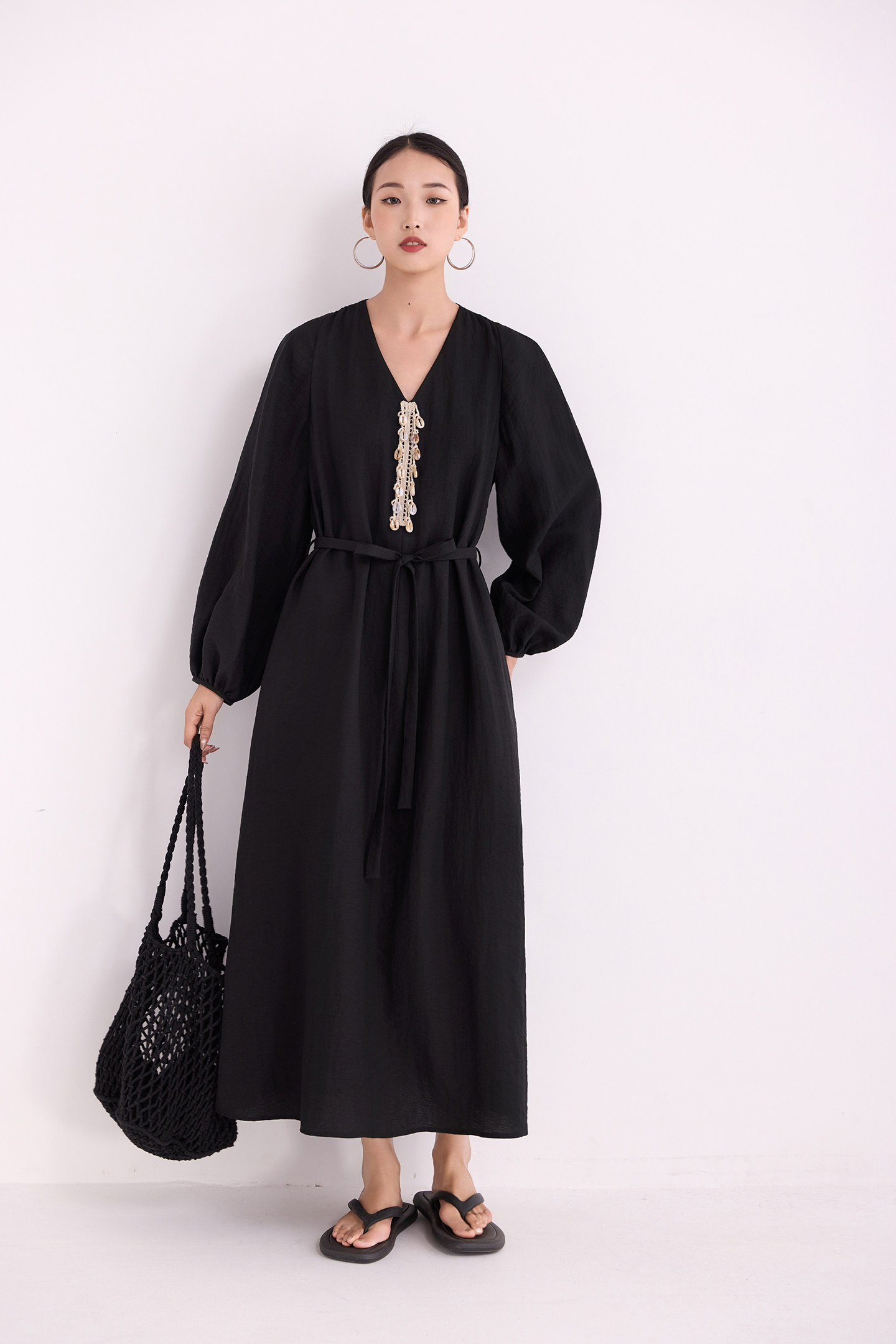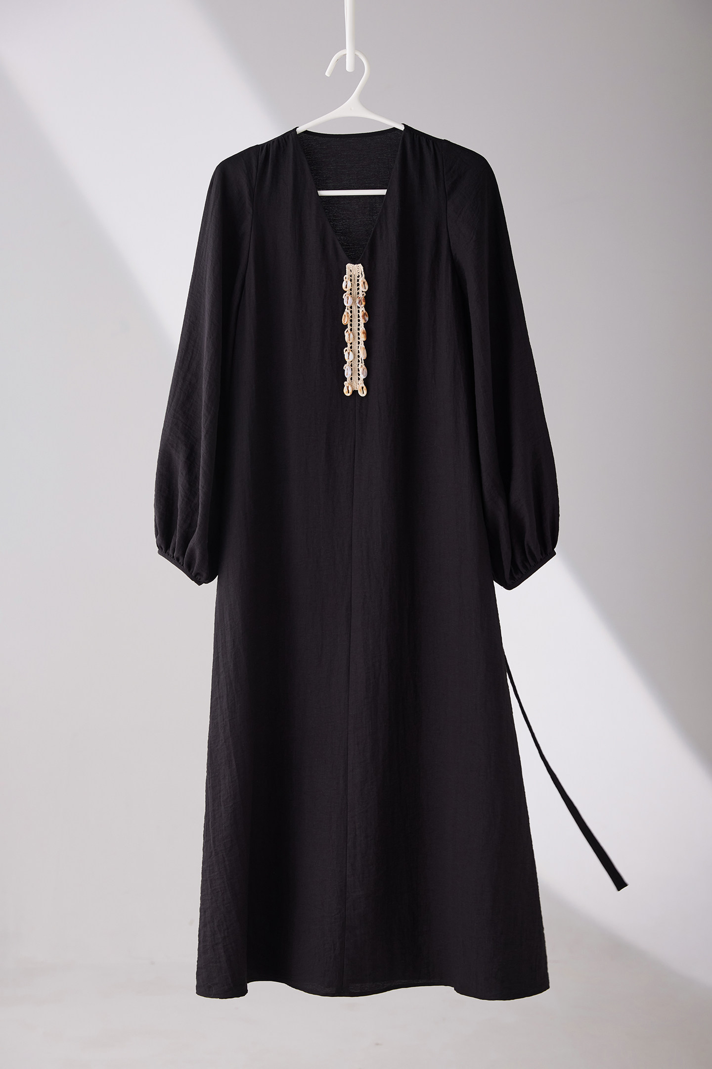 【ワンピース】ブラックVネック シェルボタン付き 長袖Aライン ロングドレス レトロ&リラックス感漂うデザイン【JZシリーズ】