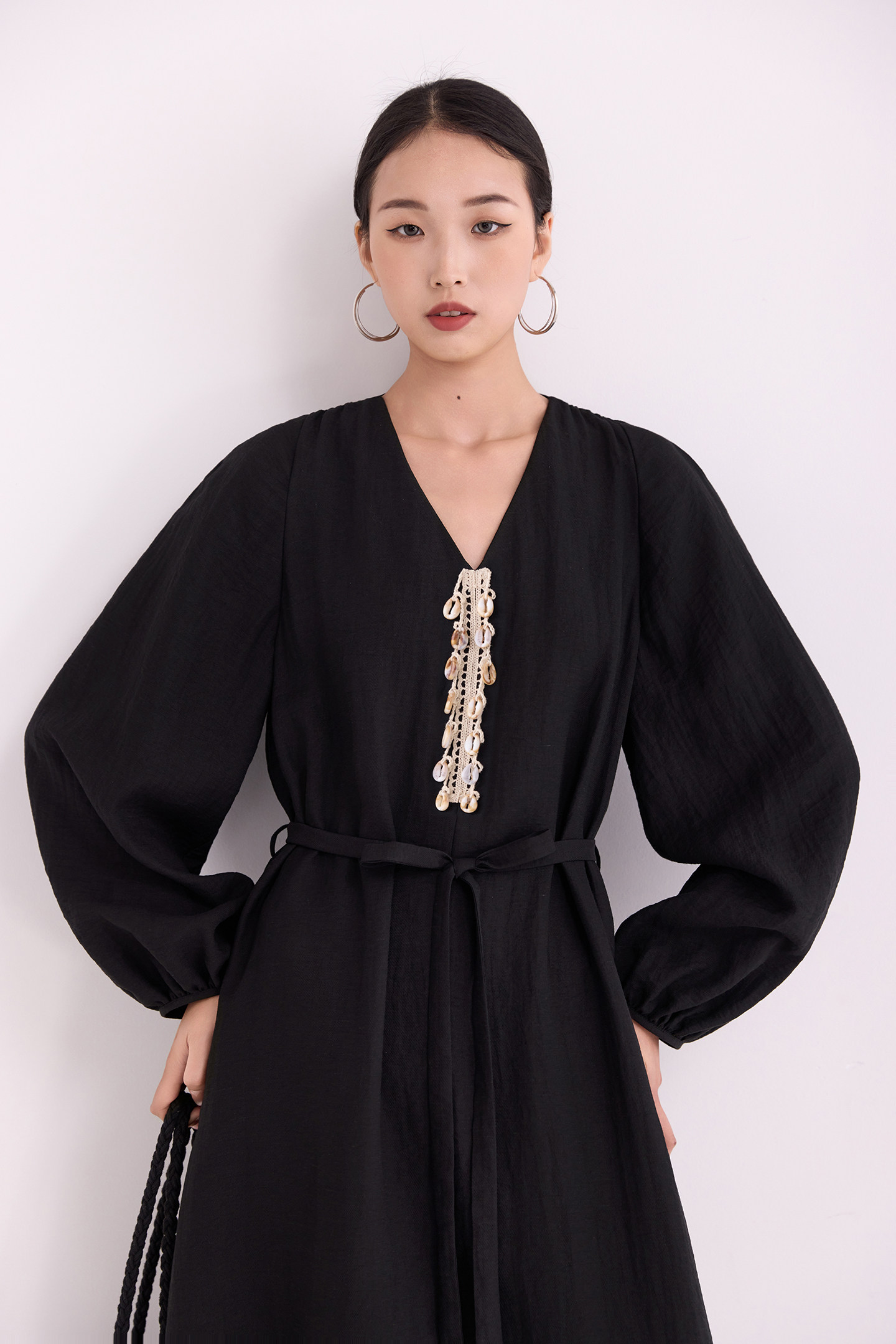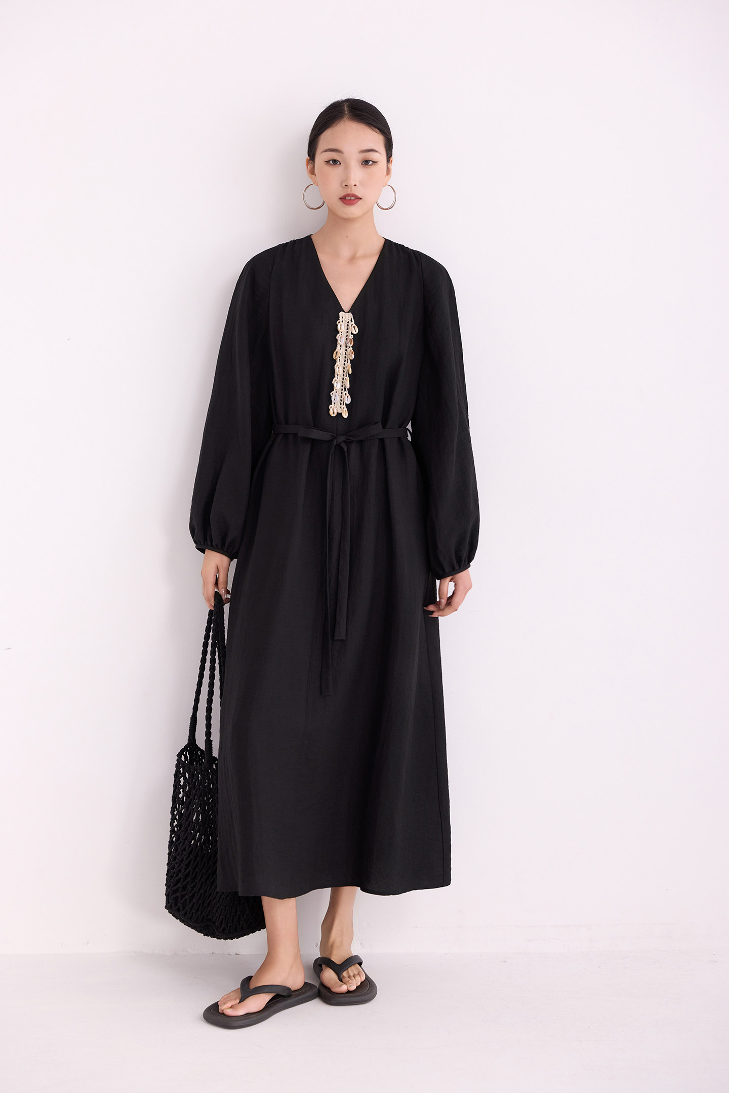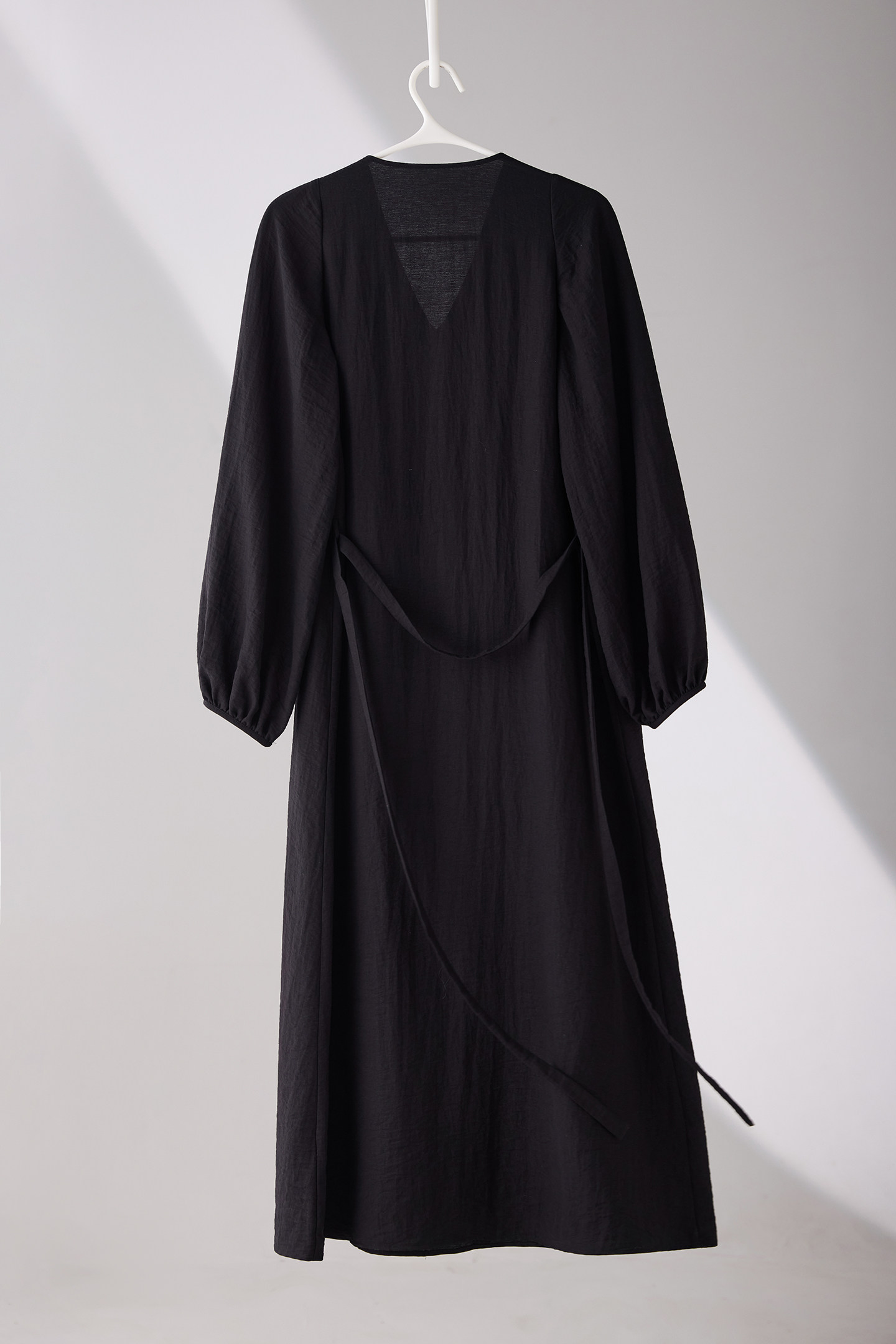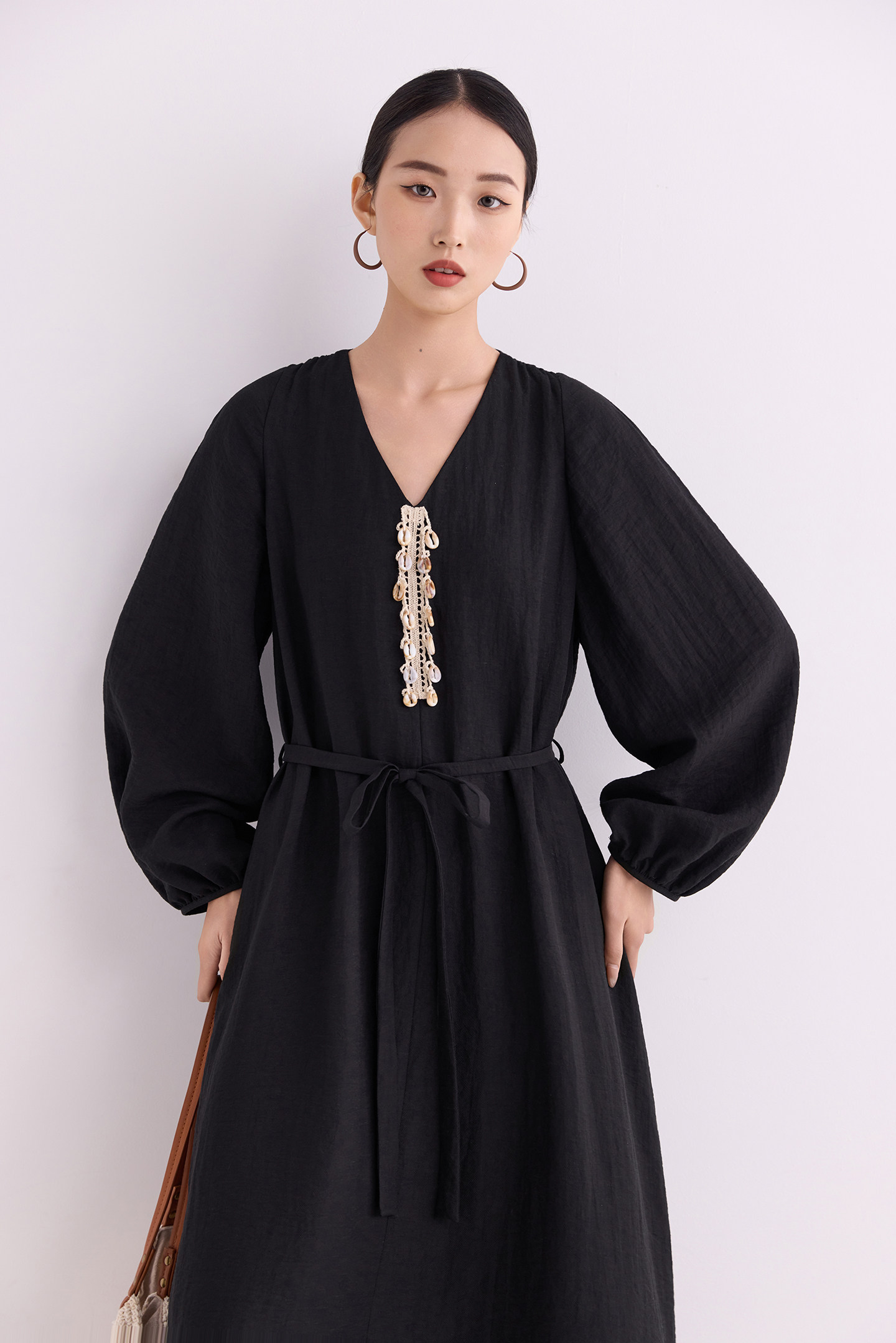 【ワンピース】ブラックVネック シェルボタン付き 長袖Aライン ロングドレス レトロ&リラックス感漂うデザイン【JZシリーズ】