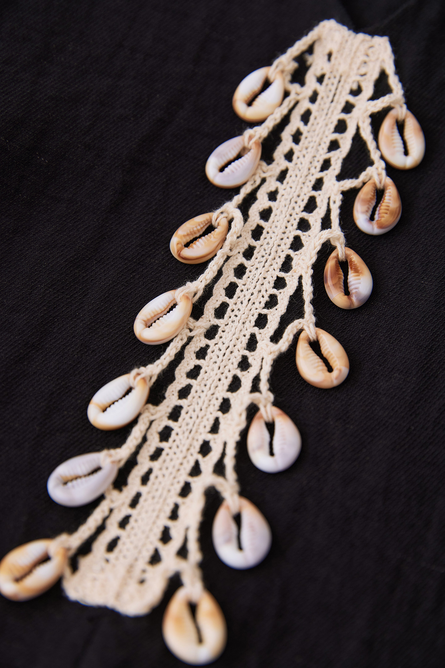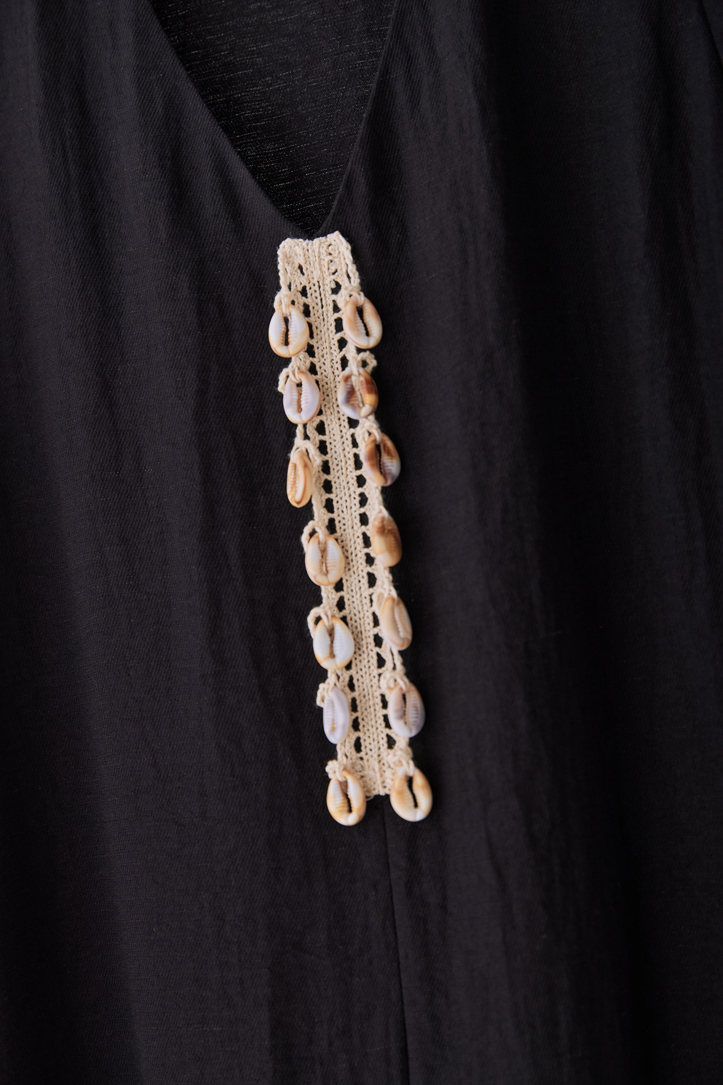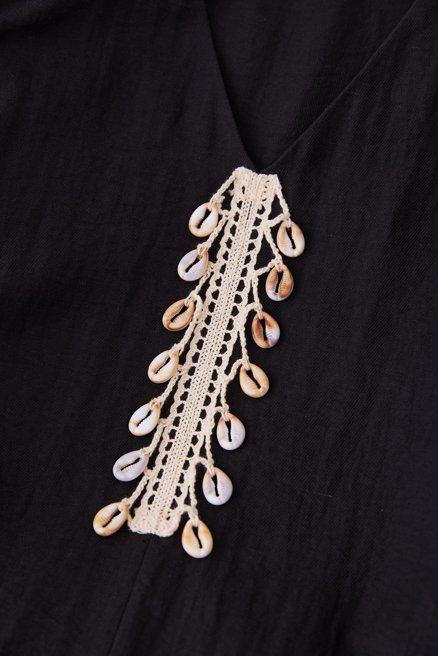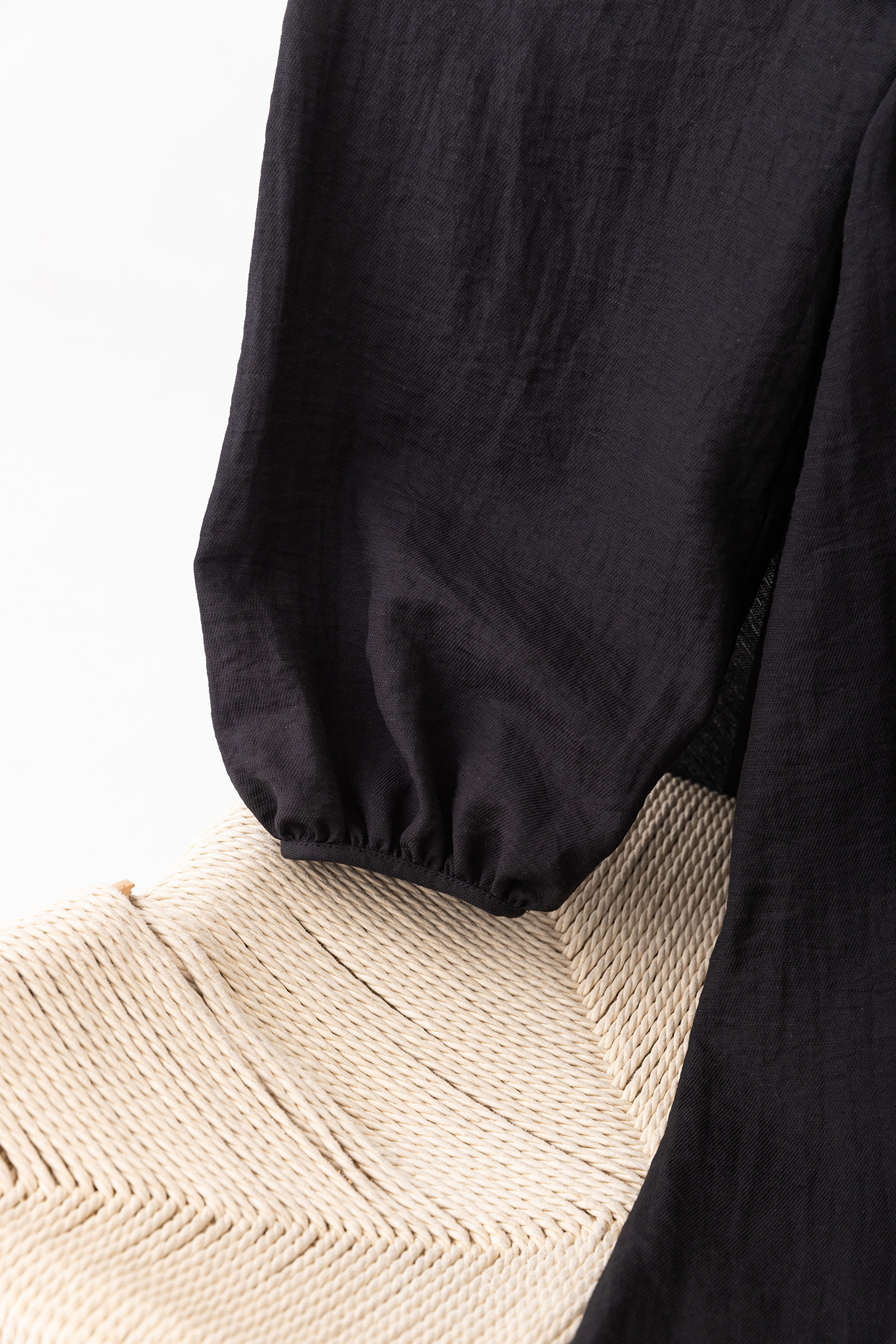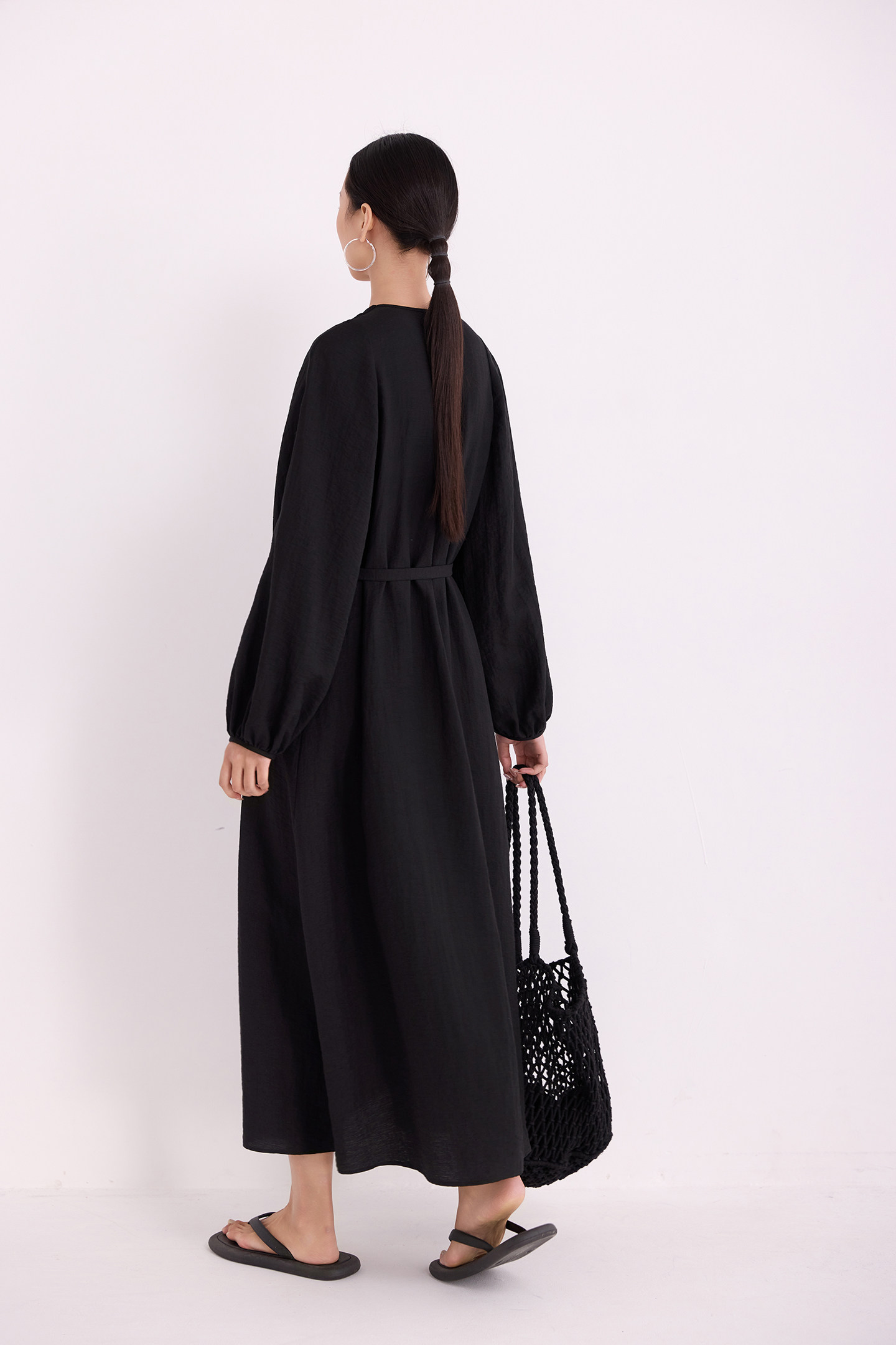 【ワンピース】ブラックVネック シェルボタン付き 長袖Aライン ロングドレス レトロ&リラックス感漂うデザイン【JZシリーズ】
