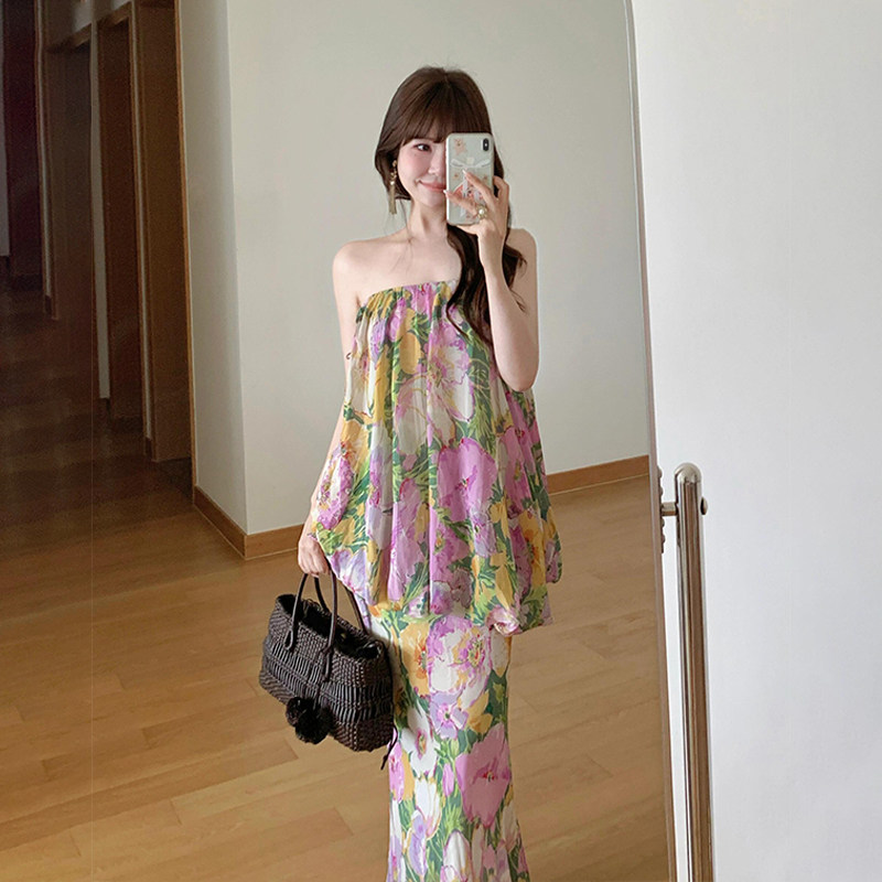 【ワンピース】【撮影用・映えドレス】花柄 オフショルダー ワンピース|レイヤード風 ベアトップ ロング丈 ノースリーブ|海辺 リゾート ビーチ【SHシリーズ】