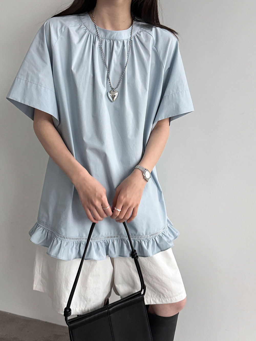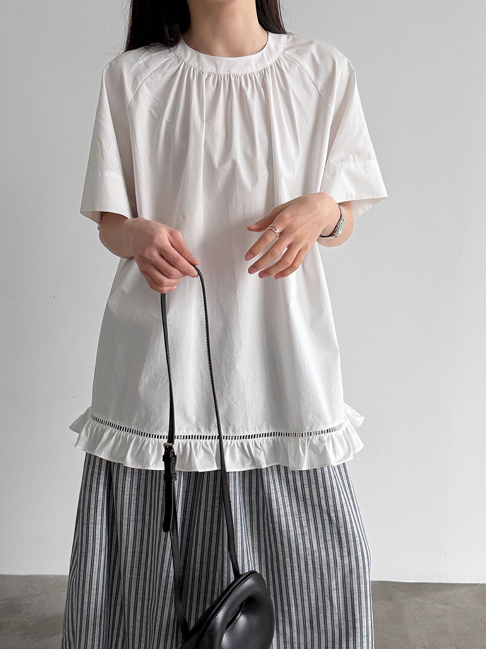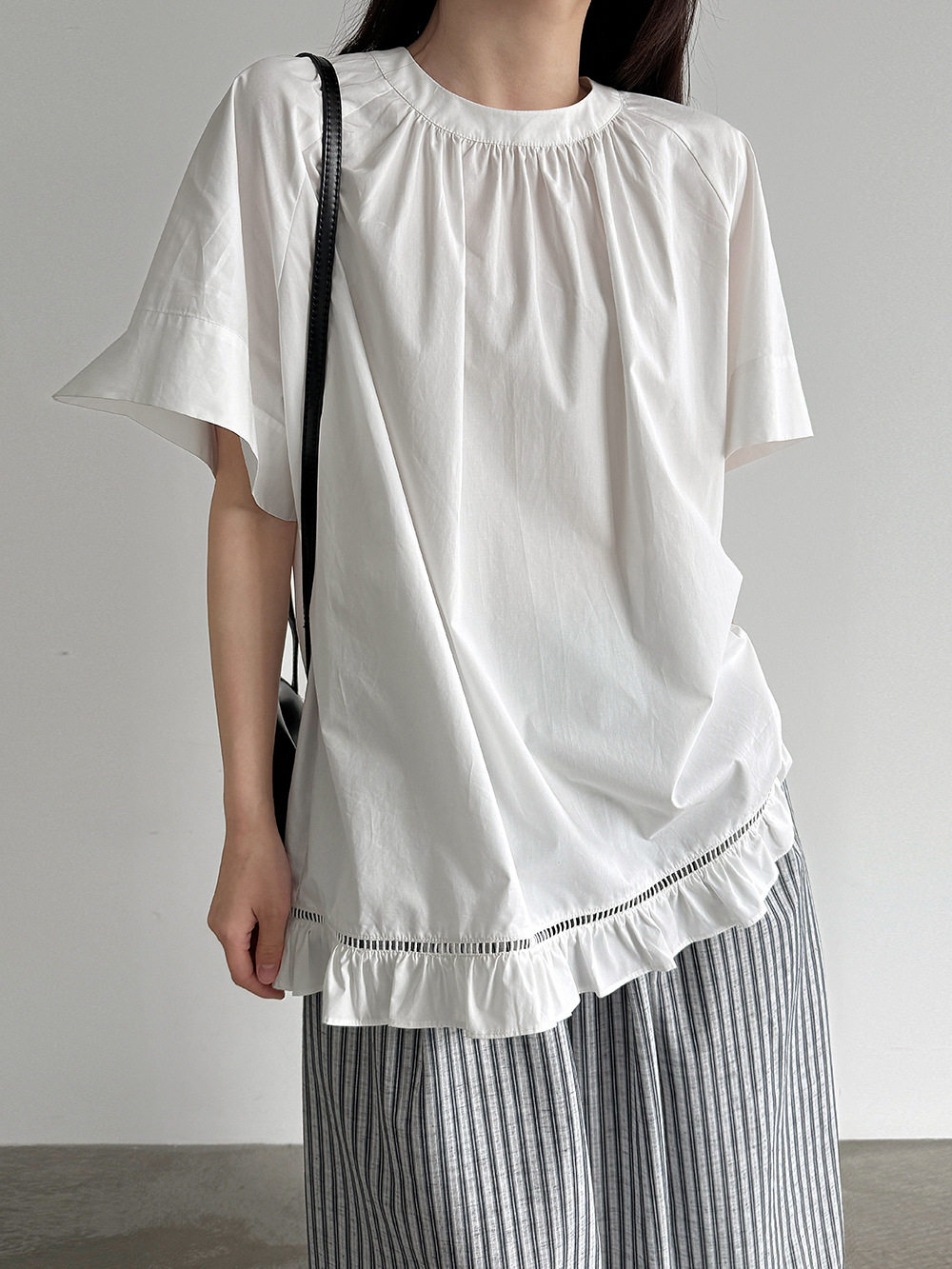 【トップス】韓国風 スモック風 ブラウス レディース 2026夏 ダーツデザイン レースフリル 透かし 通勤トップス ゆったり【JZシリーズ】